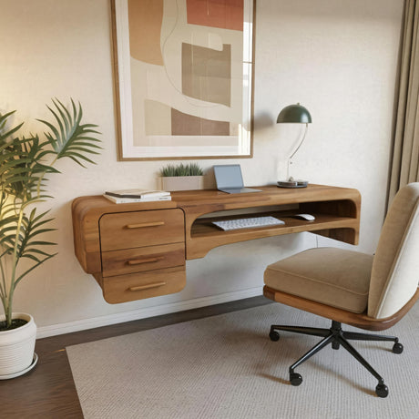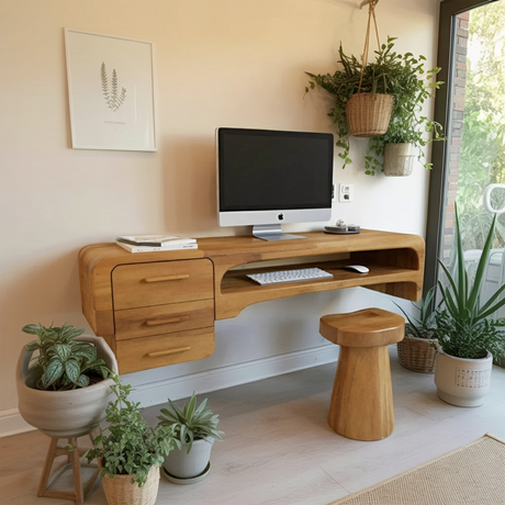Wood desks that double as artistic features are gaining popularity. With flowing shapes and unique textures, some even incorporate elements of abstract sculptures. These desks serve not just as workspaces but as conversation starters and focal points in a modern home office.