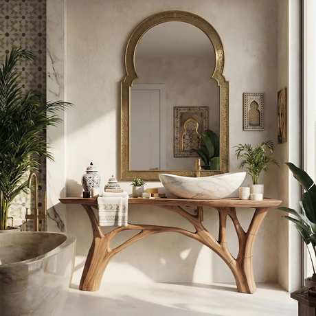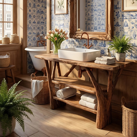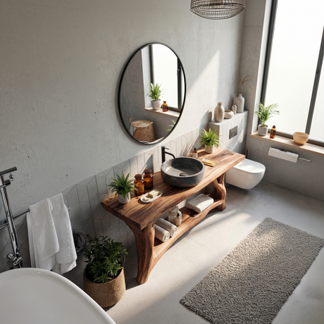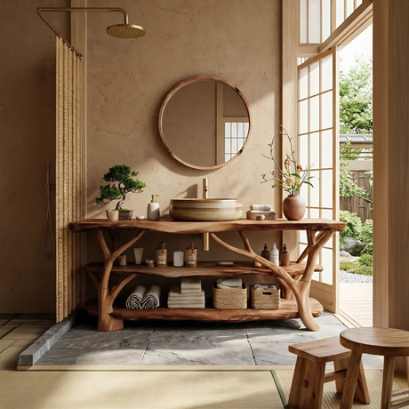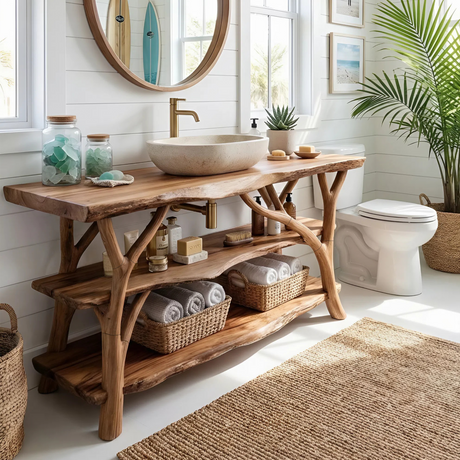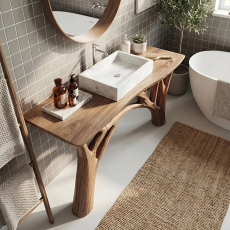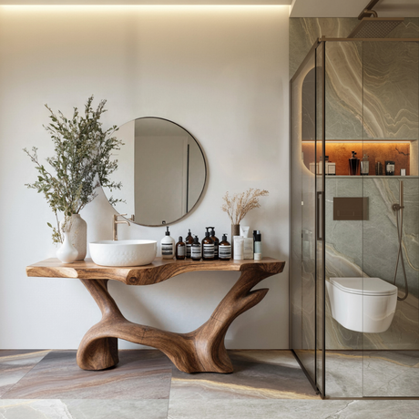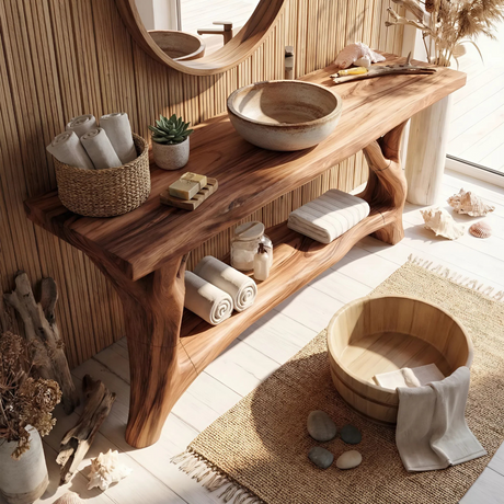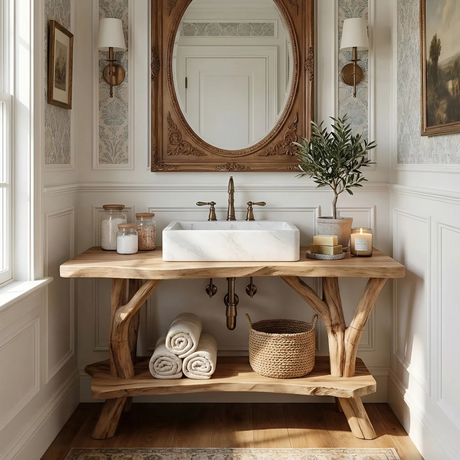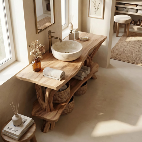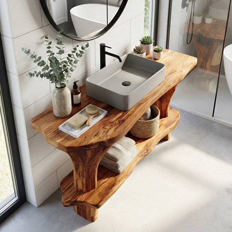 Today’s vanities are more than just sinks, they're functional storage hubs. Hidden drawers, open shelving, and built-in towel racks are being integrated into wooden vanities to help keep bathroom spaces clutter-free and stylish.