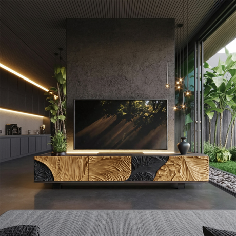ET Woodcrafts' designs blend tradition with innovation, ensuring that every wooden TV cabinet not only functions flawlessly but also enhances your living room with warmth and character.
