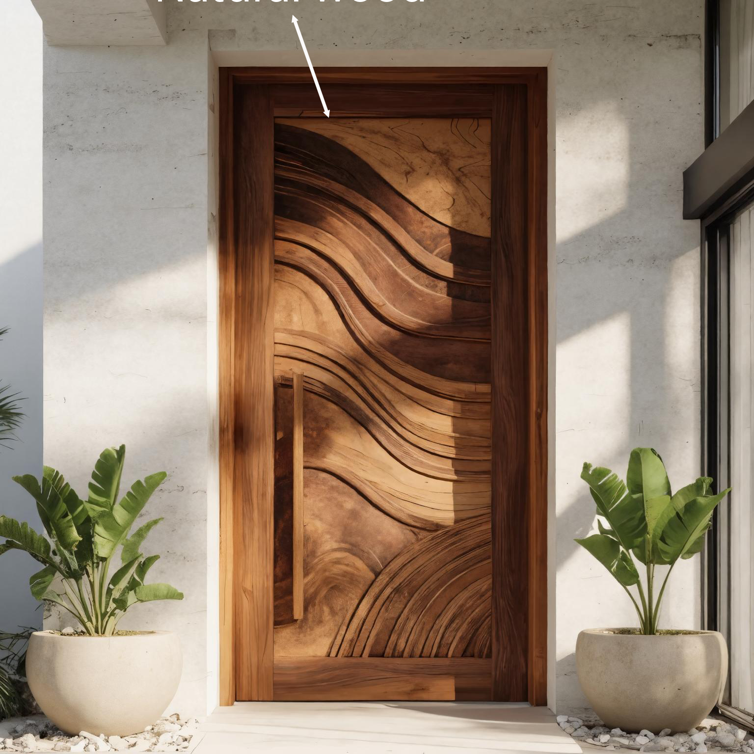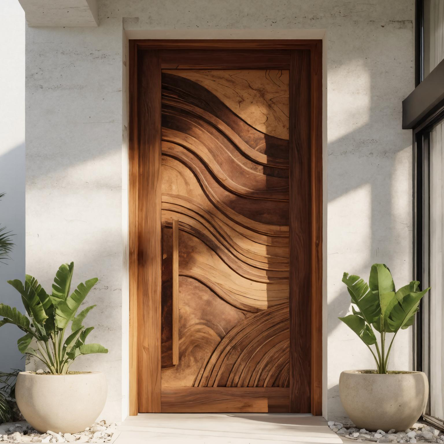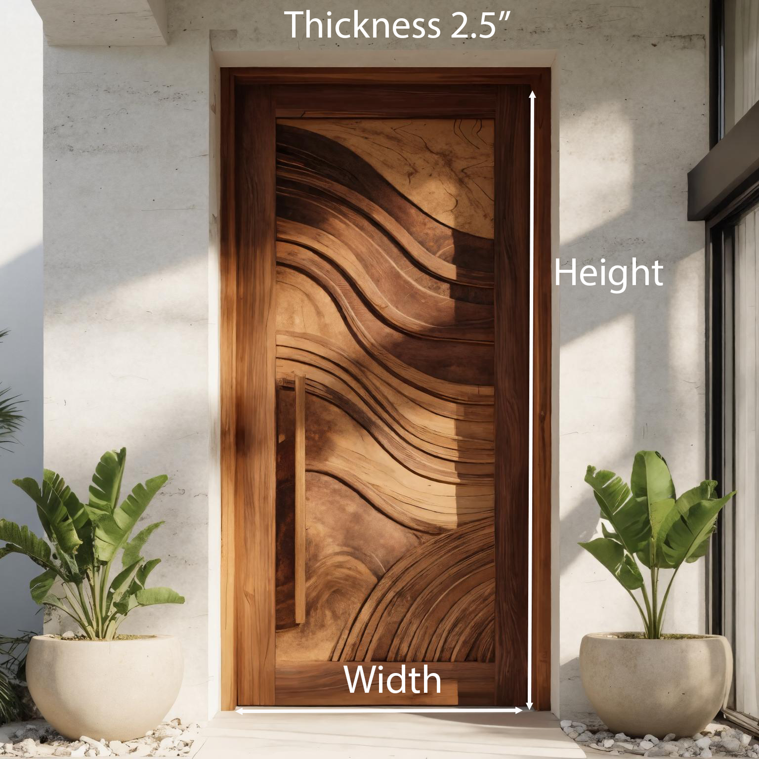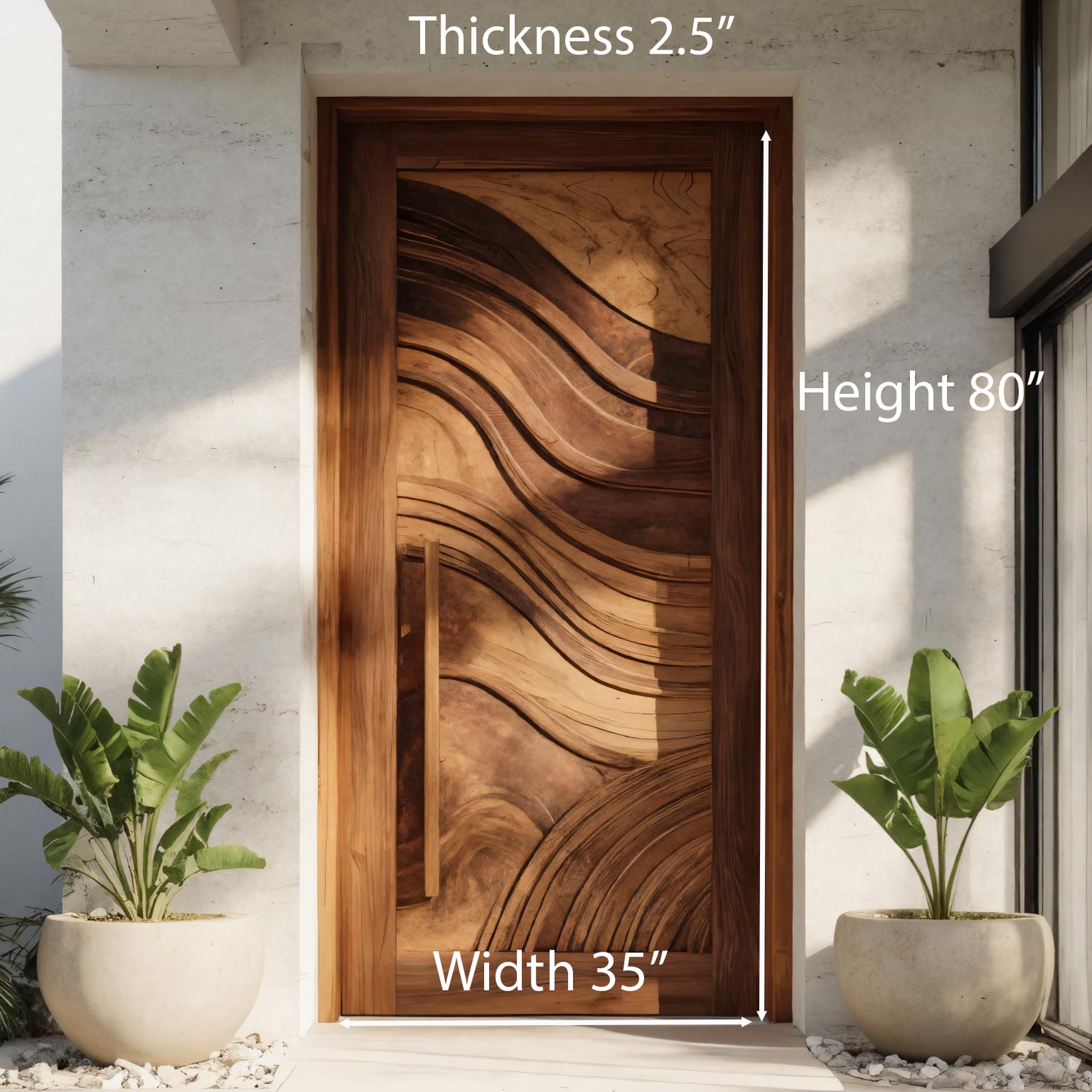 This door showcases a refined wave-inspired carving that flows gracefully across the surface, highlighting the interplay between light, shadow, and natural grain. Its clean framing and balanced proportions bring harmony to modern architectural spaces, offering a sophisticated focal point that feels both grounded and dynamic.