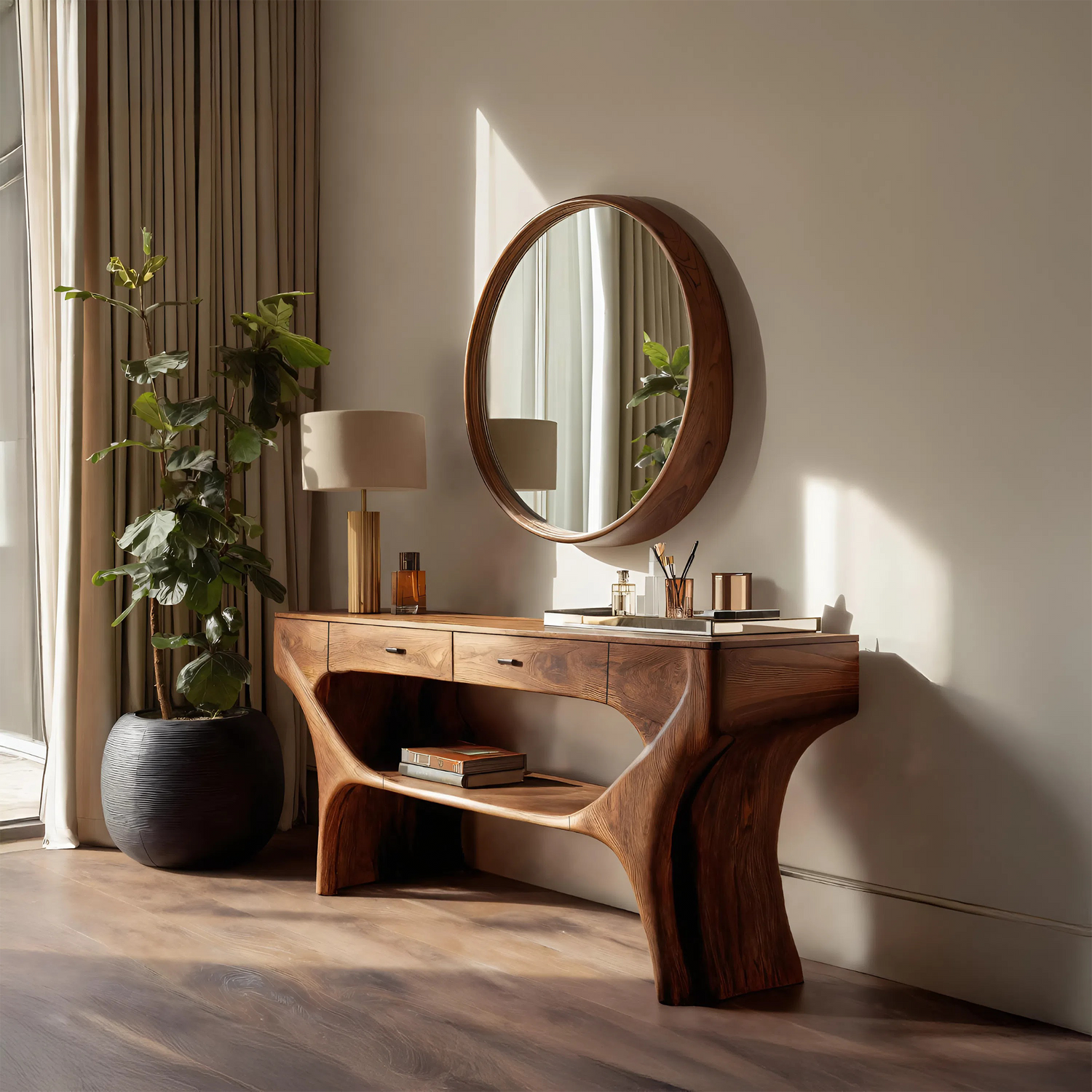 Bring a refined artistic touch to your interiors with our Artistic Handmade Vanity Table With Drawers For Bedroom, thoughtfully designed to balance sculptural beauty with functional storage. This vanity elevates your personal space with its organic form and warm natural presence.