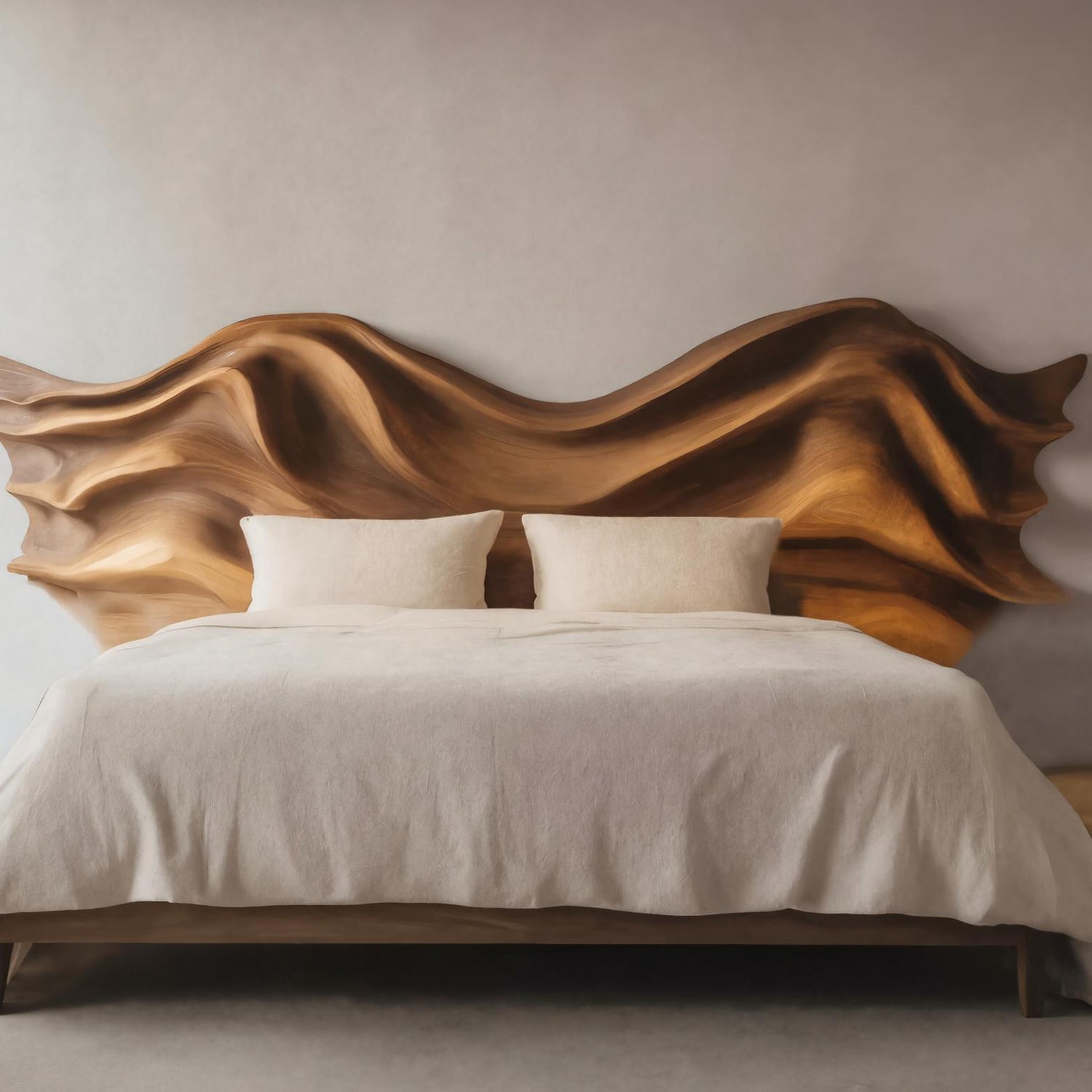 This headboard is hand-carved with organic curves and dynamic wave patterns, transforming natural wood into a piece of art. The bold silhouette adds depth and sophistication, while its presence establishes the bed as the focal point of the room.