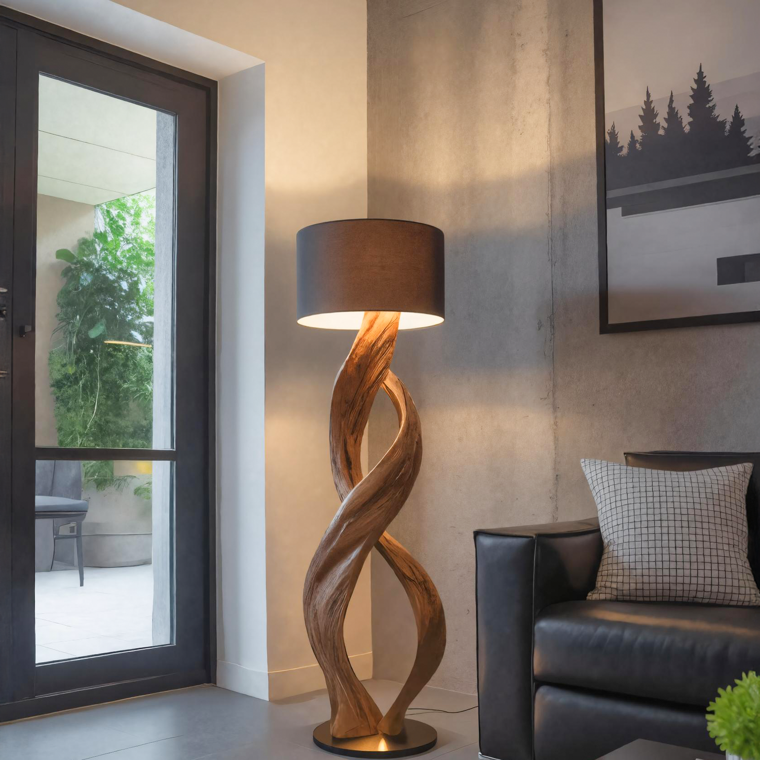 This floor lamp features a twisted wooden base that rises gracefully, forming a dynamic silhouette reminiscent of flowing lines in nature. The sculptural structure pairs with a simple lampshade to balance artistry and functionality, casting warm light that enhances living rooms, lounges, or creative spaces.
