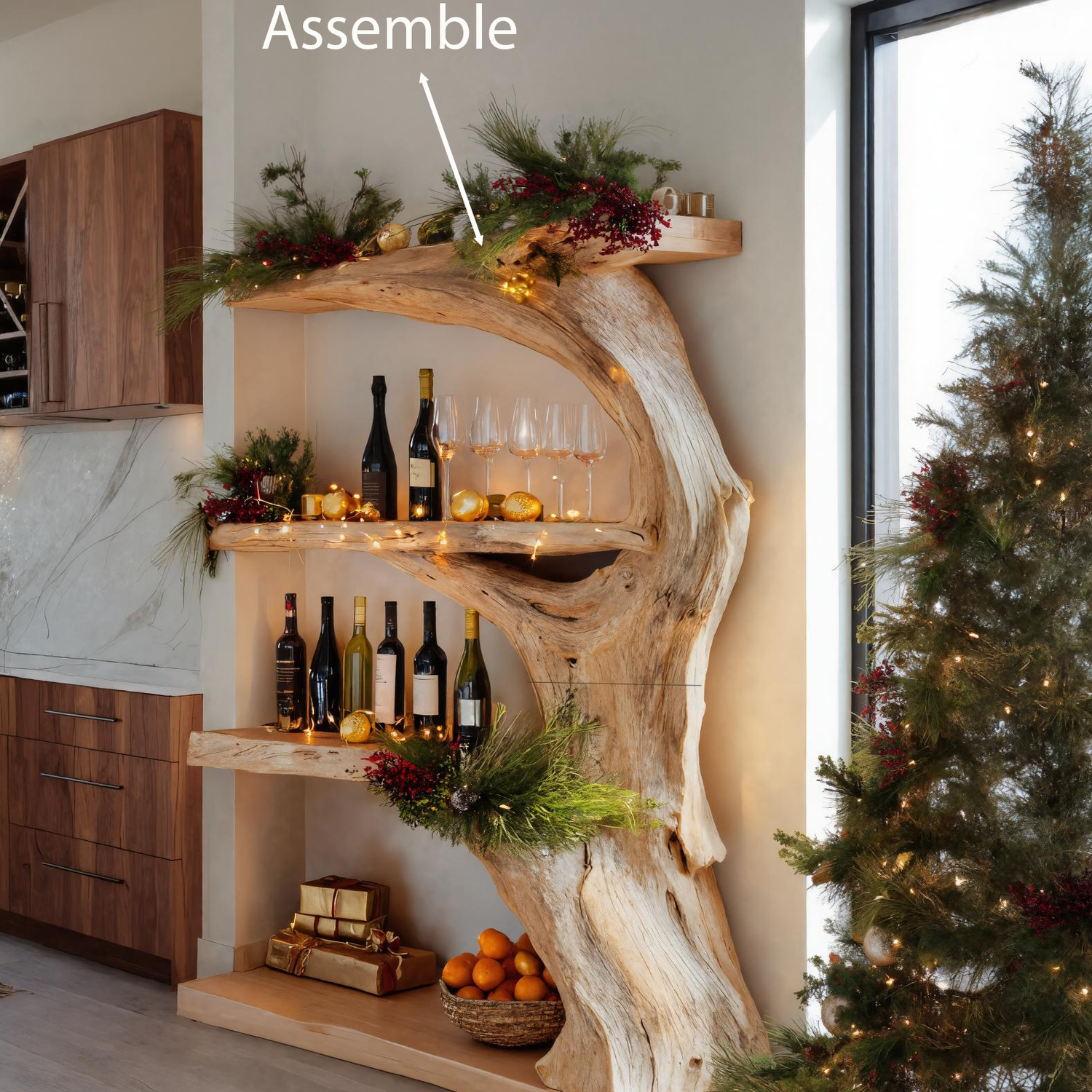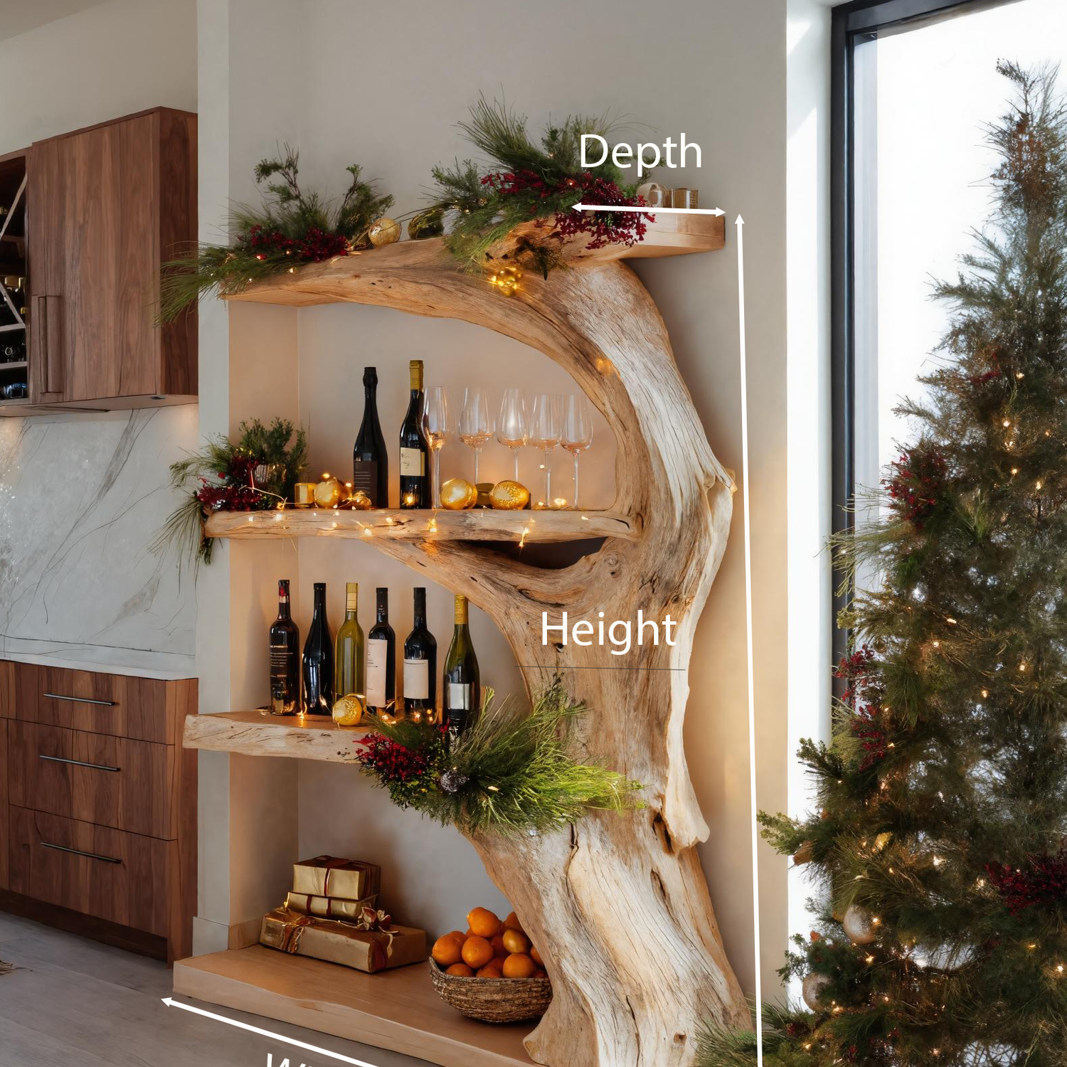 Bring organic warmth and sculptural charm into your home with our Rustic Live Edge Shelf for Living Room or Holiday, a statement piece that celebrates the natural flow of wood. Its bold, curving form and tiered design create a captivating focal point, perfect for festive décor or year-round display.