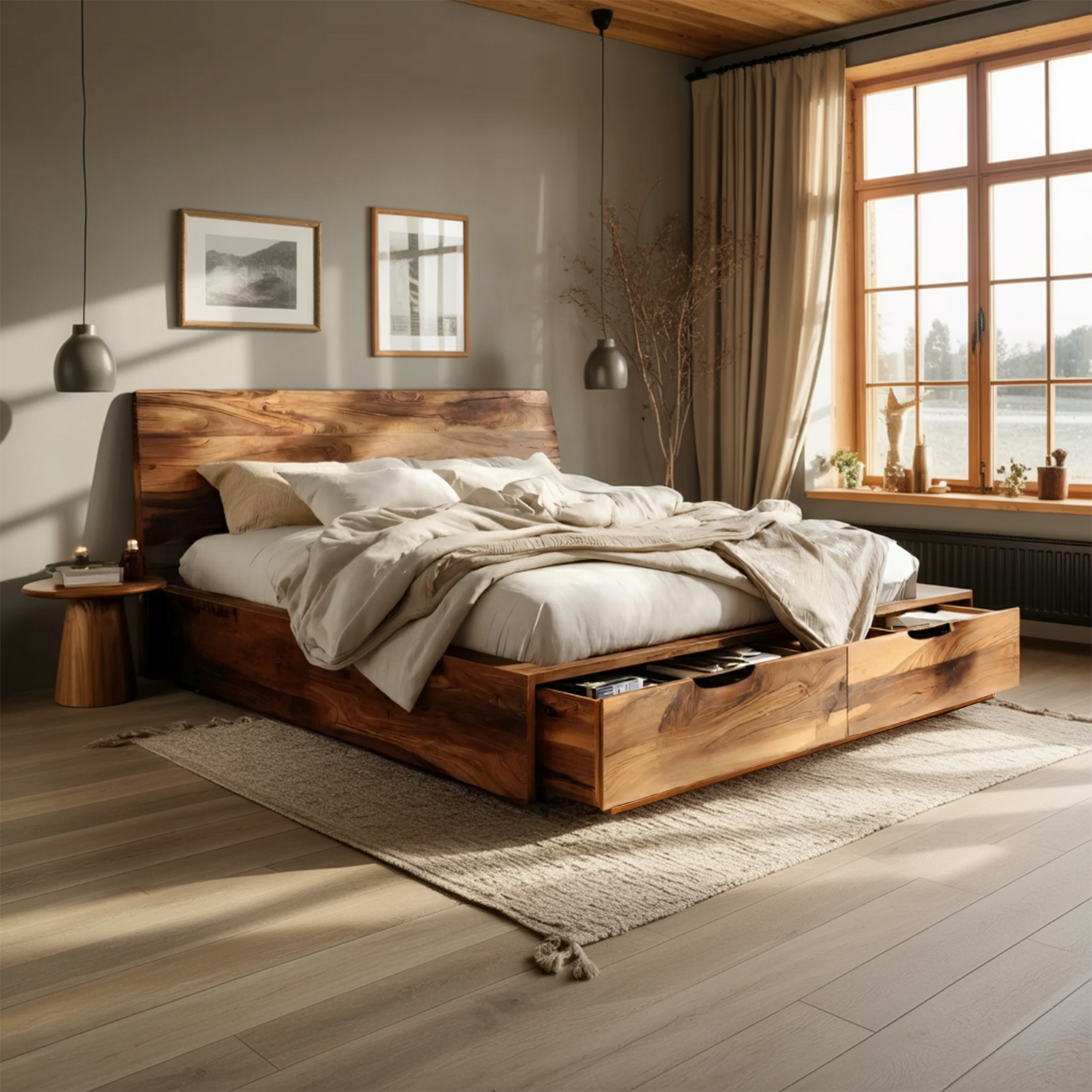 This bed features a streamlined frame with a horizontally grained headboard that highlights the organic character of the wood. Built-in drawers are seamlessly incorporated into the base, maintaining a balanced and uncluttered look. The low-profile structure enhances the sense of openness while allowing the natural material to remain the focal point.