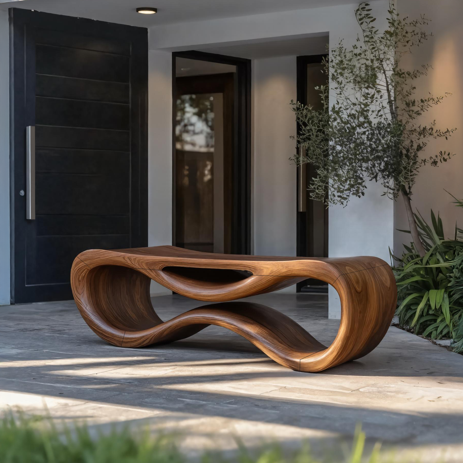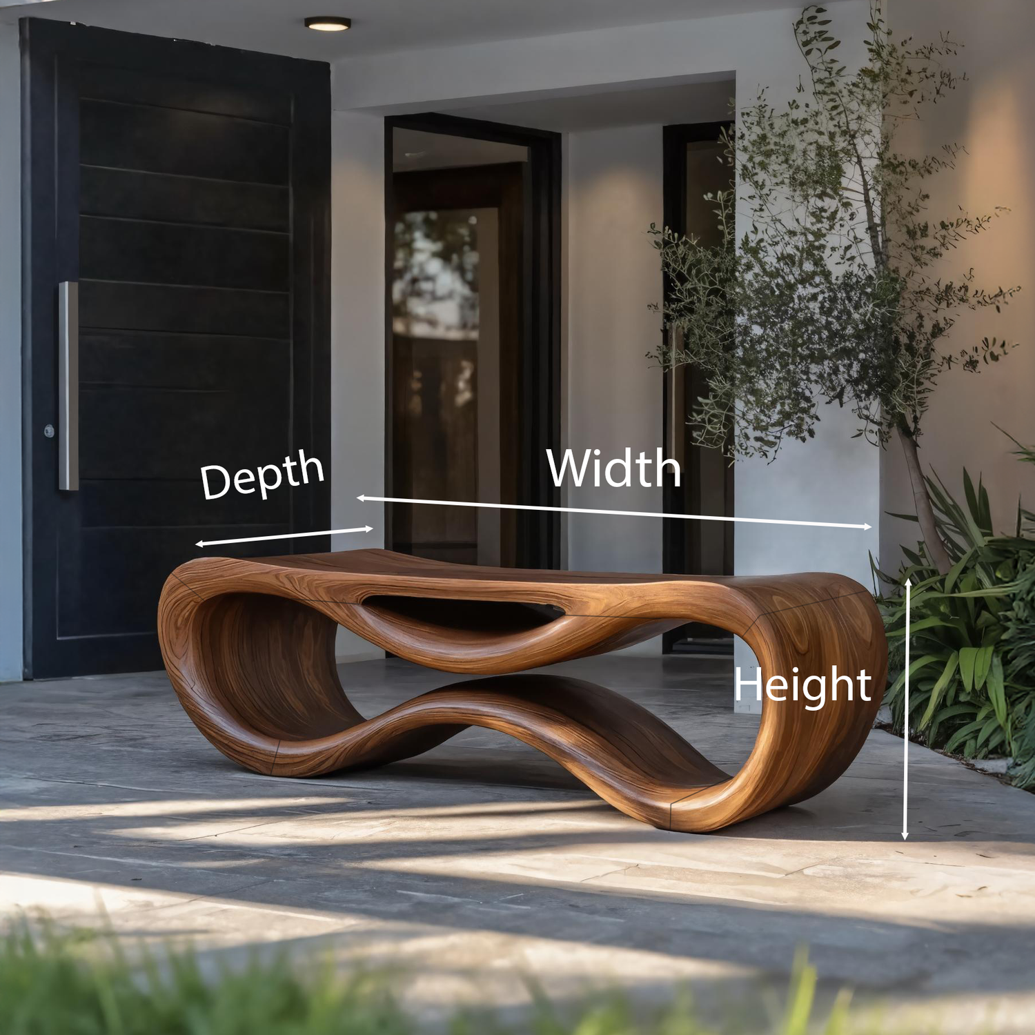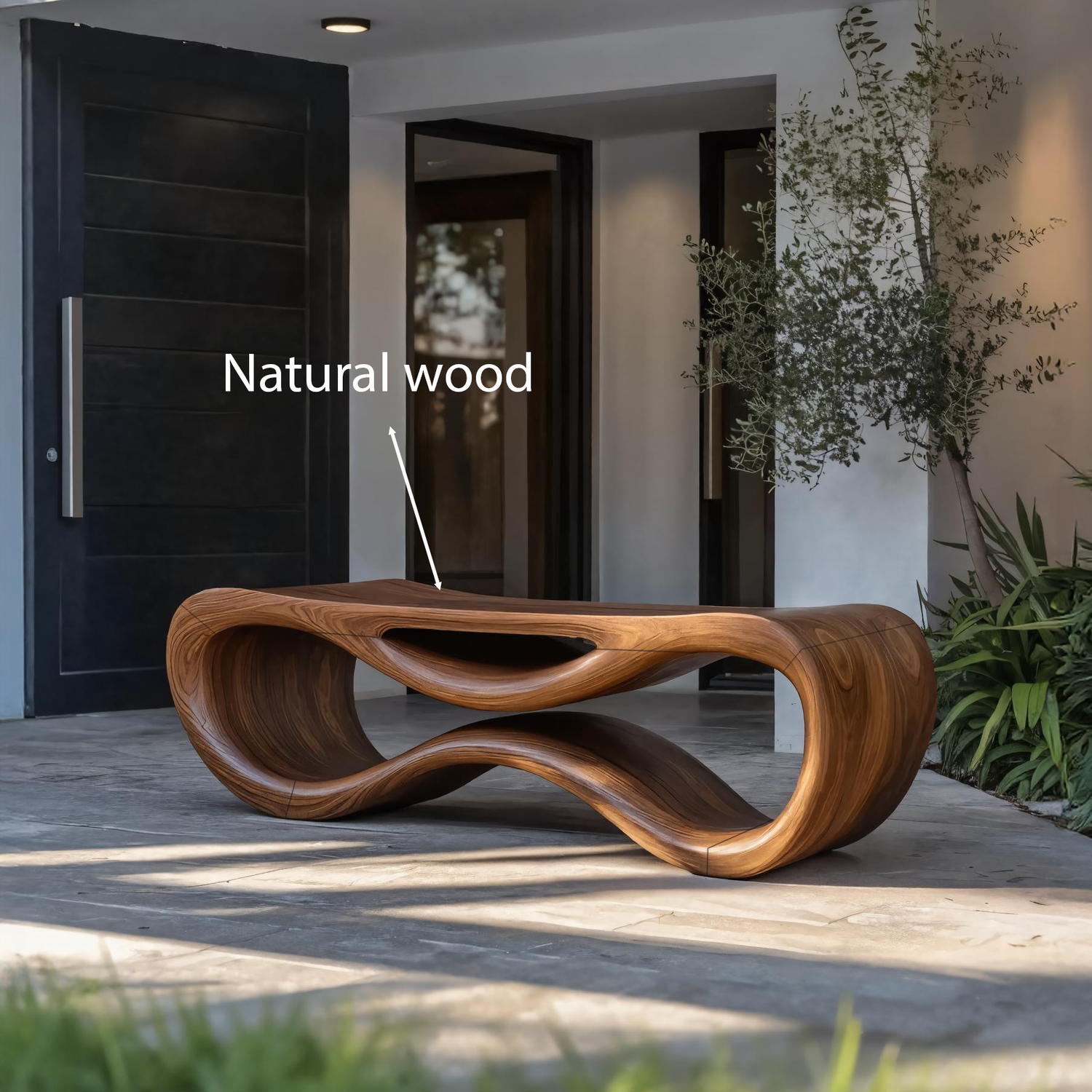 This bench features a continuous, double-layered silhouette shaped with gentle curves and hollow contours that evoke the natural flow of wind and water. Crafted from solid wood, it combines architectural presence with organic fluidity. Its sculptural structure invites light and shadow to dance across its surface, making it an eye-catching accent for patios, gardens, or terraces.