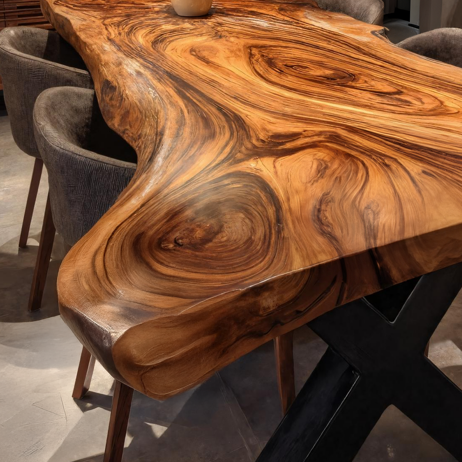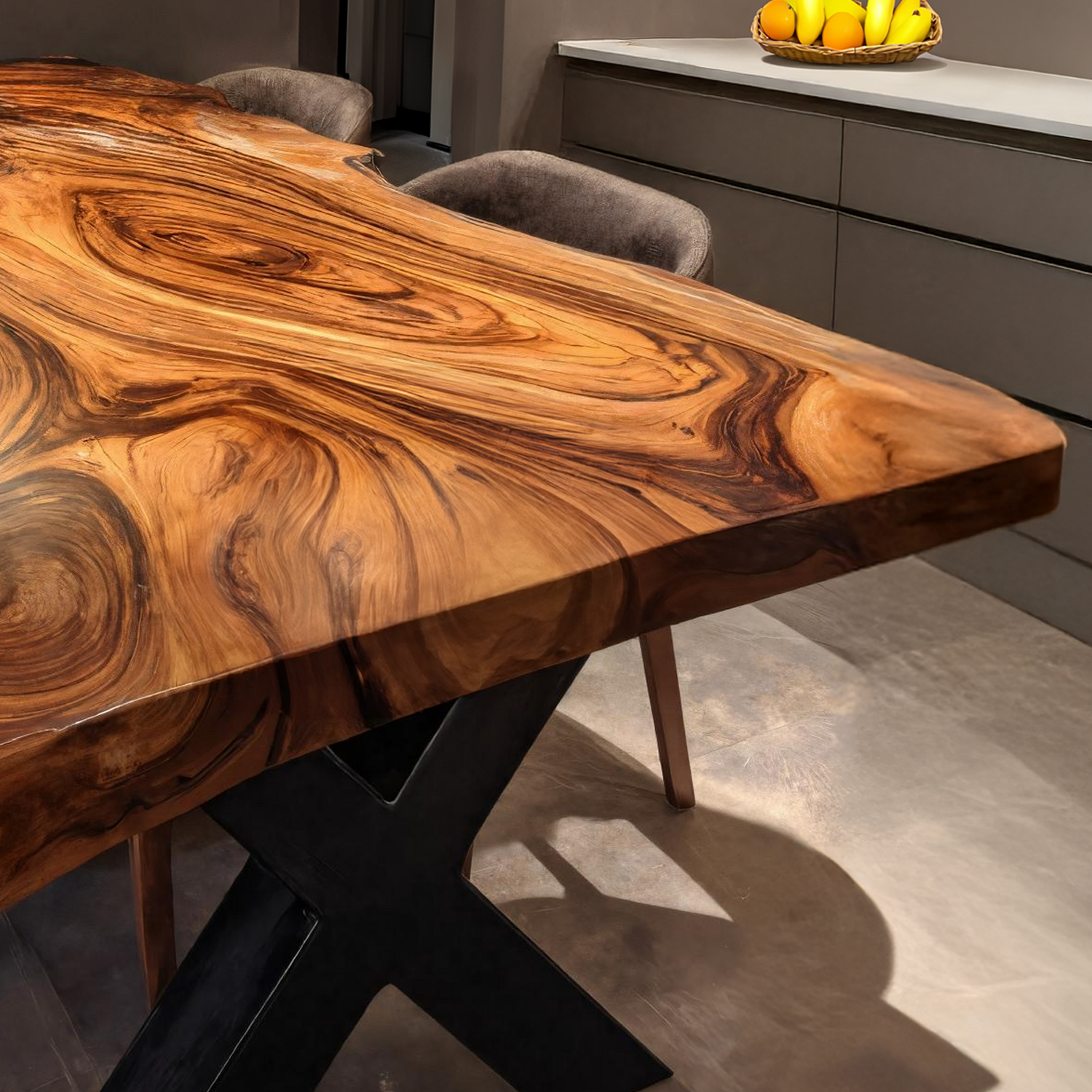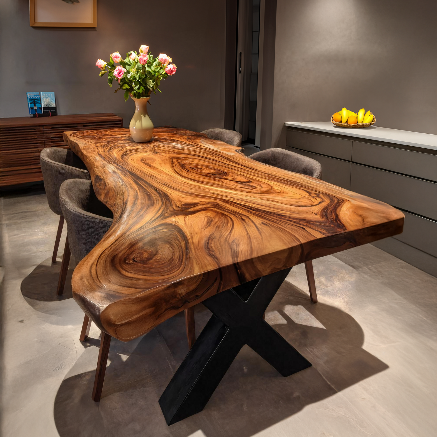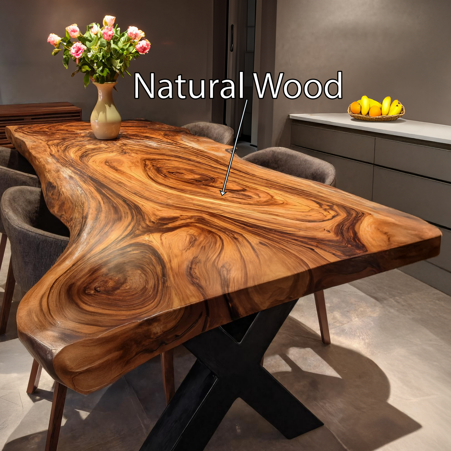 Crafted from kiln-dried hardwood, each tabletop showcases unique grain patterns, tonal variations, and natural markings. The table offers both durability and tactile warmth. Matching solid wood legs further reinforce structural integrity and visual harmony.