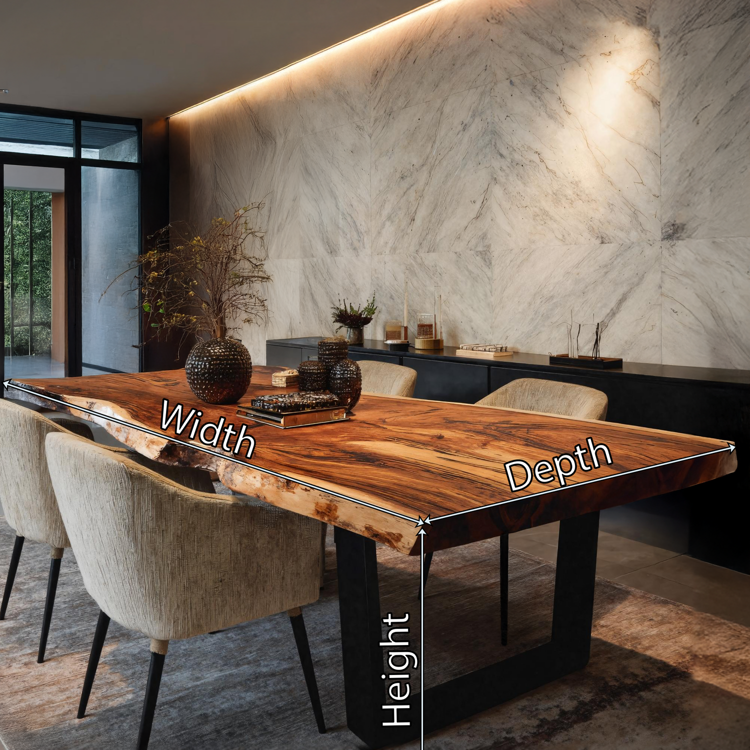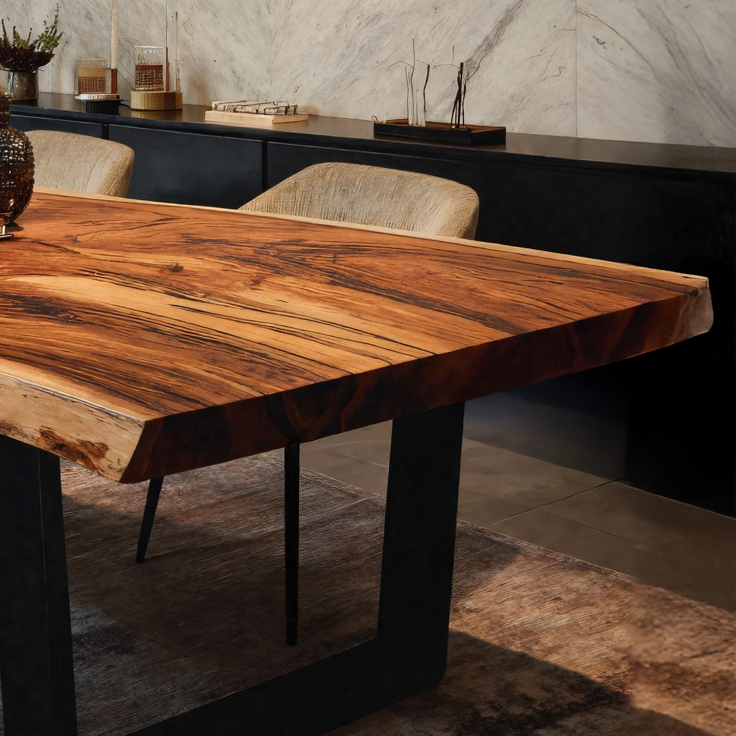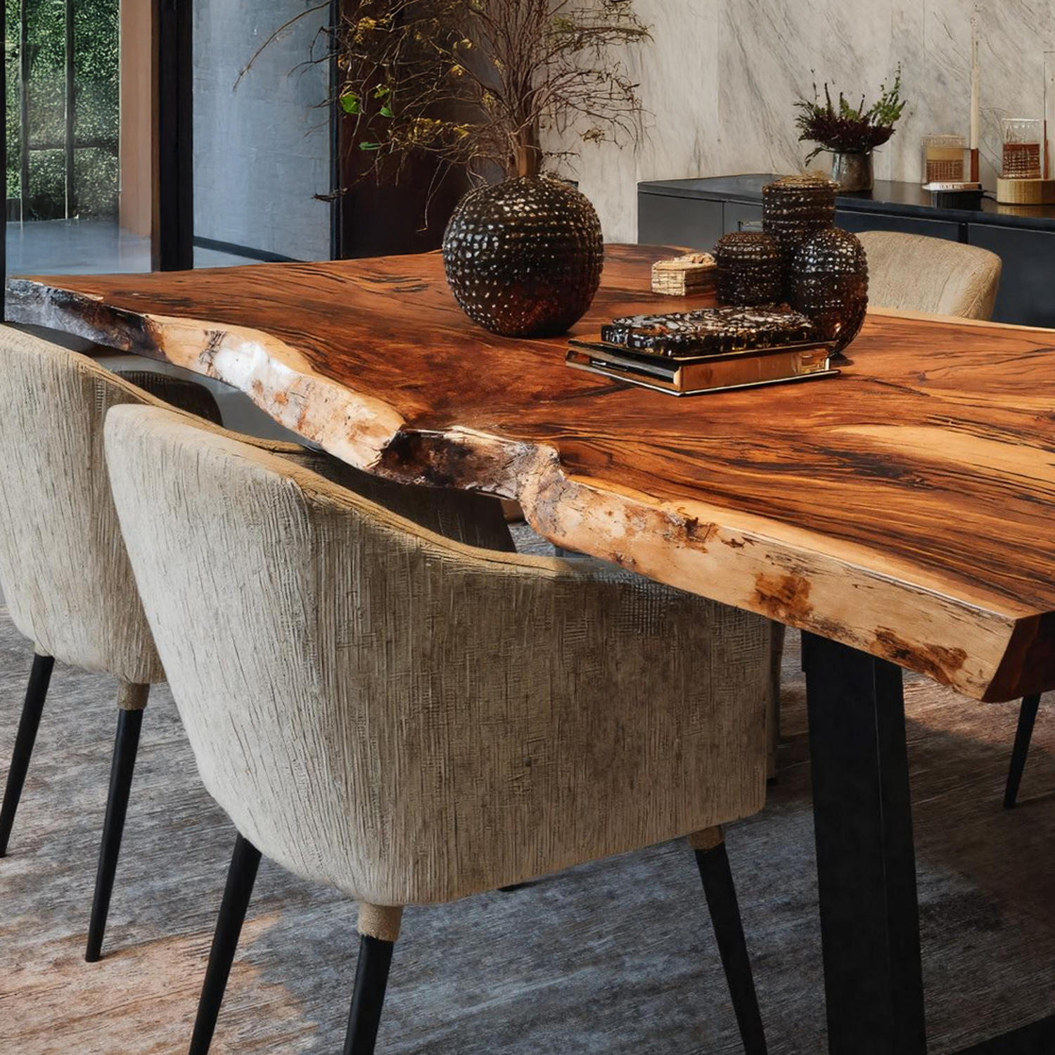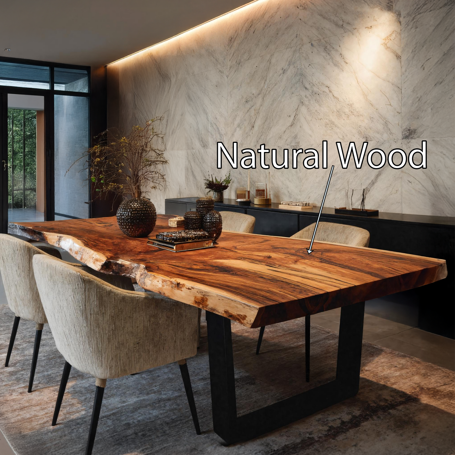 Crafted from kiln-dried hardwood, each tabletop showcases unique grain patterns, tonal variations, and natural markings. The table offers both durability and tactile warmth. Matching solid wood legs further reinforce structural integrity and visual harmony.