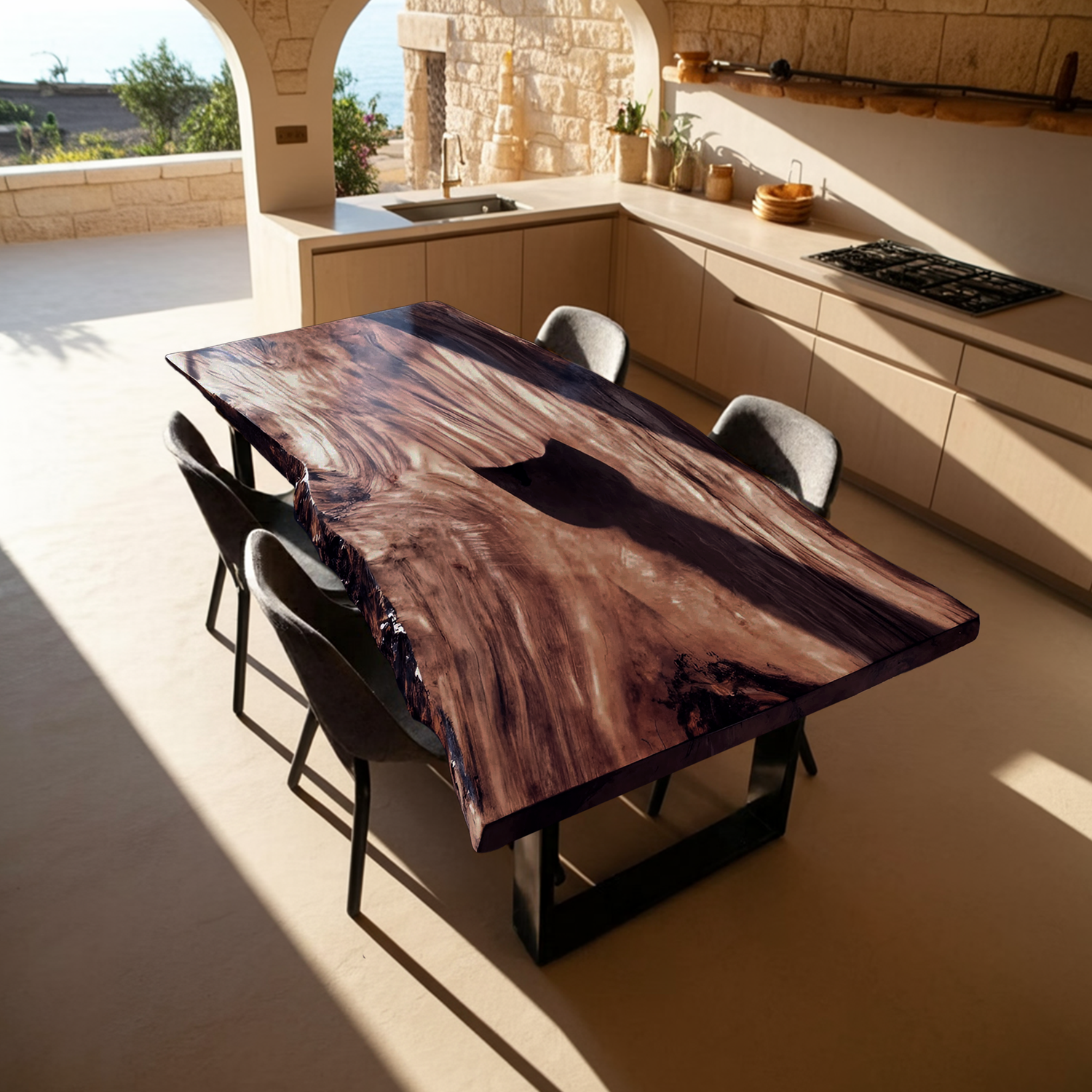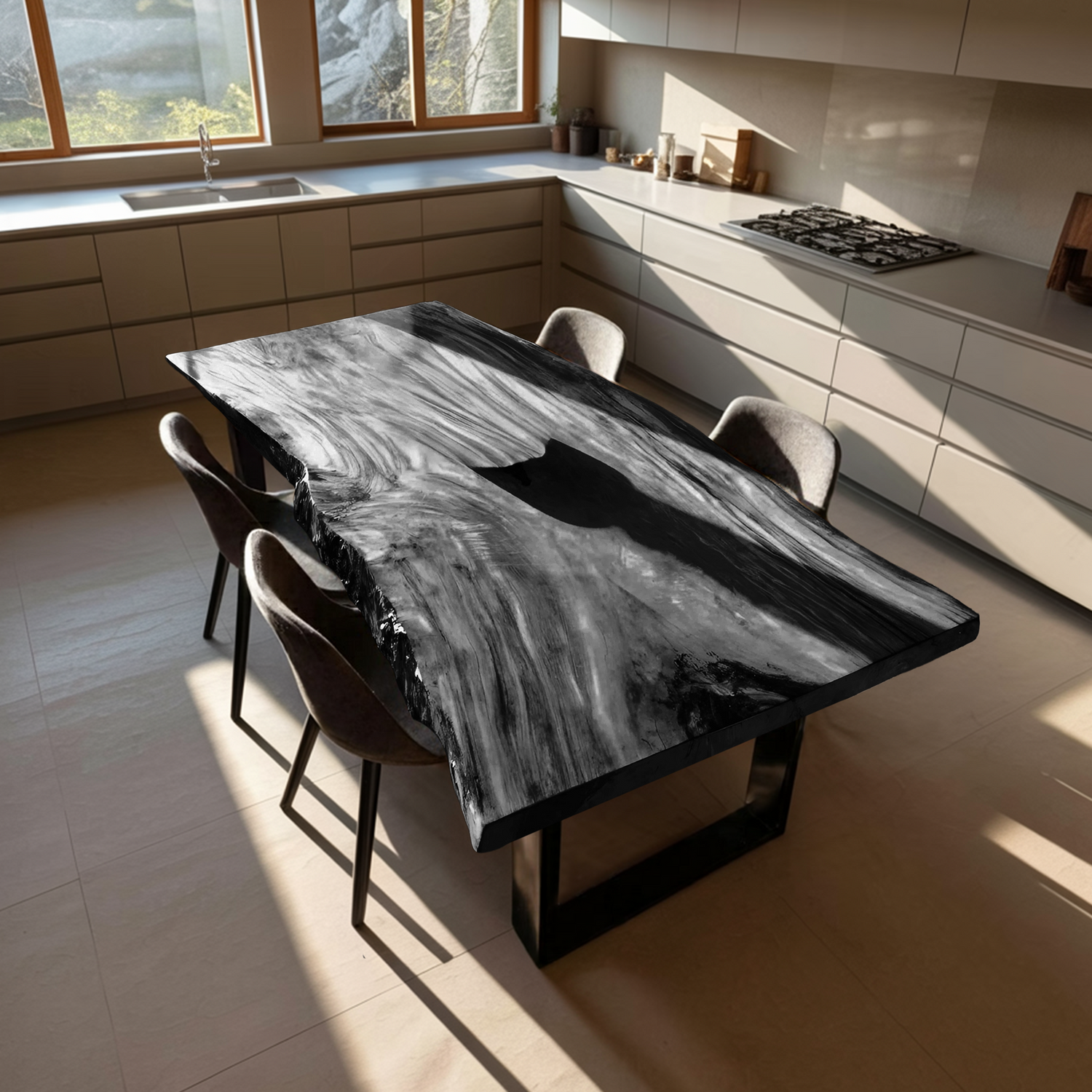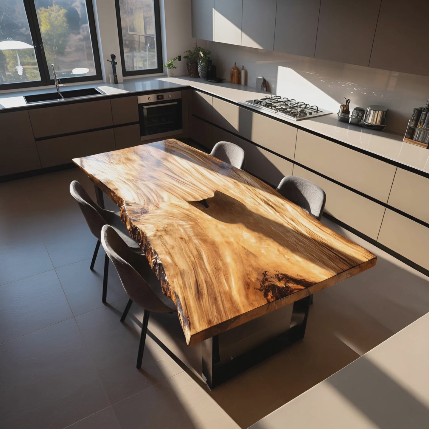 Crafted from kiln-dried hardwood, each tabletop showcases unique grain patterns, tonal variations, and natural markings. The table offers both durability and tactile warmth. Matching solid wood legs further reinforce structural integrity and visual harmony.