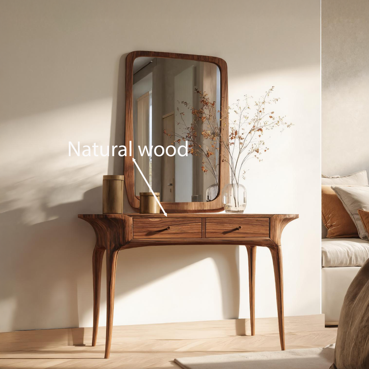 This vanity table features slender legs and smooth flowing contours, offering a light and refined silhouette. Two drawers provide practical storage for beauty essentials, accessories, or daily items, while the wide tabletop allows for comfortable organization. Paired with a mirror, it creates a charming and functional dressing space for modern bedrooms.