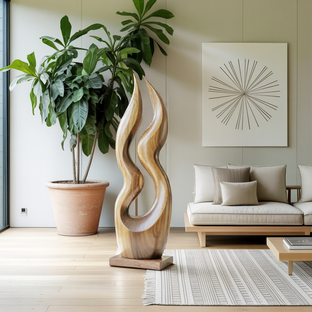 Inspired by the flowing movement of flames and the organic forms found in nature, this abstract wooden sculpture is more than just décor - it’s a visual statement. Its fluid, twisting curves evoke motion and harmony, creating a sense of energy that subtly transforms any space. Whether used as a focal point or an accent piece, it brings life and depth to minimalist, modern, and contemporary interiors.