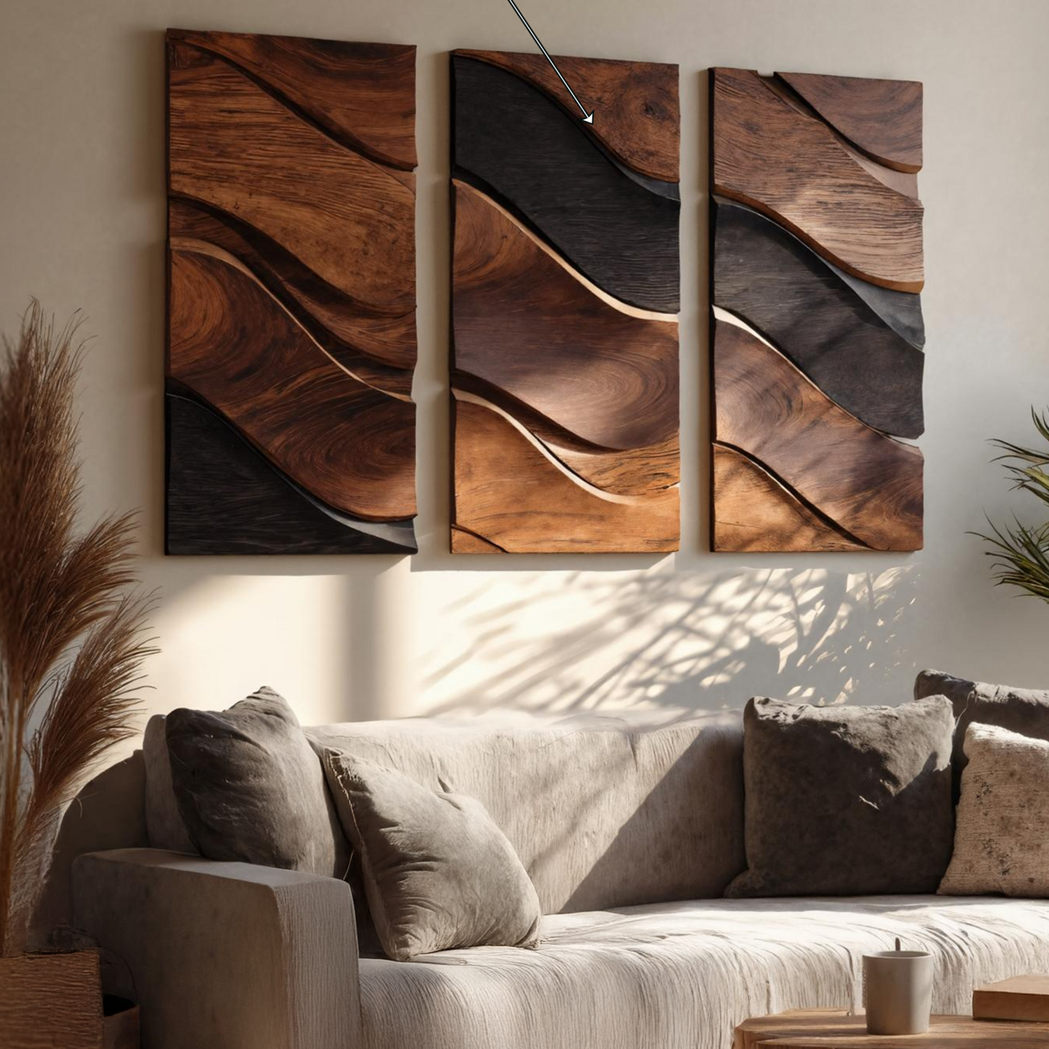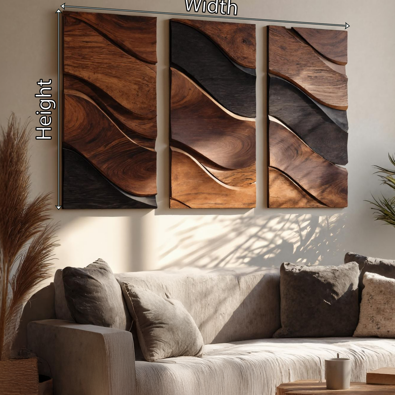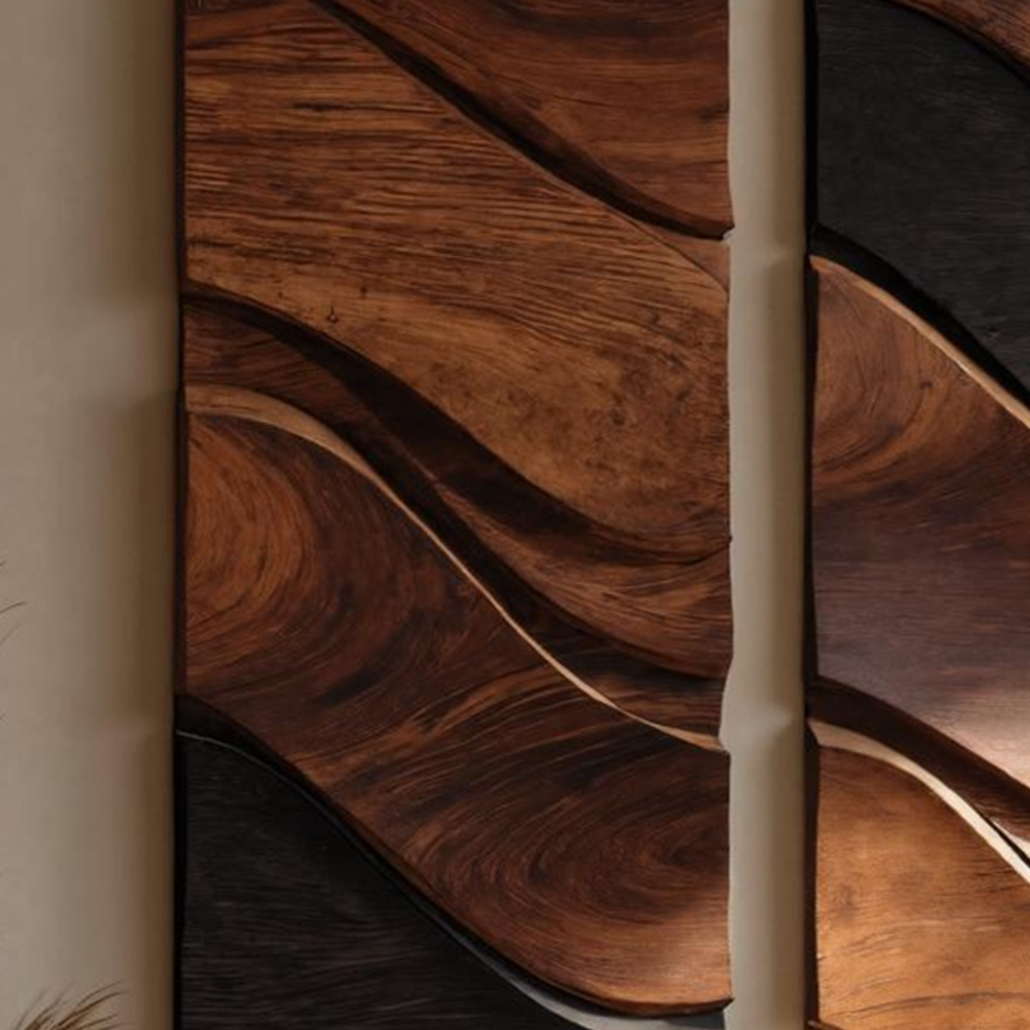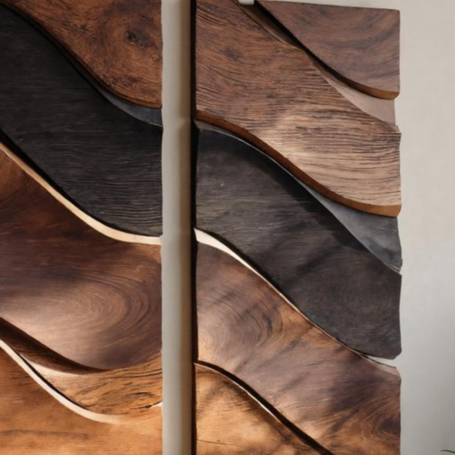 This wall-mounted sculpture blends fluid, organic contours with minimalist elegance. Hand-carved from solid hardwood, the rhythmic folds resemble ocean tides frozen in motion. The golden-toned wood grain is accentuated by deep charcoal edges, creating a striking interplay of warmth and contrast. Designed with a hidden mount, the piece floats seamlessly against your wall, enhancing its sculptural presence.