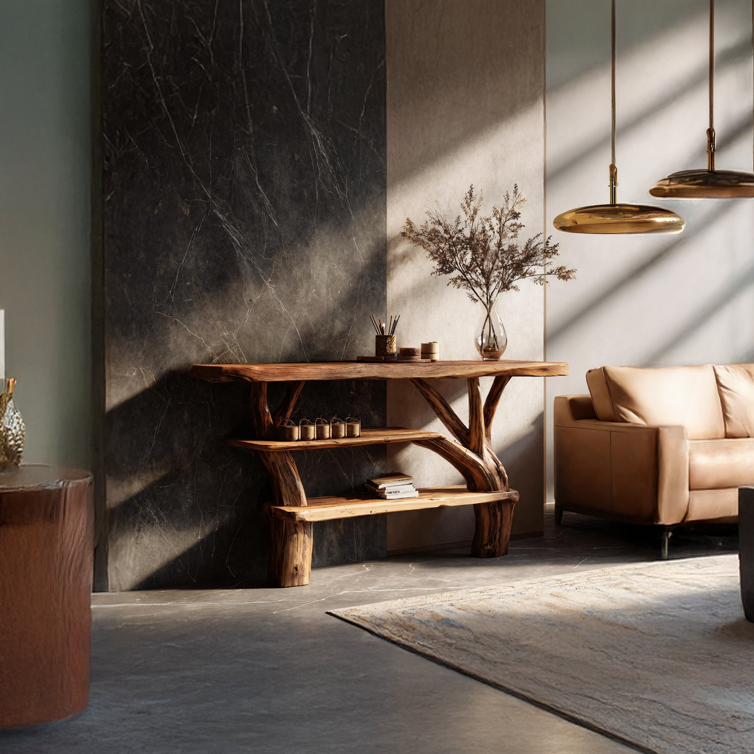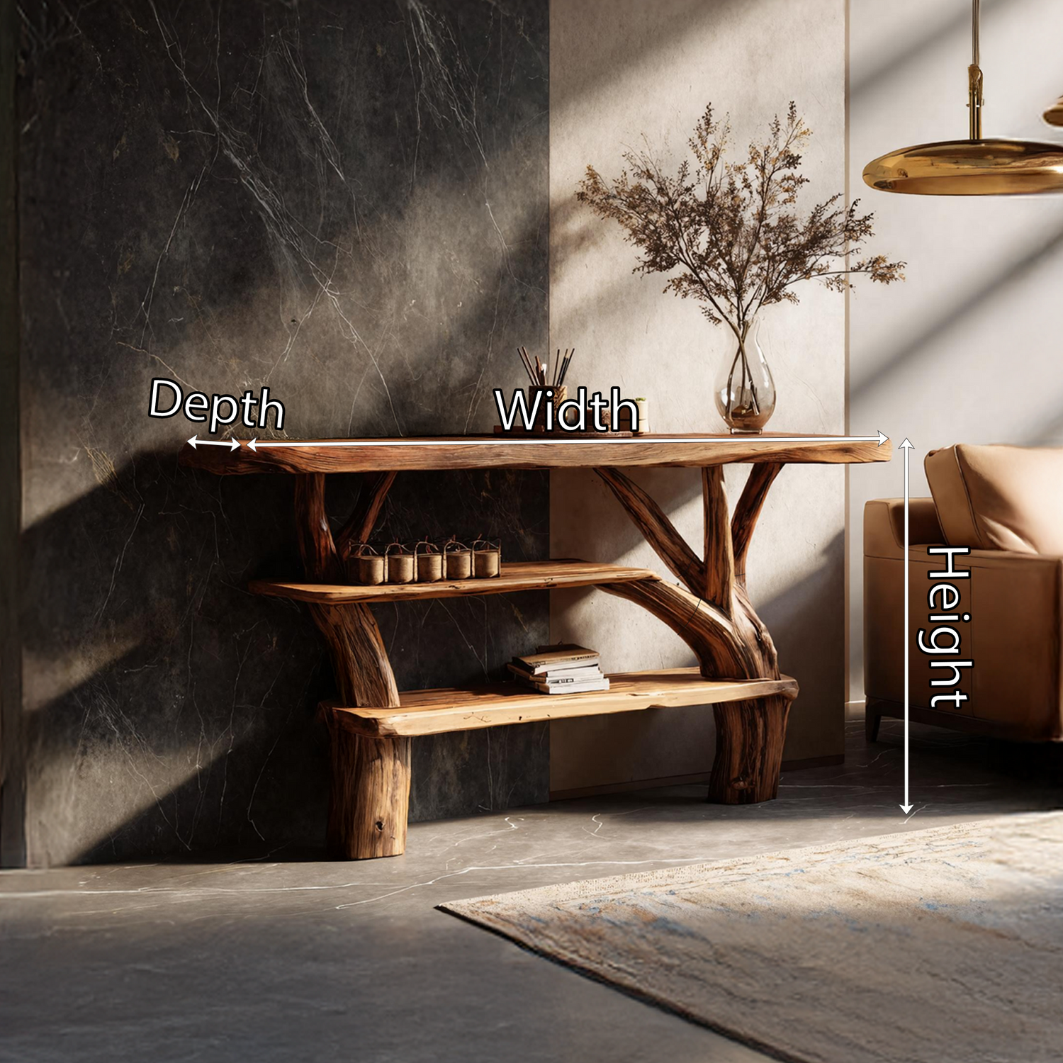Each console table is unique, showcasing the natural beauty of solid wood through its organic grain, textures, and subtle imperfections. Every edge retains the lively character of the wood, ensuring no two pieces are ever the same. Finished with care, the surface highlights the wood’s depth and warmth—creating a centerpiece that combines practicality with understated sophistication.