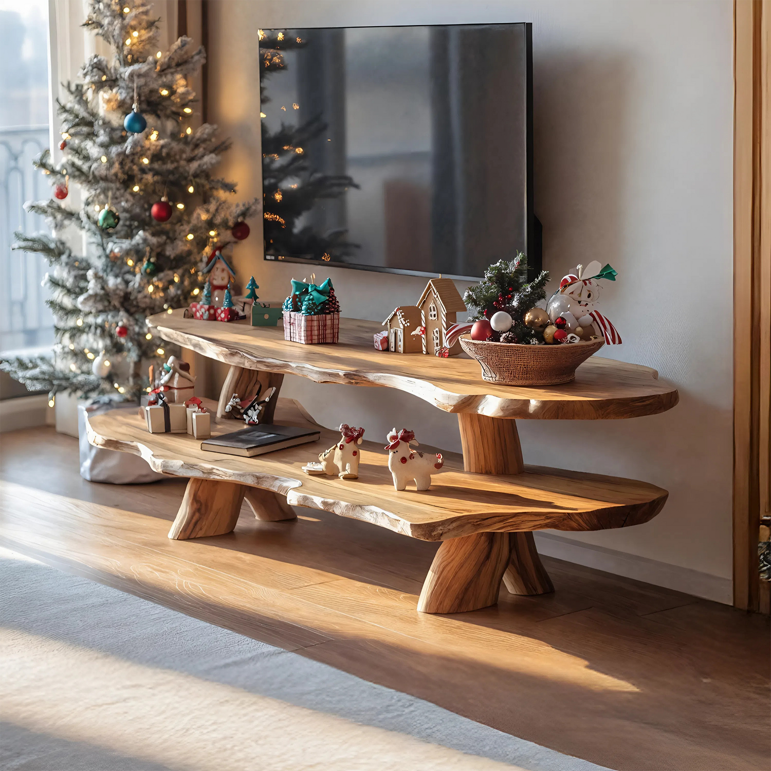 This console features a clean, minimalist silhouette paired with the organic texture of solid wood. Its sleek form and smooth finish make it ideal for contemporary interiors, while the natural grain adds warmth and visual depth. The open shelving design provides convenient storage and display space for ornaments, books, or festive décor.