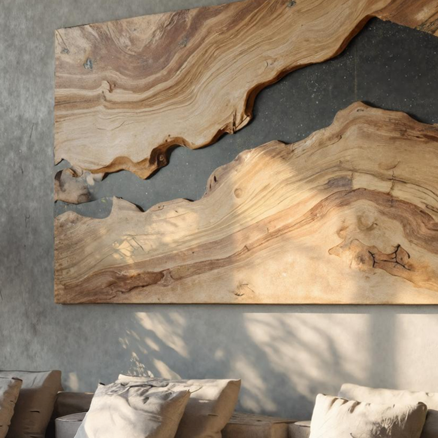 This wall-mounted sculpture blends fluid, organic contours with minimalist elegance. Hand-carved from solid hardwood, the rhythmic folds resemble ocean tides frozen in motion. The golden-toned wood grain is accentuated by deep charcoal edges, creating a striking interplay of warmth and contrast. Designed with a hidden mount, the piece floats seamlessly against your wall, enhancing its sculptural presence.