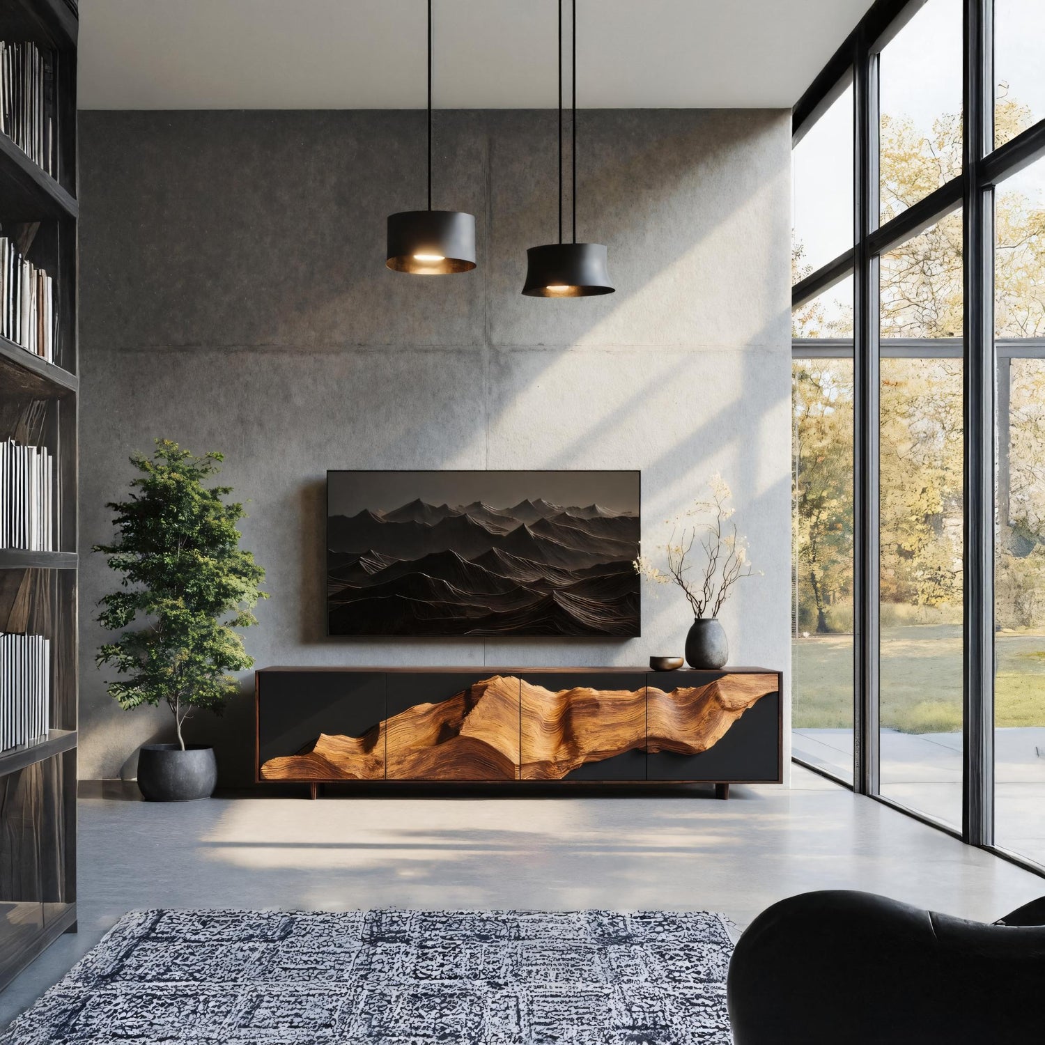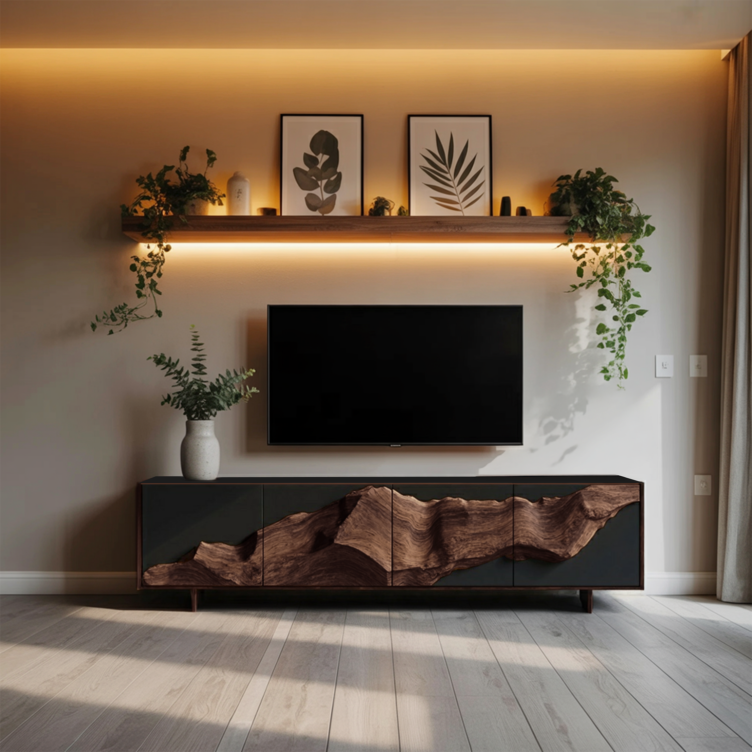 This wall-mounted TV console features a sleek, minimalist silhouette with a bold live edge front that showcases the raw beauty of natural wood. The clean lines and floating installation create an airy, uncluttered look, making it ideal for modern living spaces. The open shelving offers versatile storage and display while keeping the focus on the console’s organic contours.