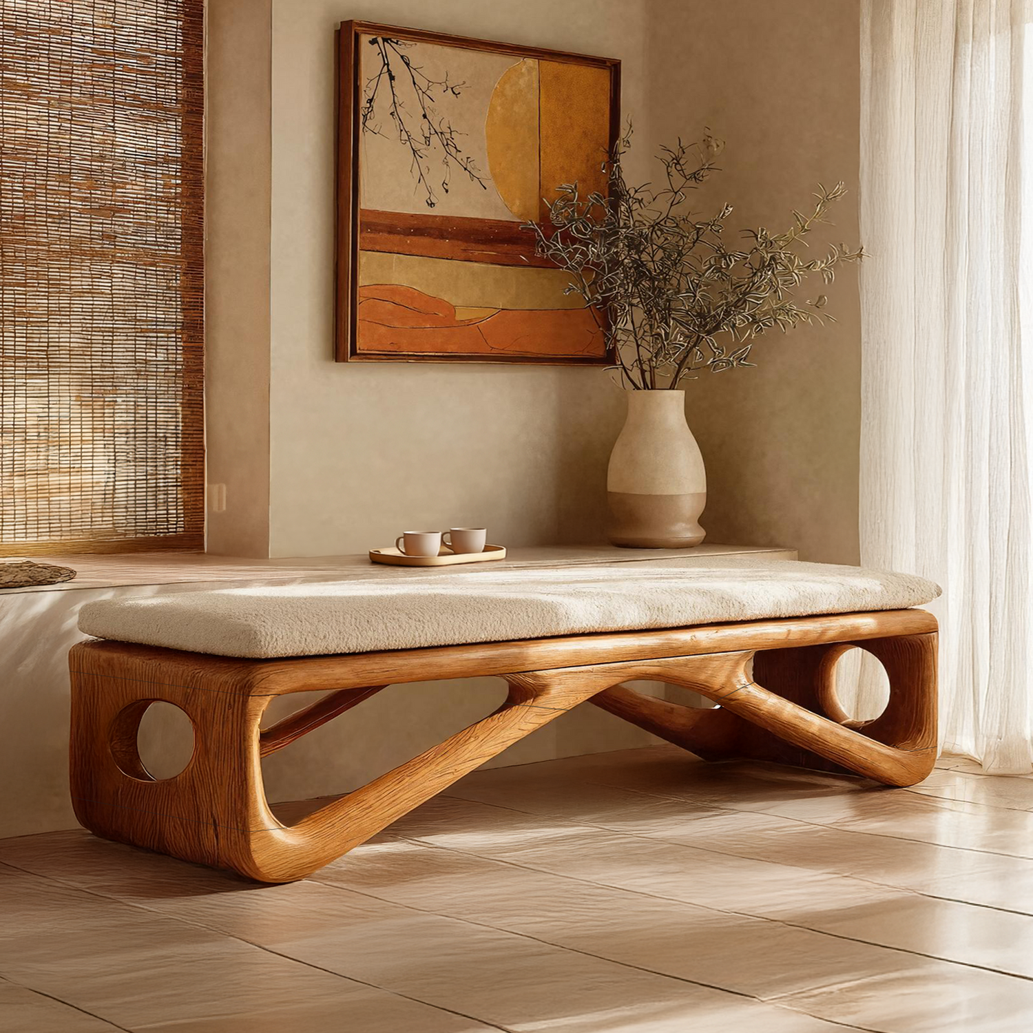 Farmhouse Wooden Bench For Cozy Bedroom Corners brings a relaxed, welcoming feel to softly styled bedroom spaces. Crafted from solid wood and defined by simple, sturdy proportions, this bench offers practical seating while adding warmth and visual comfort. Its farmhouse-inspired form fits easily into cozy corners, at the foot of the bed, or along a wall, creating a calm and inviting atmosphere without feeling heavy.