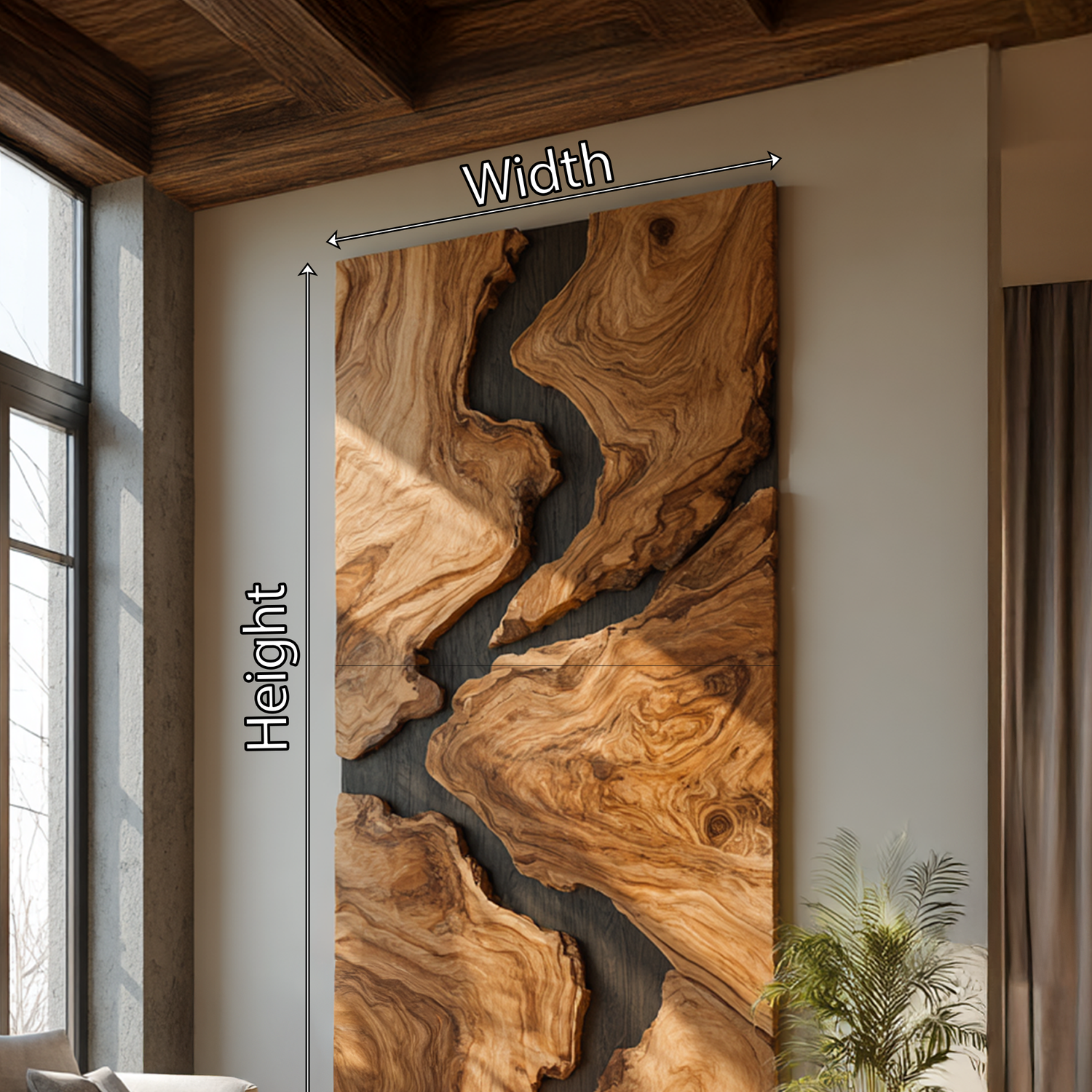 This wall-mounted sculpture blends fluid, organic contours with minimalist elegance. Hand-carved from solid hardwood, the rhythmic folds resemble ocean tides frozen in motion. The golden-toned wood grain is accentuated by deep charcoal edges, creating a striking interplay of warmth and contrast. Designed with a hidden mount, the piece floats seamlessly against your wall, enhancing its sculptural presence.