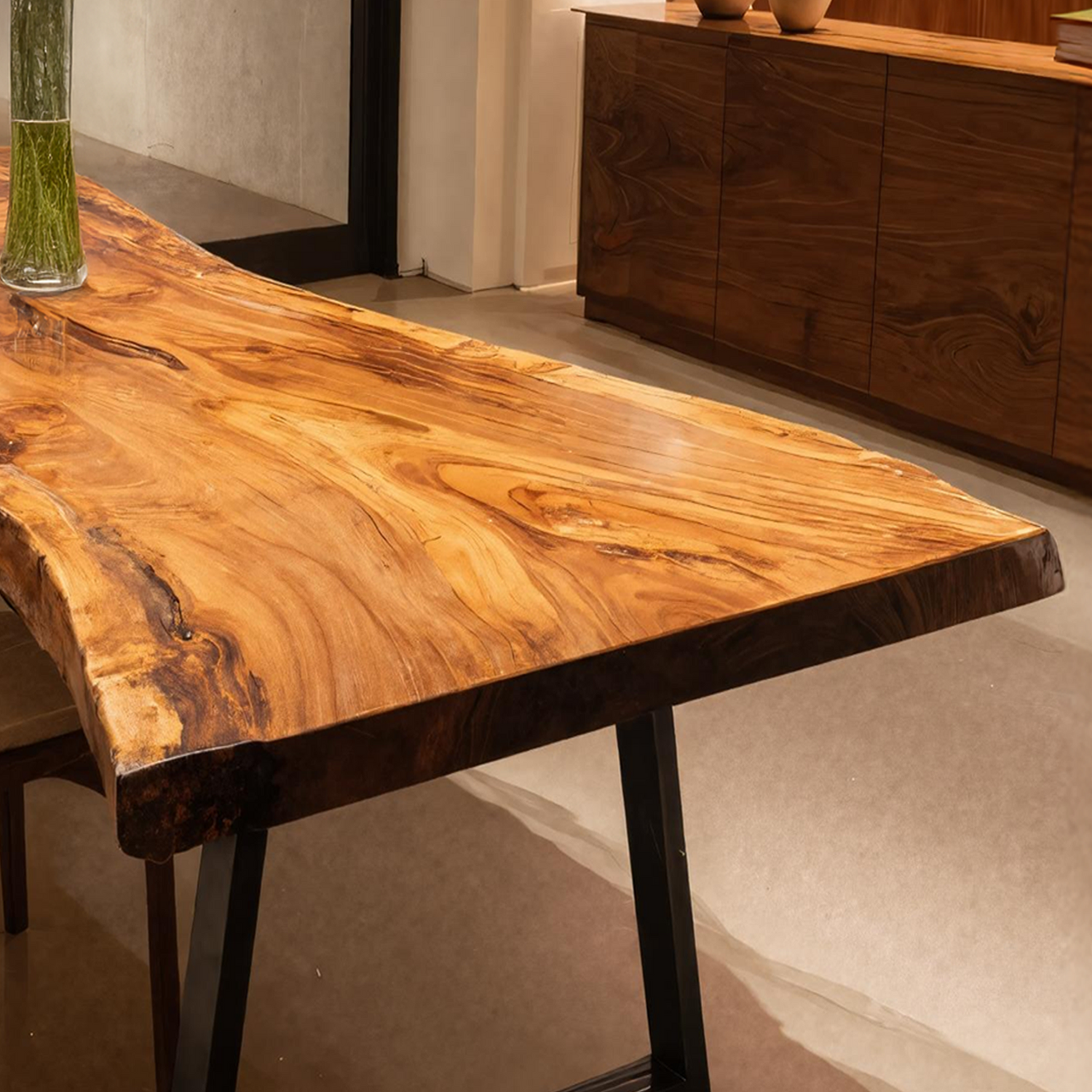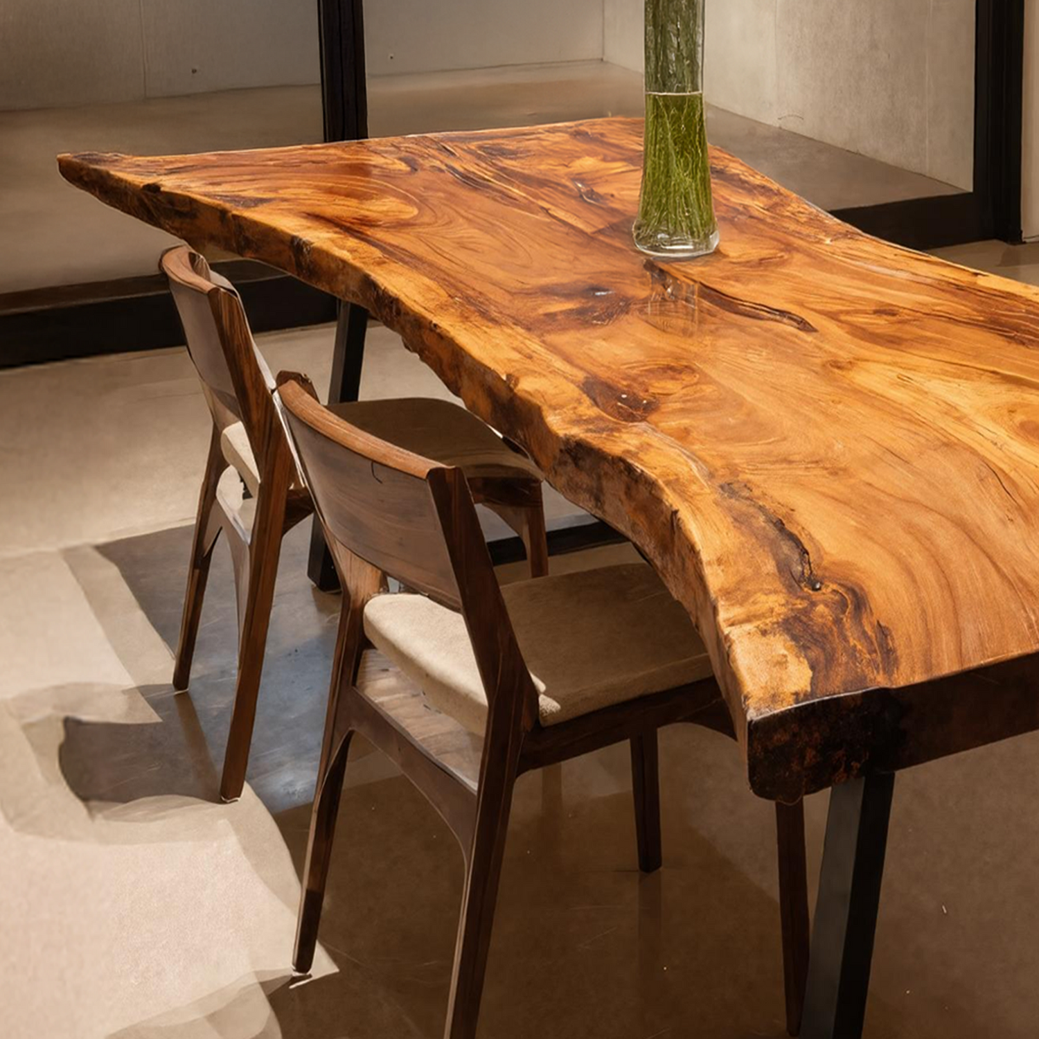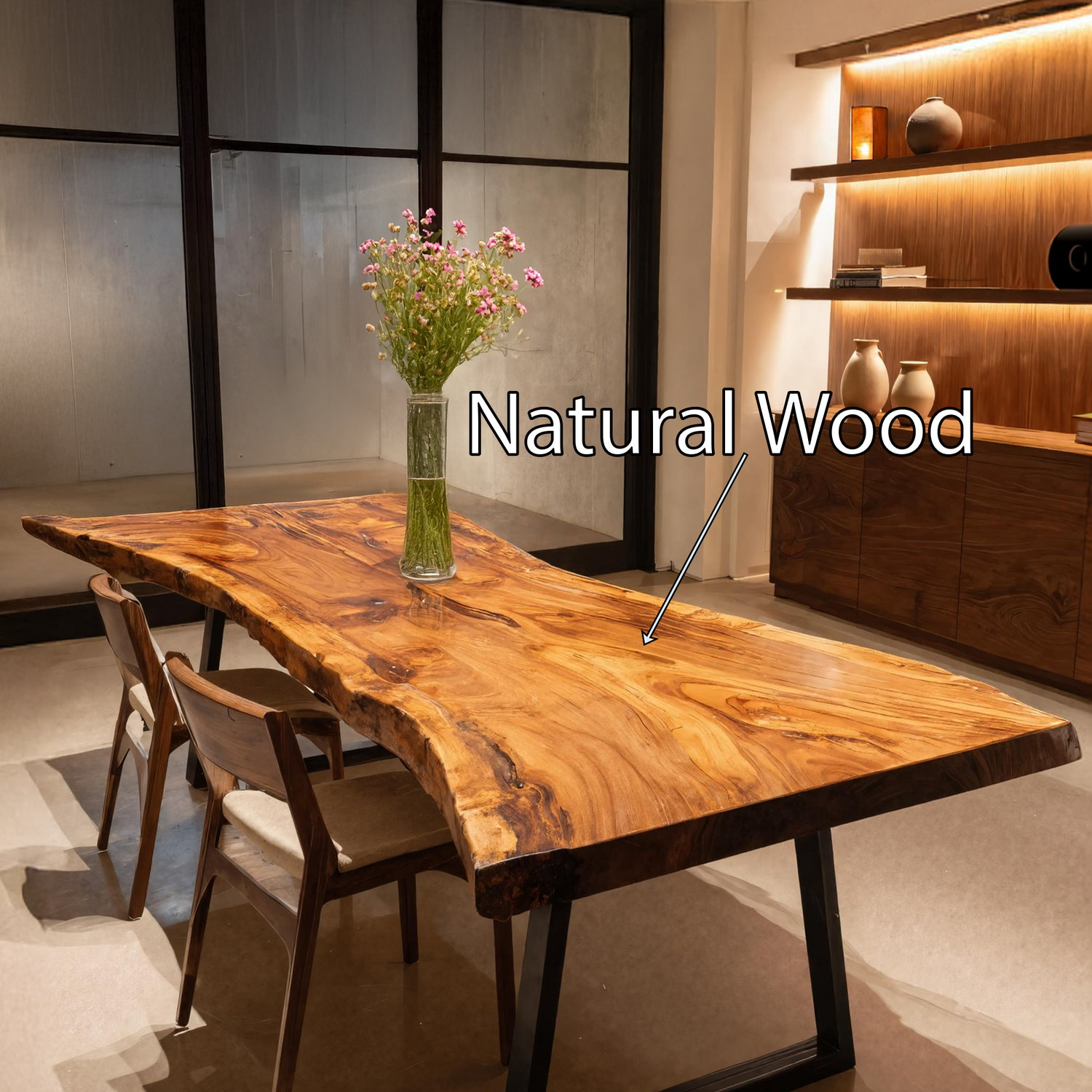 Crafted from kiln-dried hardwood, each tabletop showcases unique grain patterns, tonal variations, and natural markings. The table offers both durability and tactile warmth. Matching solid wood legs further reinforce structural integrity and visual harmony.