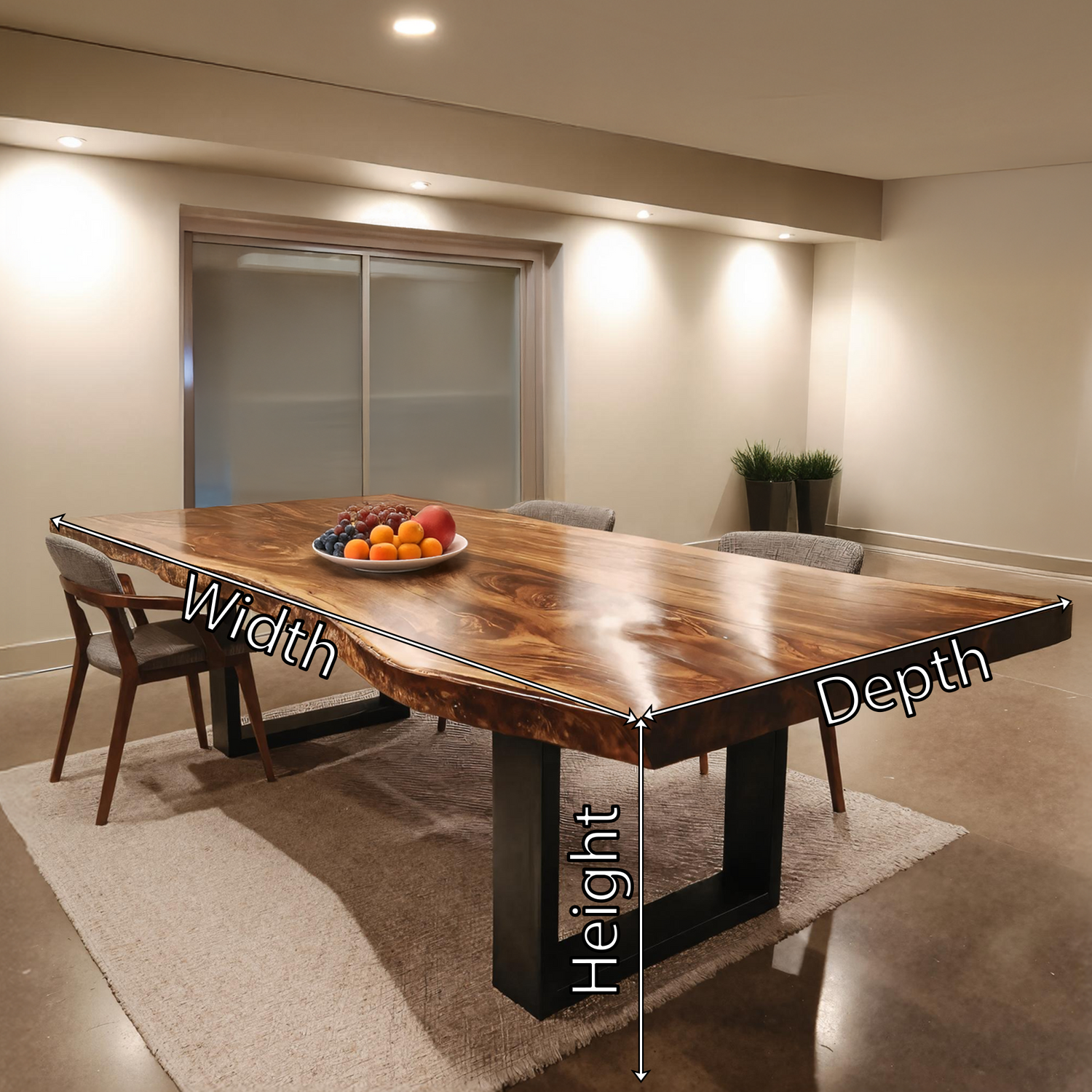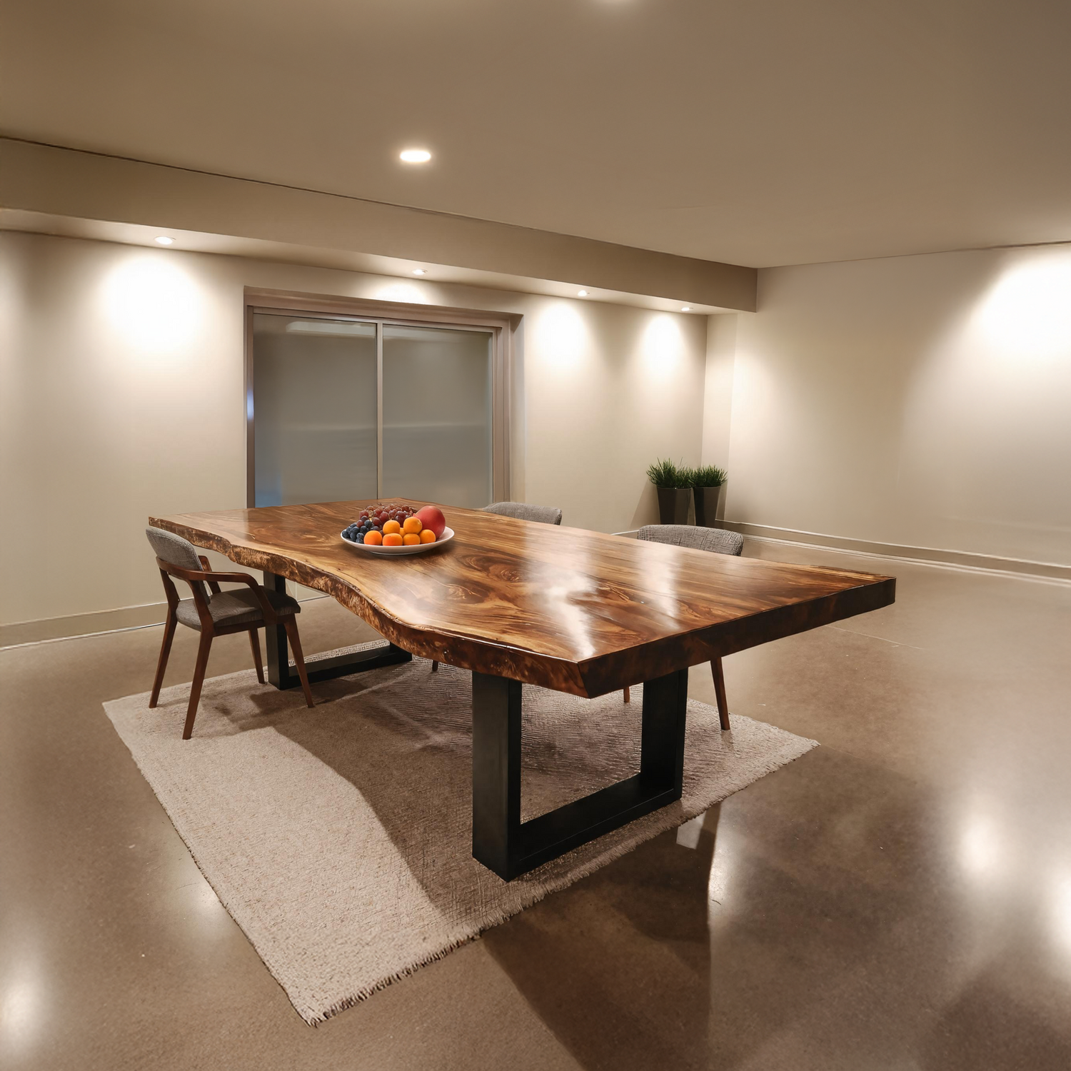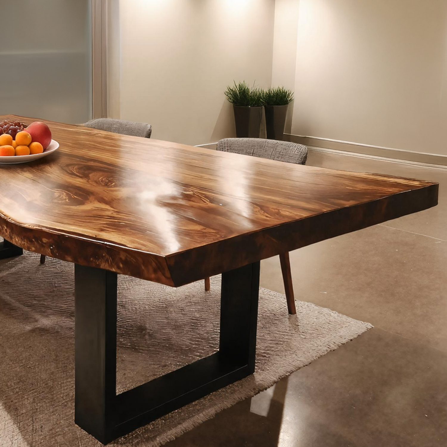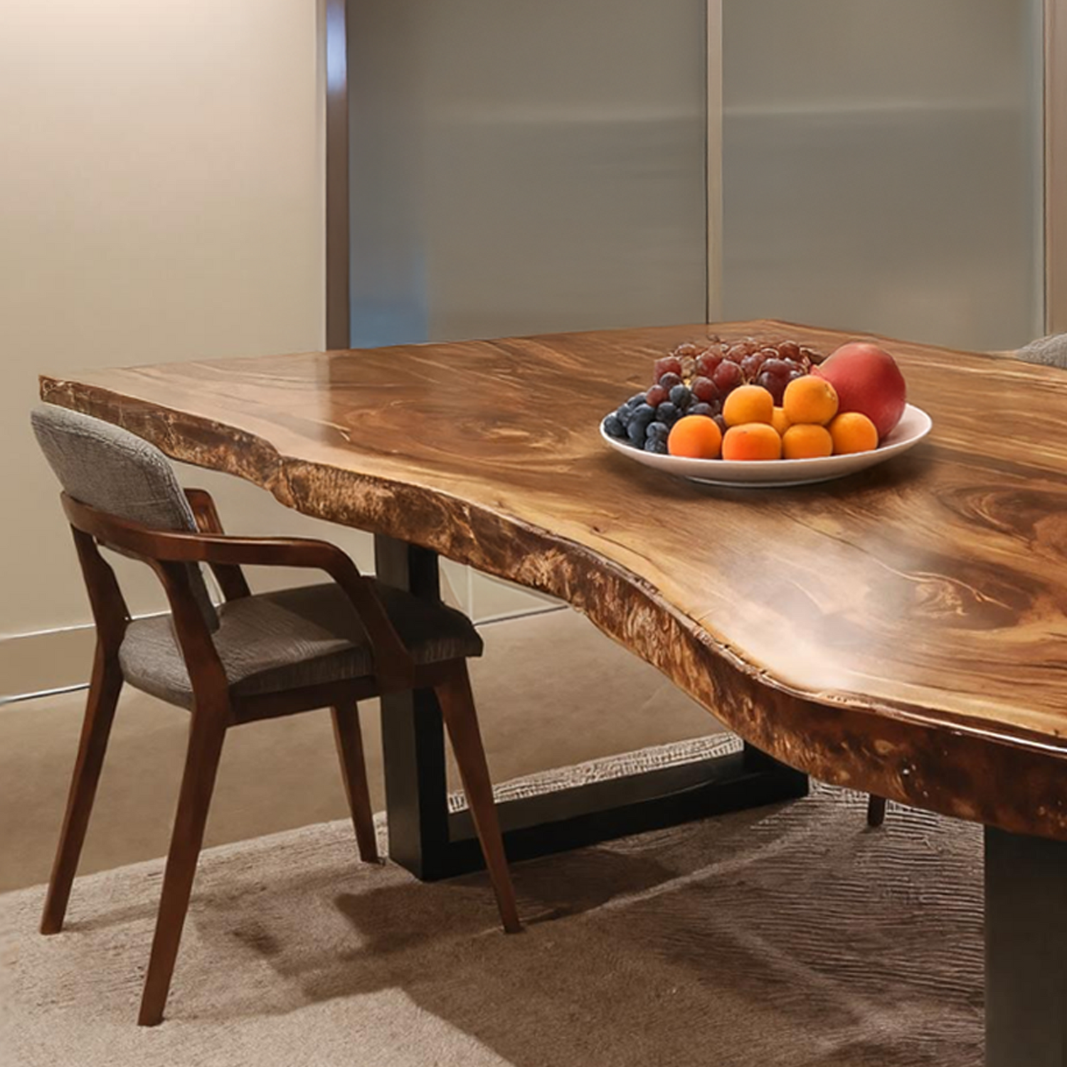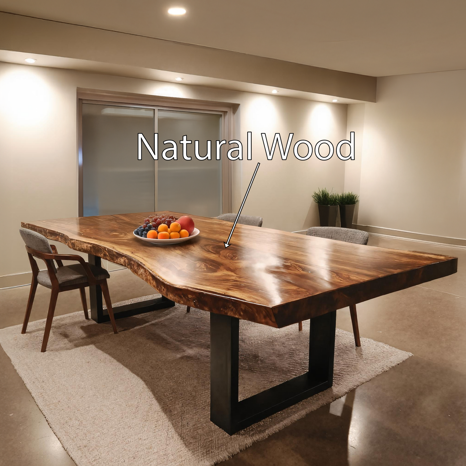Crafted from kiln-dried hardwood, each tabletop showcases unique grain patterns, tonal variations, and natural markings. The table offers both durability and tactile warmth. Matching solid wood legs further reinforce structural integrity and visual harmony.