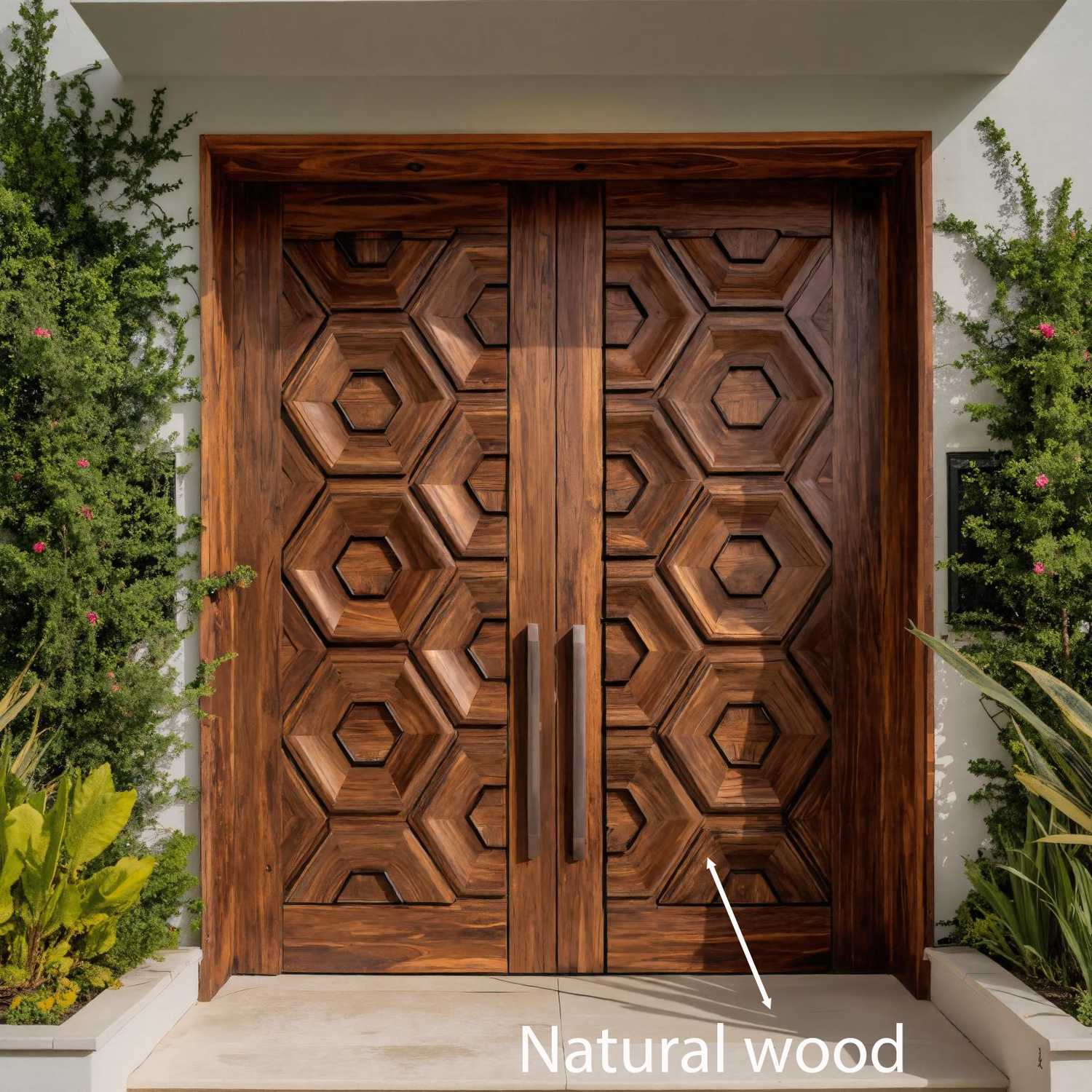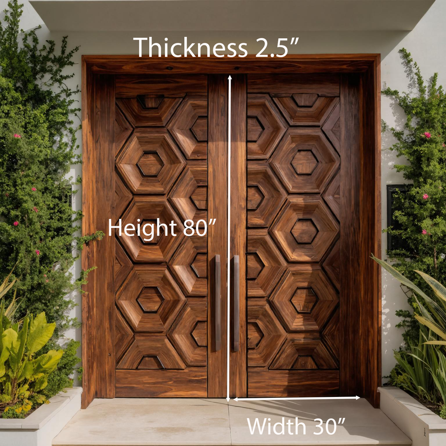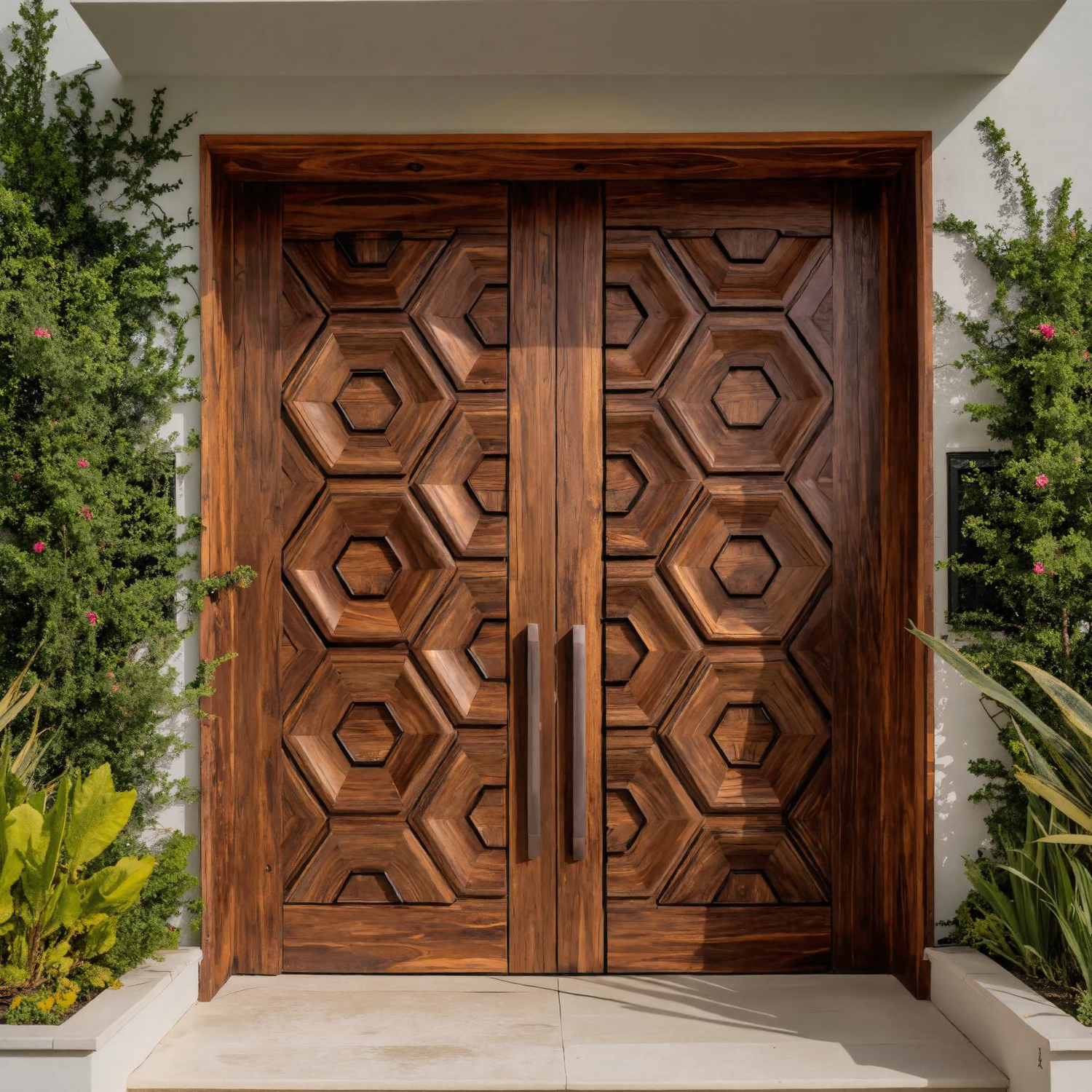 This double front door showcases a repeating geometric pattern that highlights craftsmanship and balance. Each hexagonal relief reflects light differently throughout the day, revealing subtle variations in tone and texture. The clean-lined frame and contemporary handles enhance its sculptural presence, making it a statement piece for any modern façade.