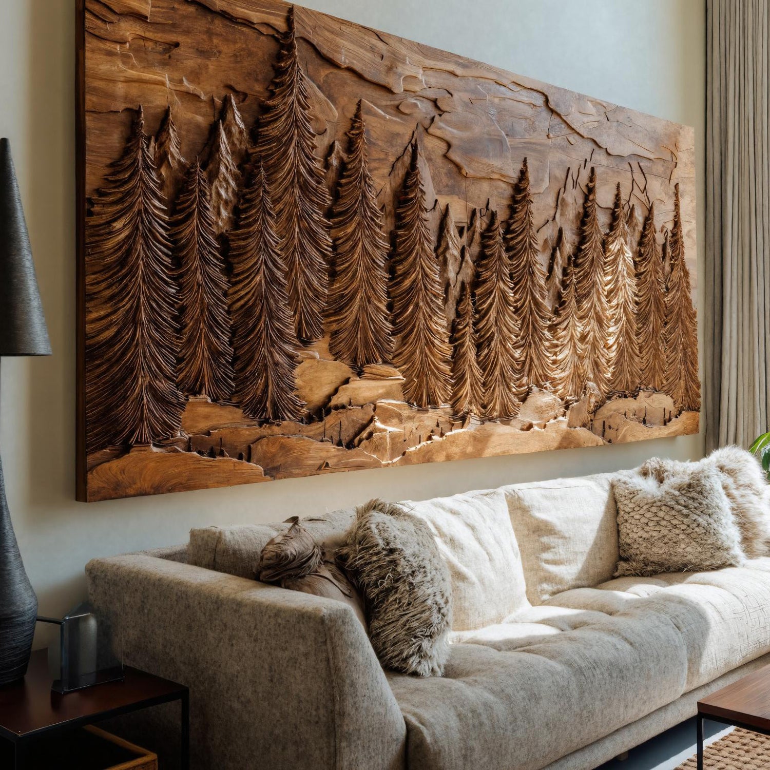 Hand Carved Wall Art With Forest Landscape For Living Room