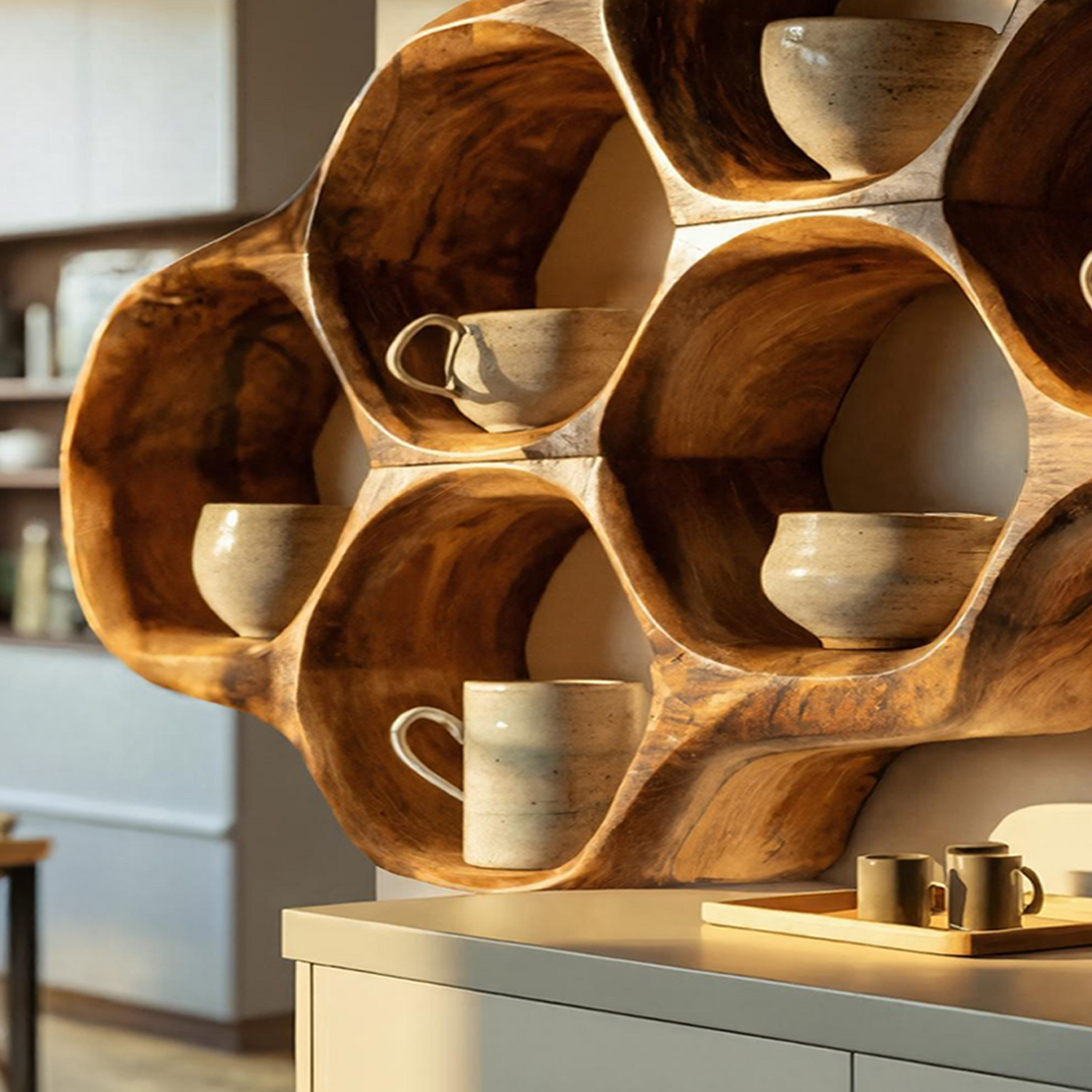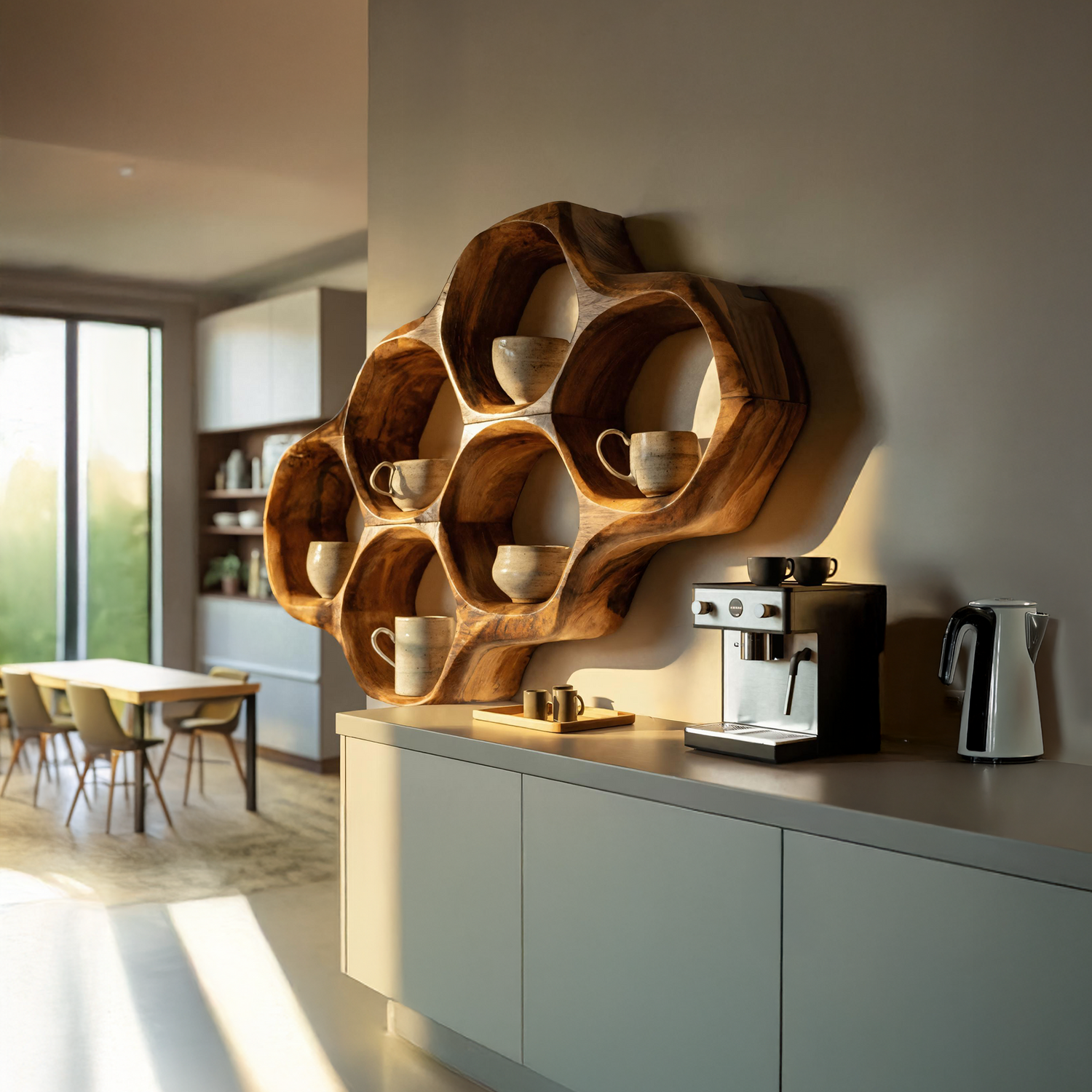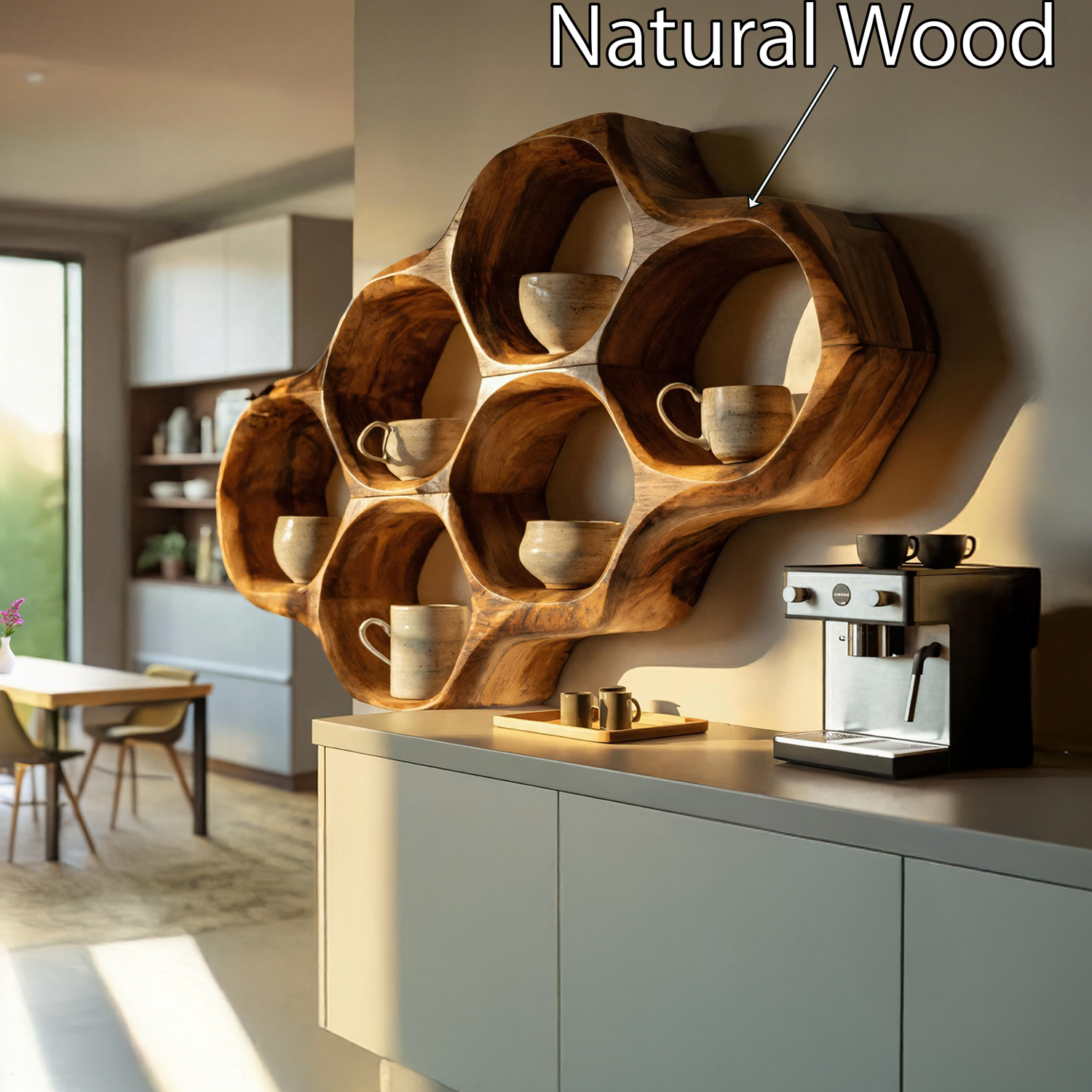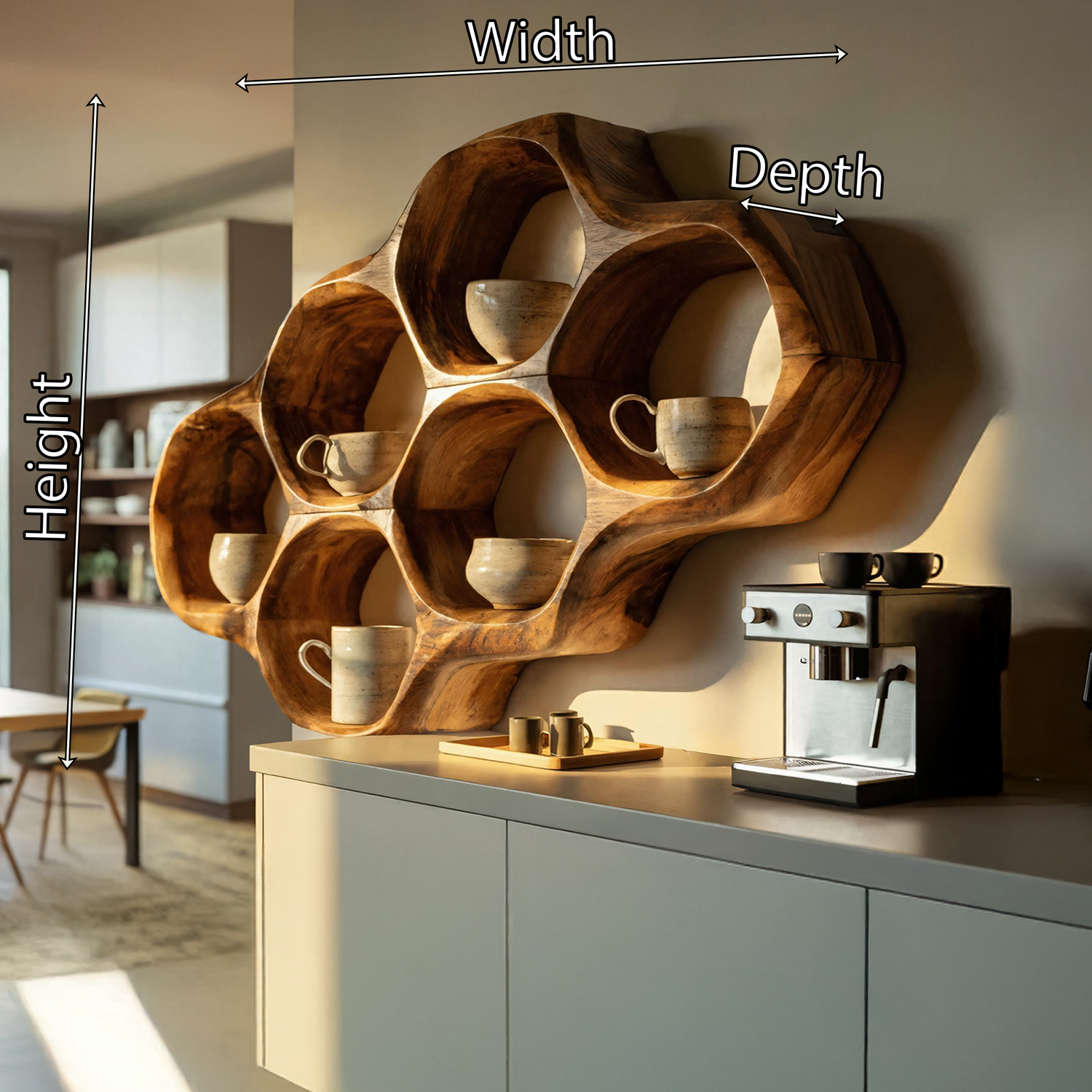 Add visual rhythm and practical storage to your coffee setup with the Handcrafted Honeycomb Wall Shelf For Coffee Station Stylin. Crafted from solid wood and shaped in a geometric honeycomb form, this wall-mounted shelf brings structure and character to your coffee station. Designed to display mugs, jars, or small accessories, it keeps daily essentials within reach while maintaining a clean, organized look.