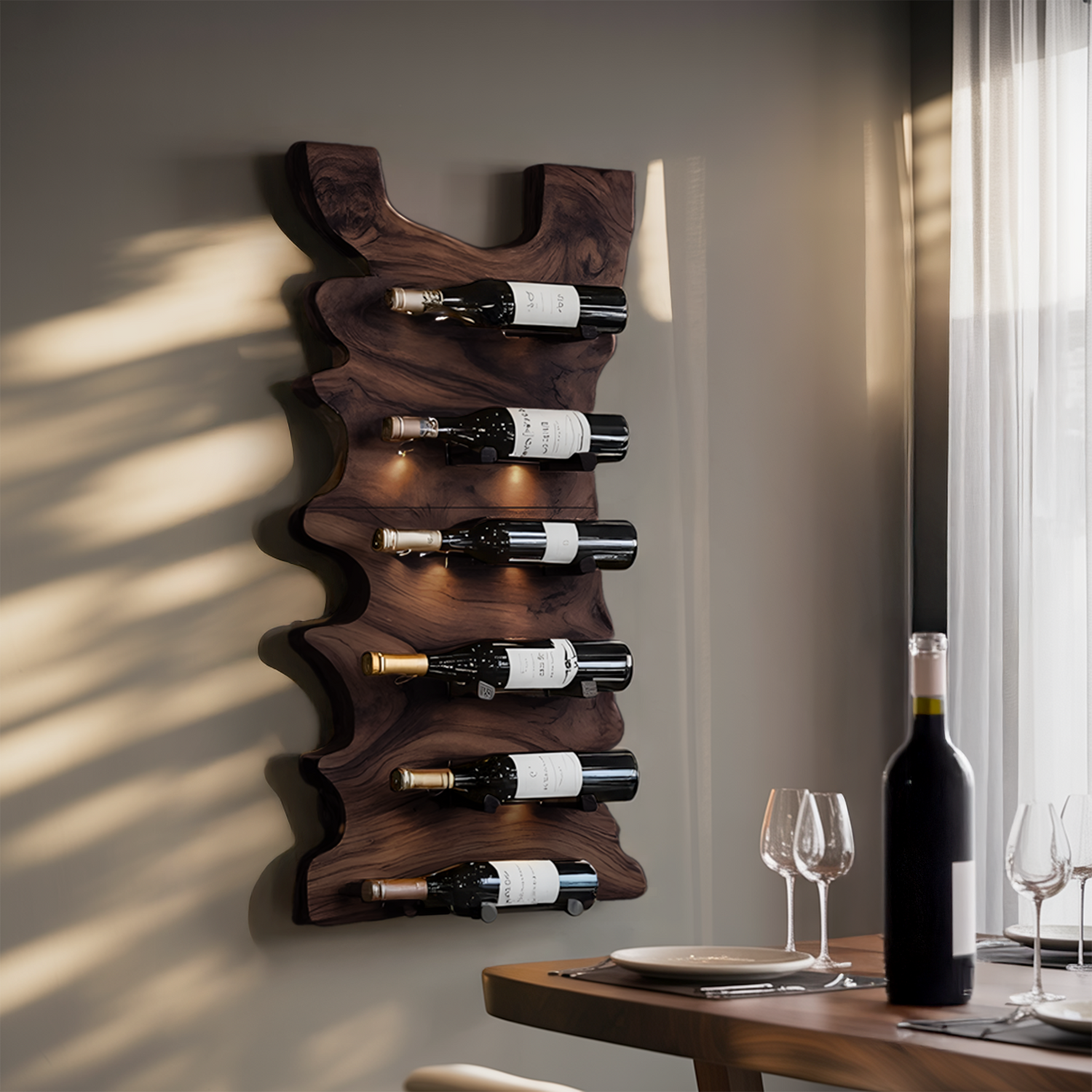 Designed as a wall-mounted wine holder, this piece combines decorative appeal with practical storage. Its stable structure securely supports a single bottle while creating a clean visual accent on your wall.