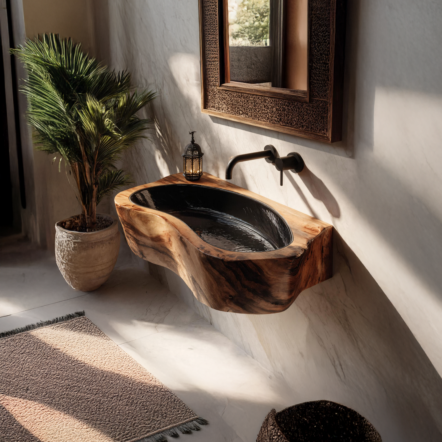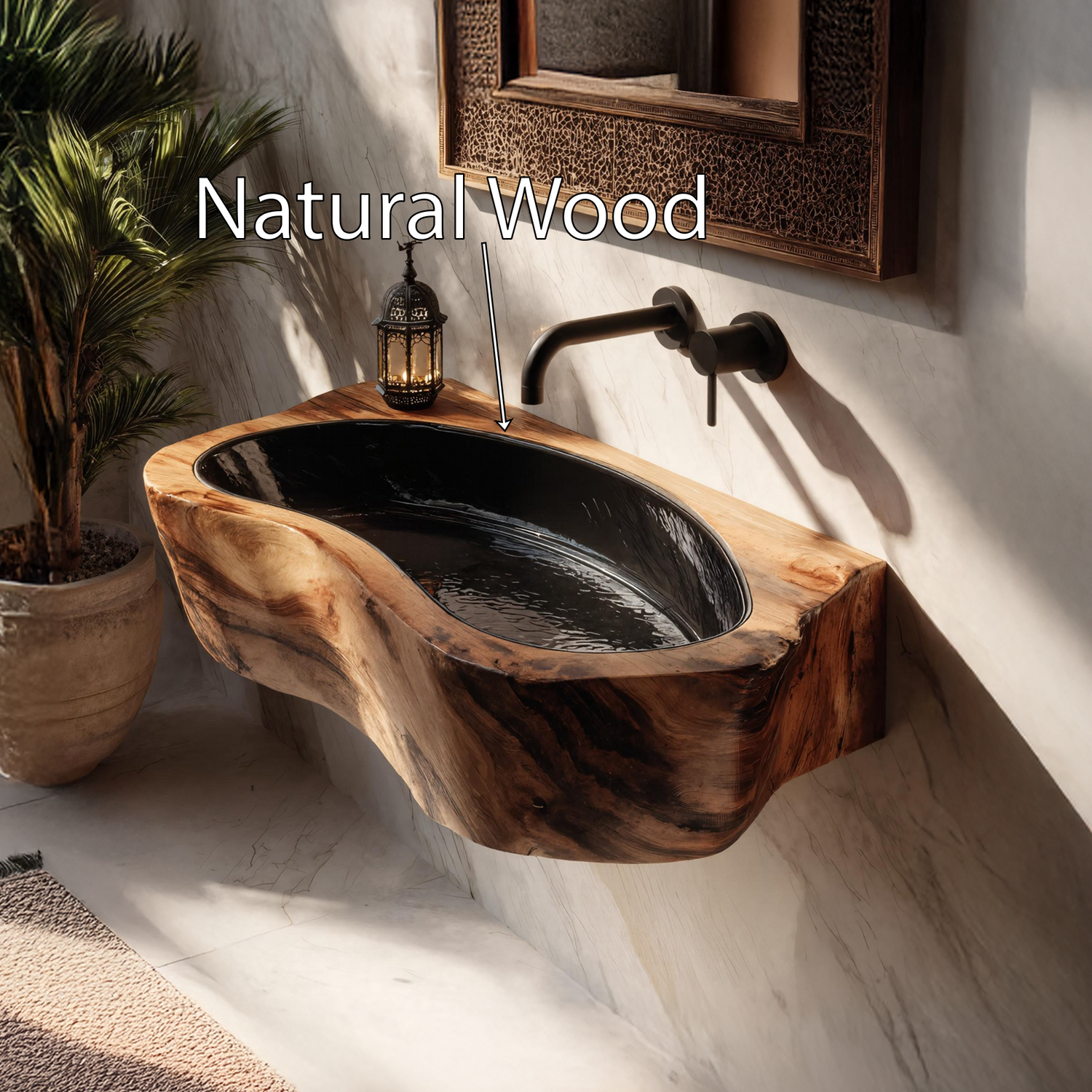Handcrafted Live Edge Wood Vanity Sink For Natural Bathroom Decor is made from natural wood, shaped with smooth contours and an organic live-edge profile that highlights the grain. Its warm, grounded presence creates a calm focal point for vanity setups and nature-inspired interiors.