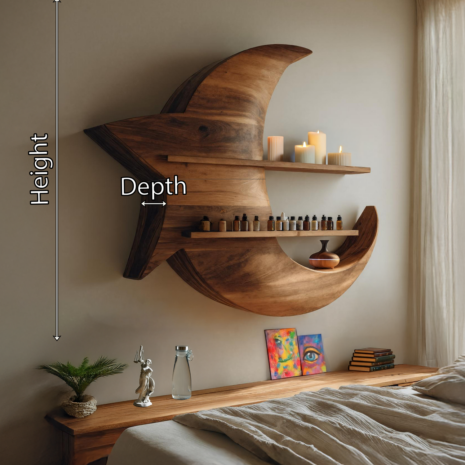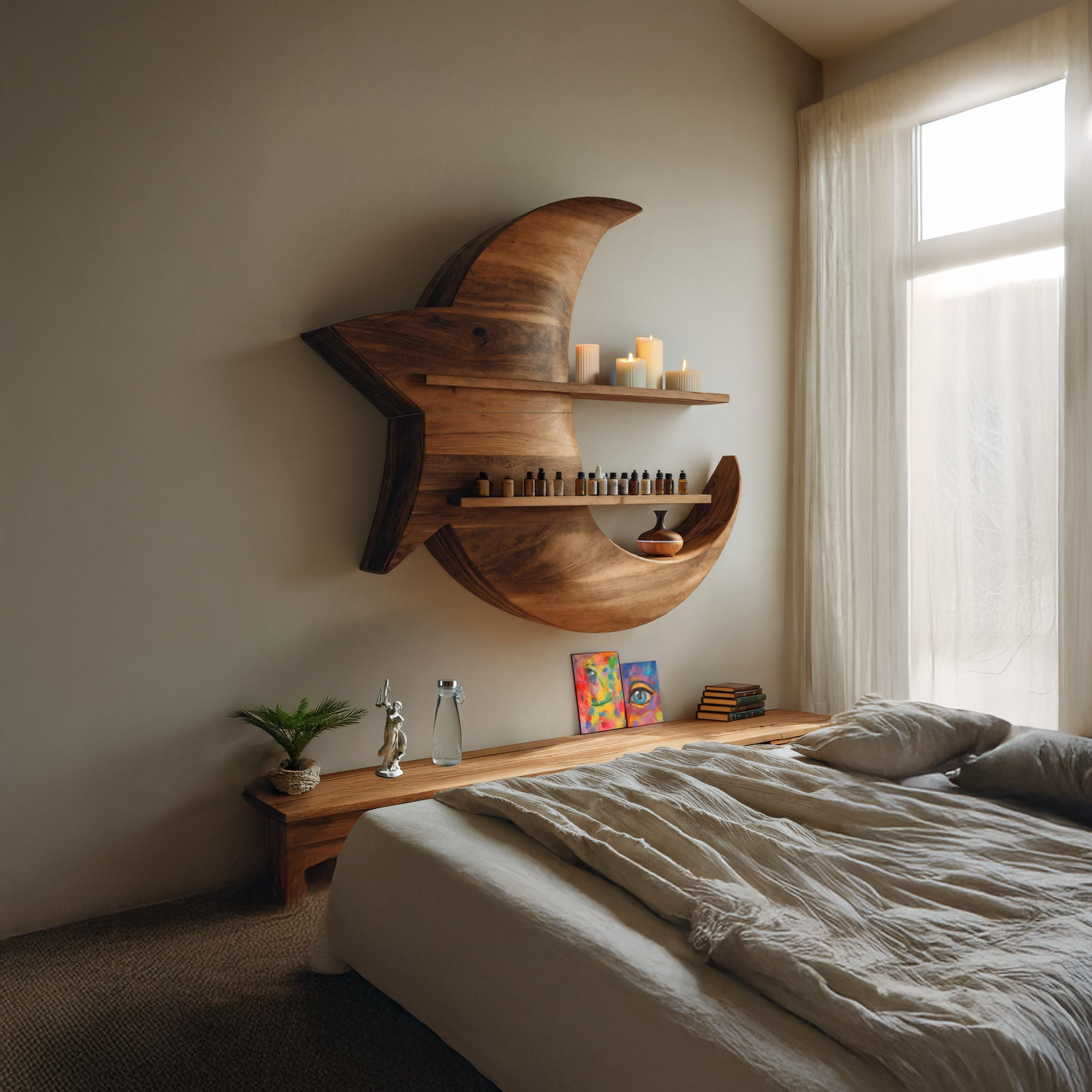 Add a sense of quiet charm to your space with the Handcrafted Moon And Star Wooden Shelf For Bedroom Decor. Crafted from solid wood and shaped with gentle celestial forms, this wall-mounted shelf brings warmth and subtle character to bedroom interiors. Designed for light display and everyday organization, it offers a balanced surface for small décor pieces while maintaining a peaceful, uncluttered feel.