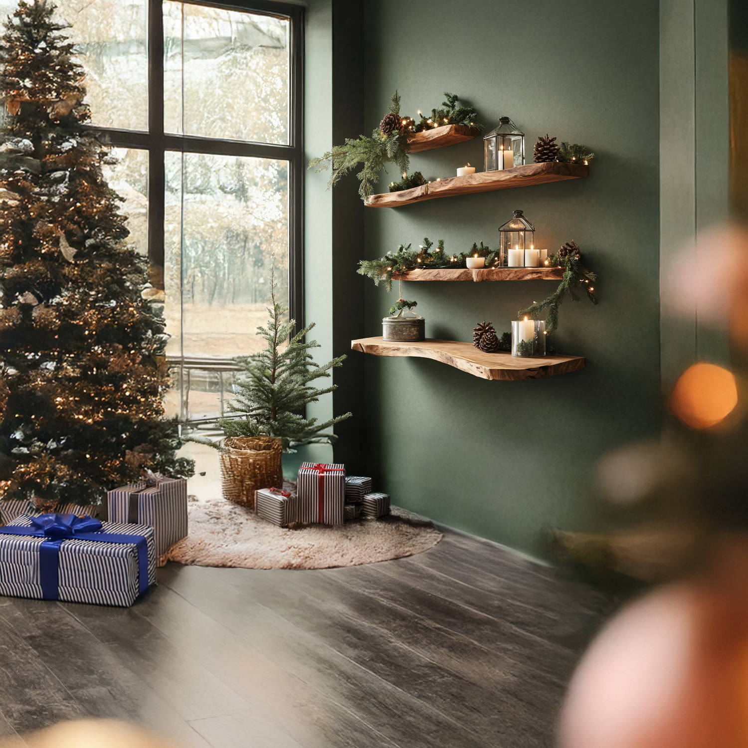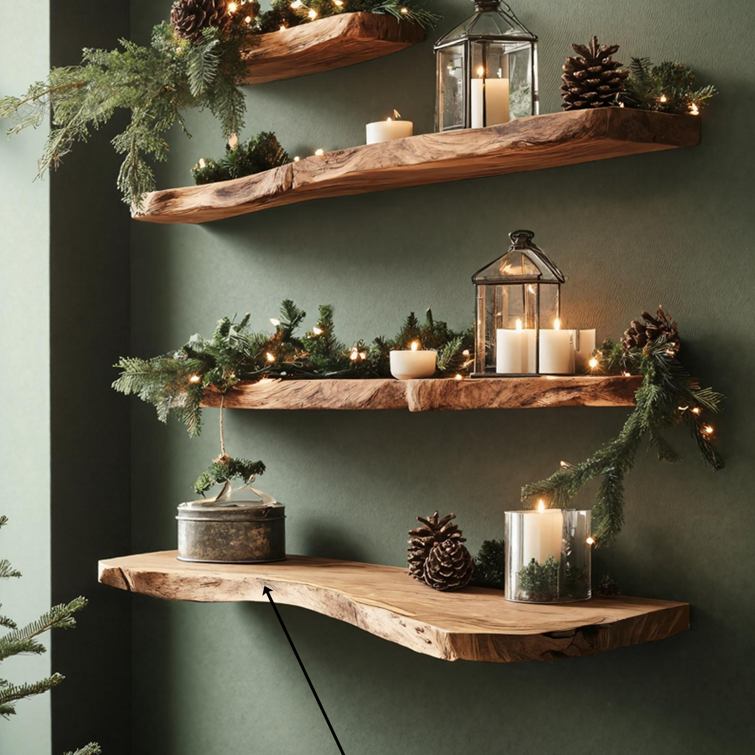 Add a cozy and elegant accent to your living room with the Handcrafted Solid Wood Floating Shelf For Holiday Living Room Design. Carefully made from premium solid wood, this shelf highlights natural grain patterns and fine craftsmanship. Ideal for showcasing candles, garlands, or Christmas ornaments, it combines functionality with festive charm, creating a warm and inviting holiday atmosphere.