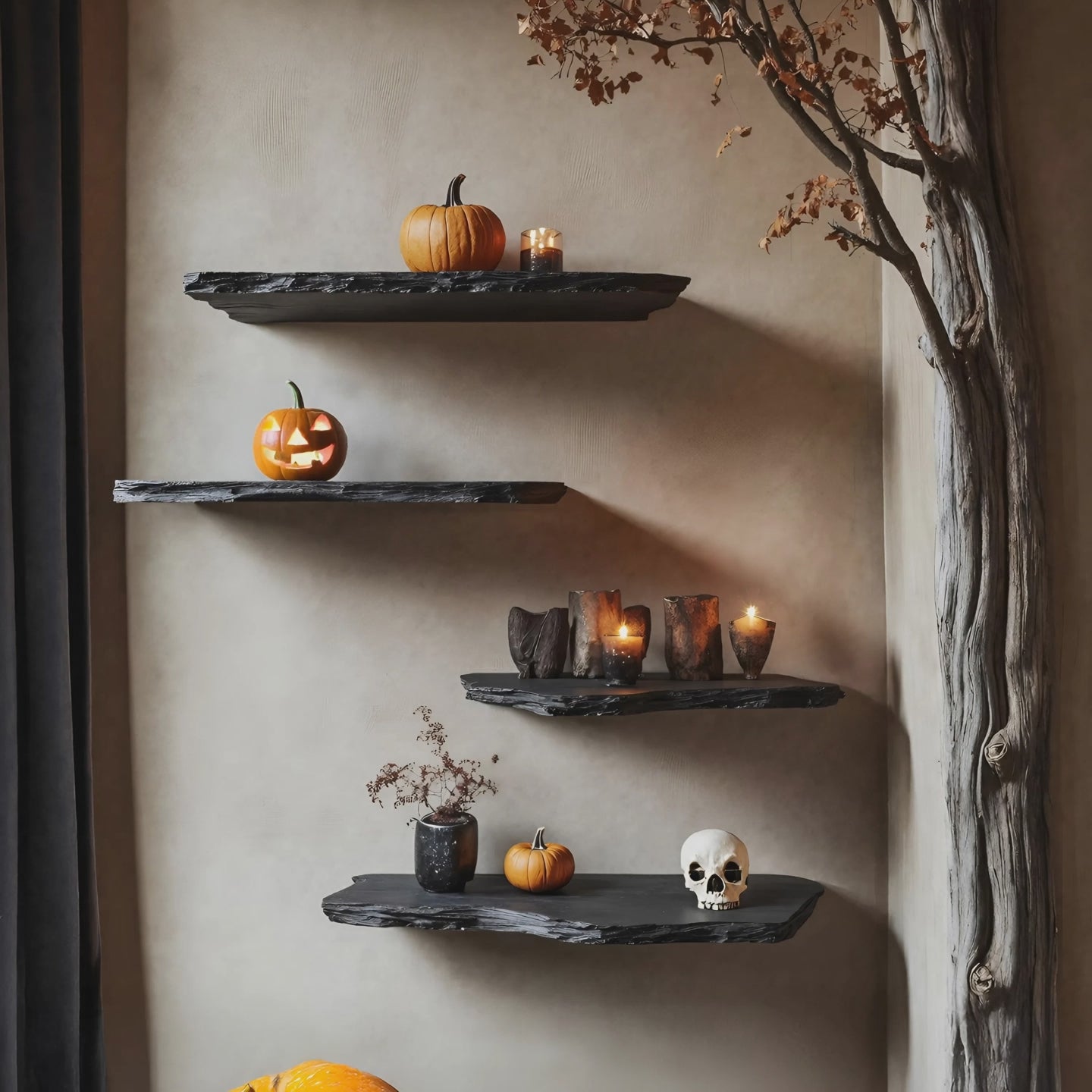 Enhance your interior with the Handcrafted Wooden Floating Shelf For Bedroom Artistic Halloween Wall Decor. Built from solid wood and detailed with artisanal craftsmanship, this shelf combines decorative charm with practical use. Perfect for arranging Halloween accents, candles, or personal items, it adds both artistry and function to your bedroom. Its floating design saves floor space while creating a unique focal point you can enjoy well beyond the holiday season.