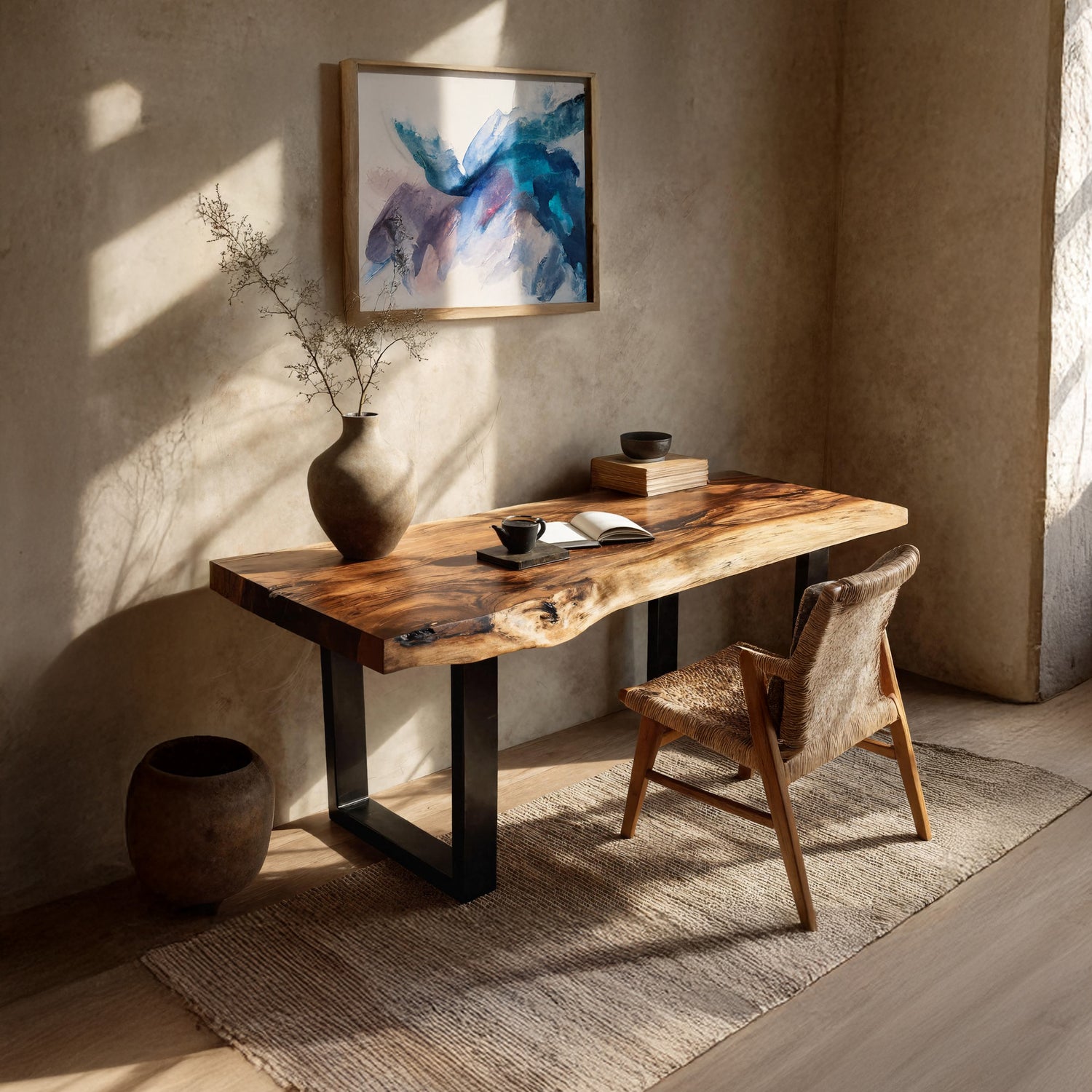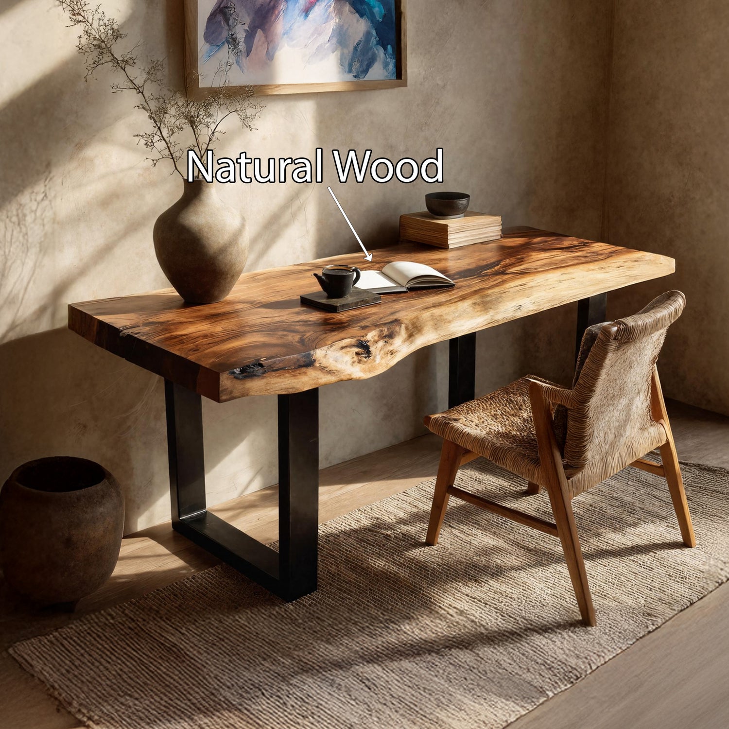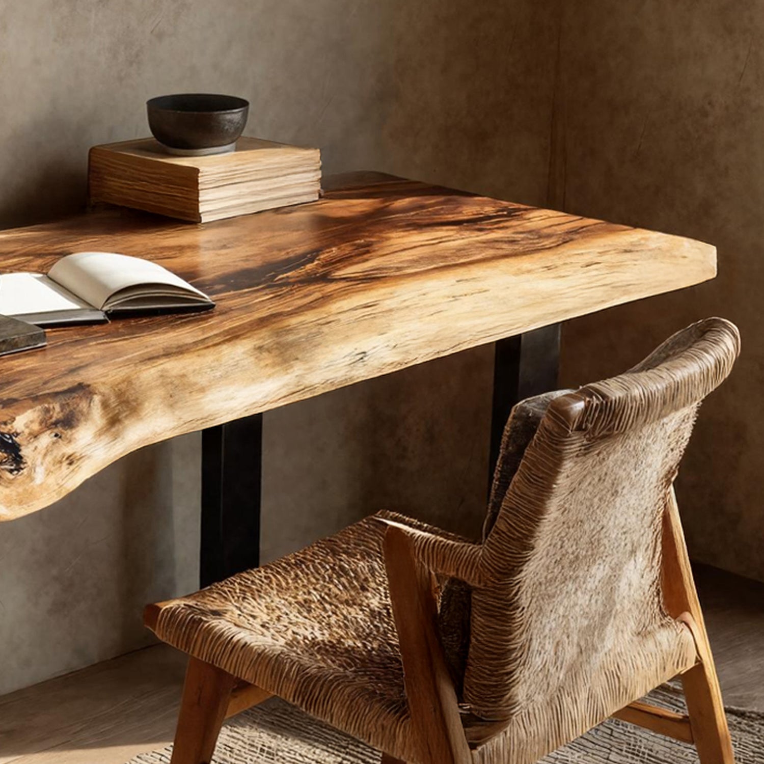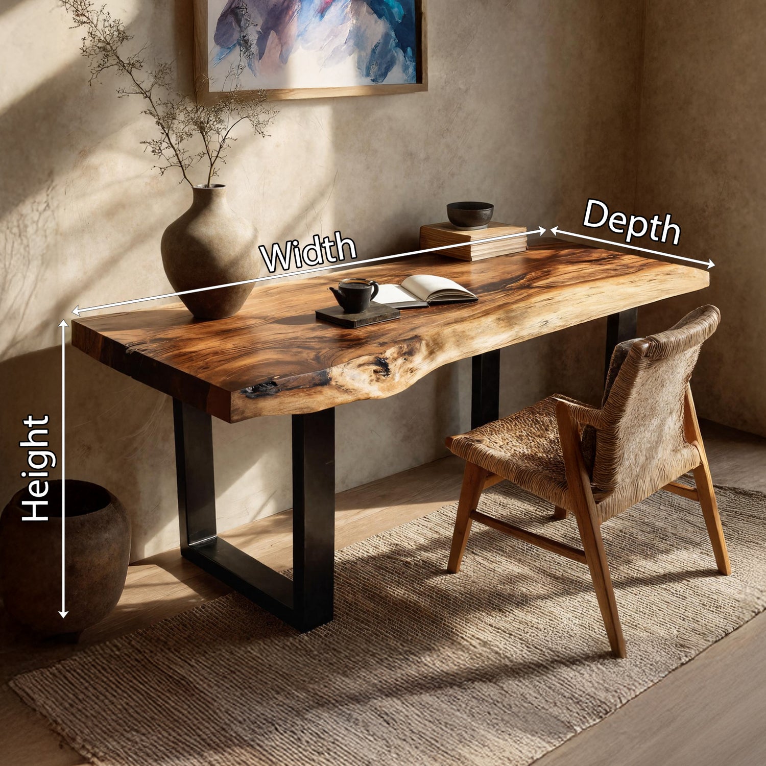 This desk is meticulously handcrafted from carefully selected solid monkey pod wood, showcasing flowing live edges, rich grain movement, and natural variations that make each piece one-of-a-kind. Designed with a timeless silhouette, it blends artisanal craftsmanship with enduring functionality, suitable for both contemporary and rustic-inspired spaces.