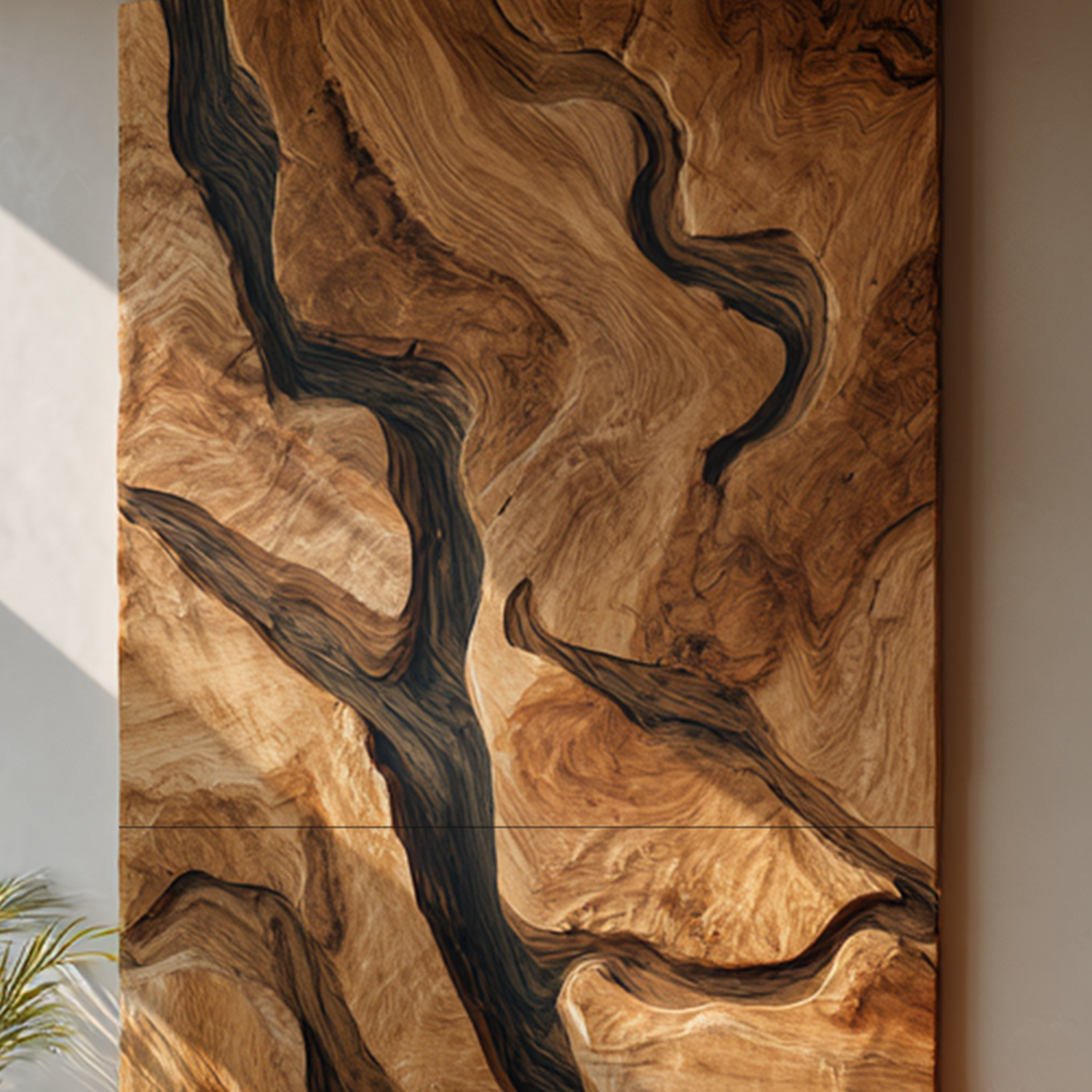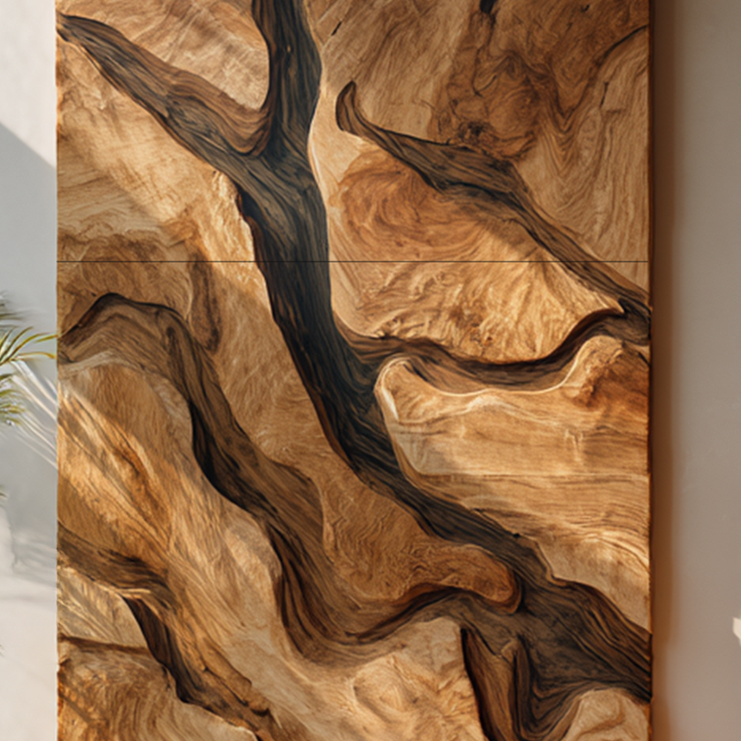 This wall-mounted sculpture blends fluid, organic contours with minimalist elegance. Hand-carved from solid hardwood, the rhythmic folds resemble ocean tides frozen in motion. The golden-toned wood grain is accentuated by deep charcoal edges, creating a striking interplay of warmth and contrast. Designed with a hidden mount, the piece floats seamlessly against your wall, enhancing its sculptural presence.