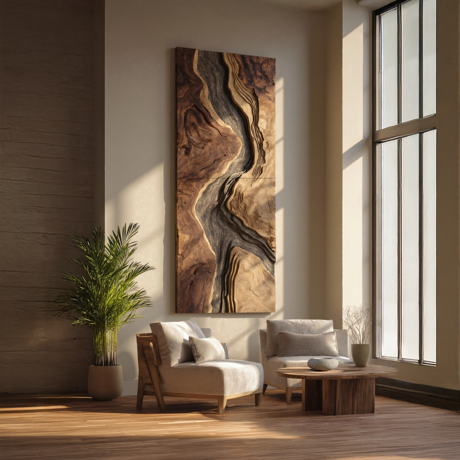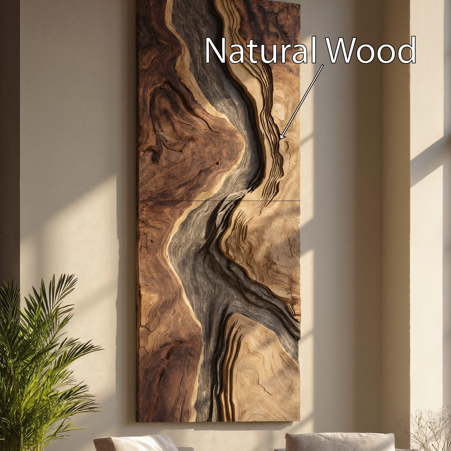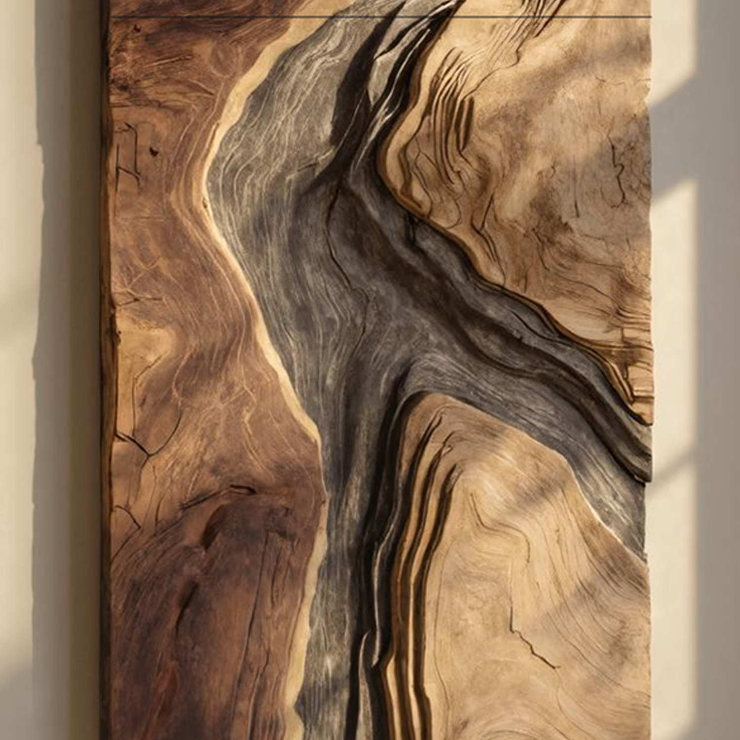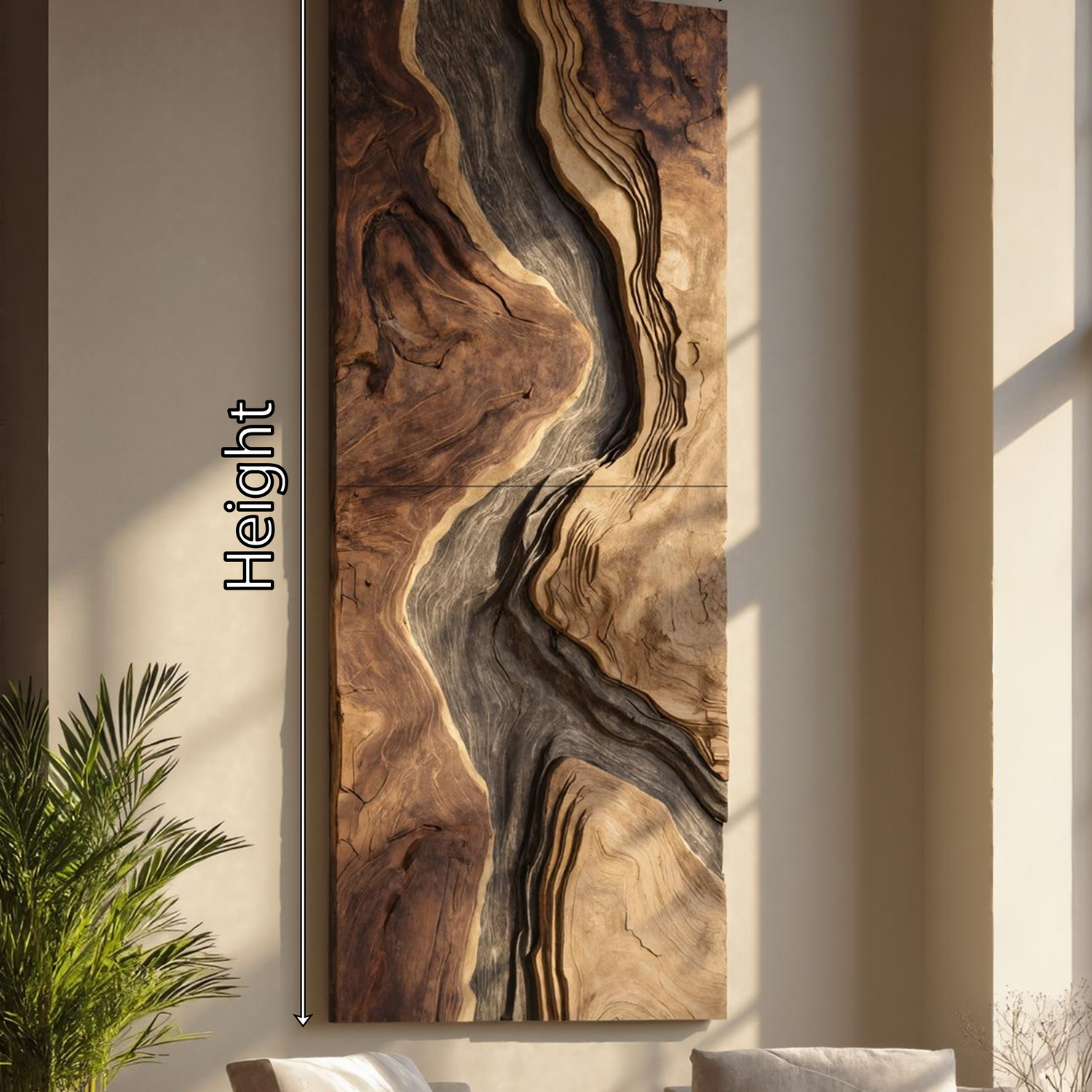 This wall-mounted sculpture blends fluid, organic contours with minimalist elegance. Hand-carved from solid hardwood, the rhythmic folds resemble ocean tides frozen in motion. The golden-toned wood grain is accentuated by deep charcoal edges, creating a striking interplay of warmth and contrast. Designed with a hidden mount, the piece floats seamlessly against your wall, enhancing its sculptural presence.