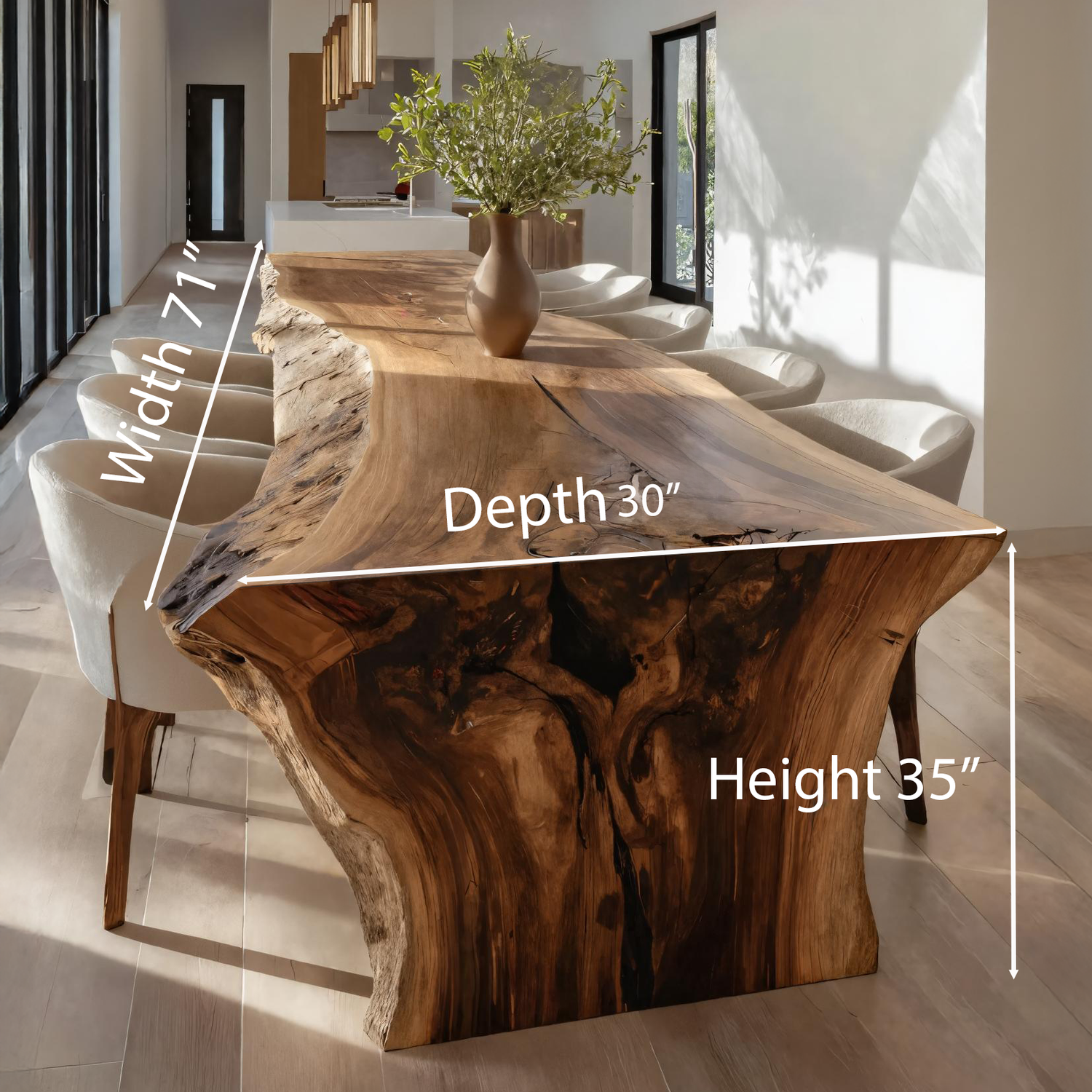 This dining table showcases a dramatic live edge top with flowing organic lines and a monolithic base, highlighting the unique contours of natural hardwood. The expansive surface is perfect for gatherings, while the raw edges create movement and character. Designed to stand as both a functional dining surface and an artistic centerpiece, it enhances any dining environment.
