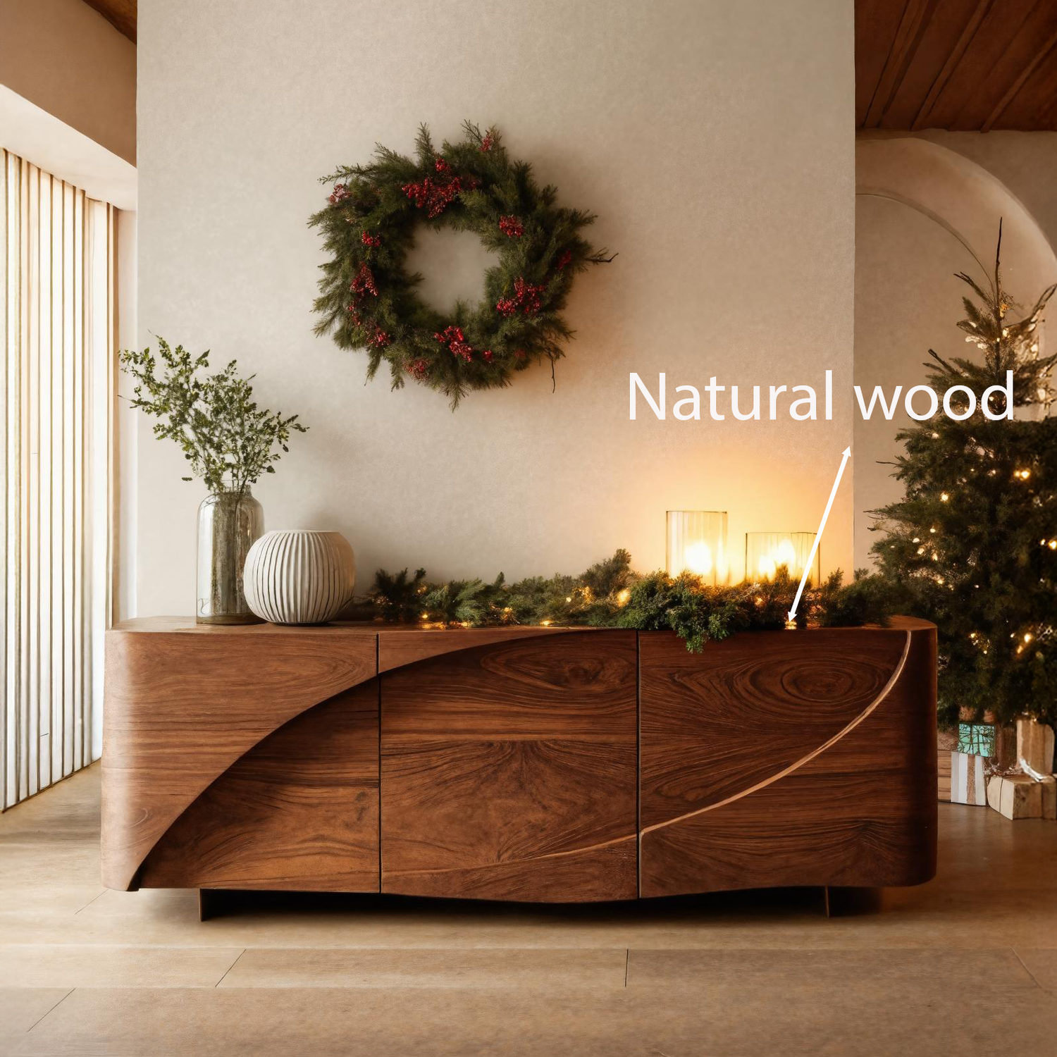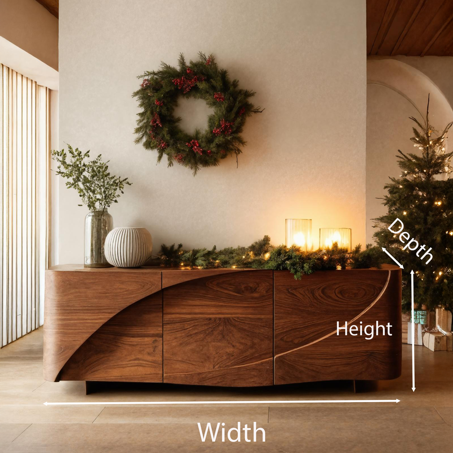 This handcrafted sideboard features a sleek, contemporary outline with smooth curves and flowing lines that highlight the natural beauty of solid wood. Spacious compartments provide versatile storage for dining essentials, décor, or everyday items, while its artistic design adds warmth and timeless character to any room.