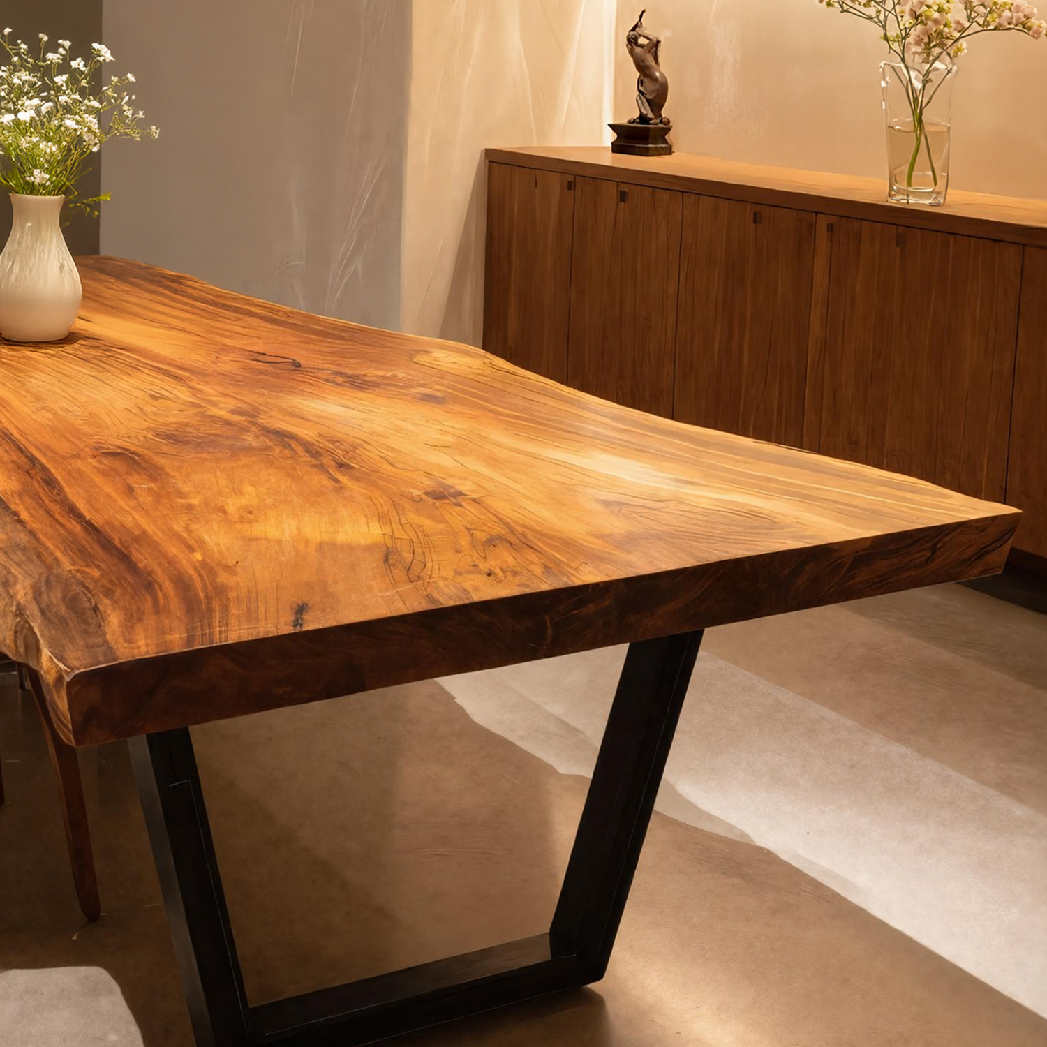 Crafted from kiln-dried hardwood, each tabletop showcases unique grain patterns, tonal variations, and natural markings. The table offers both durability and tactile warmth. Matching solid wood legs further reinforce structural integrity and visual harmony.