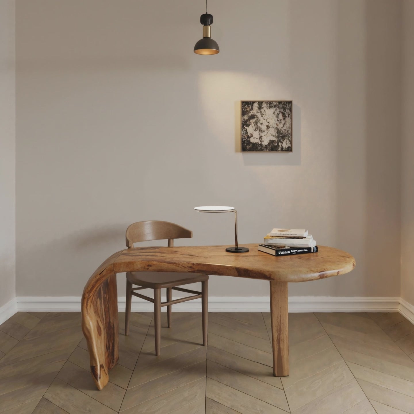 This freestanding desk showcases a continuous live-edge tabletop that gracefully flows into an organic curved support on one side, balanced by a solid cylindrical leg on the opposite end. The sweeping silhouette provides a generous work surface—ideal for laptops, sketches, and desktop essentials—while the open form maintains an airy, uncluttered feel. Expertly crafted joinery means it arrives ready to place with minimal assembly required.