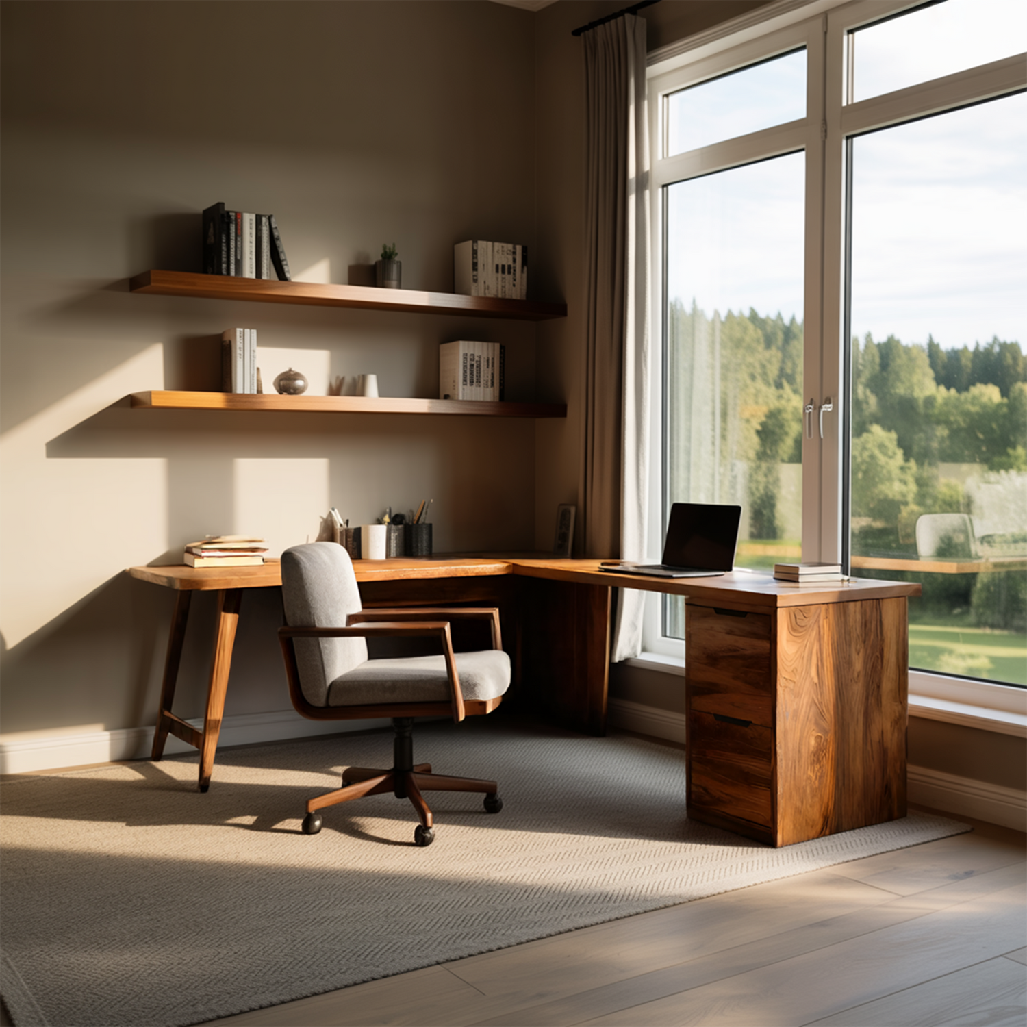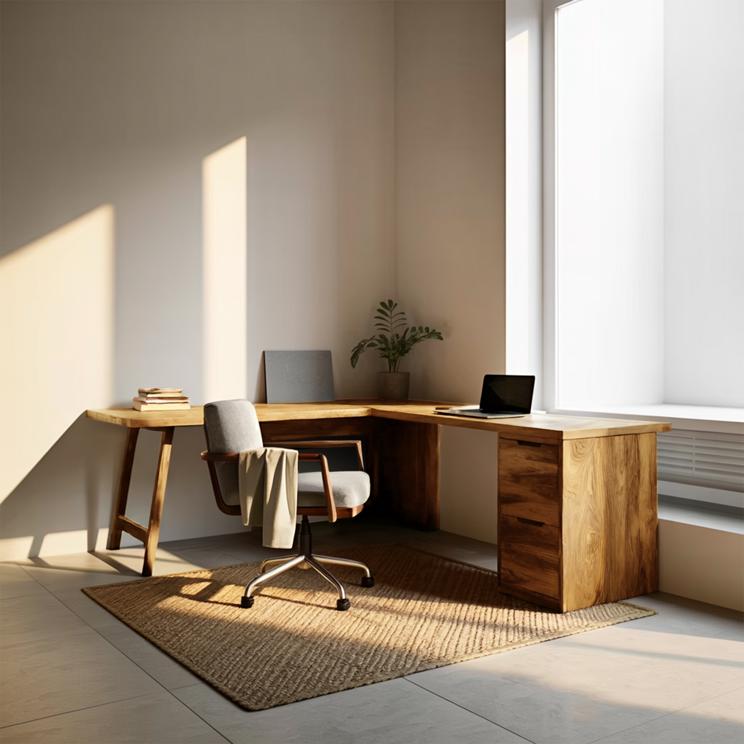This L-shaped desk features a generous work surface with a clean, balanced structure that fits naturally into home office corners. The integrated drawer unit offers practical storage for documents and essentials, keeping your workspace neat and organized. Subtle curves and warm wood tones give the desk a timeless, calming presence that complements a wide range of interior settings.