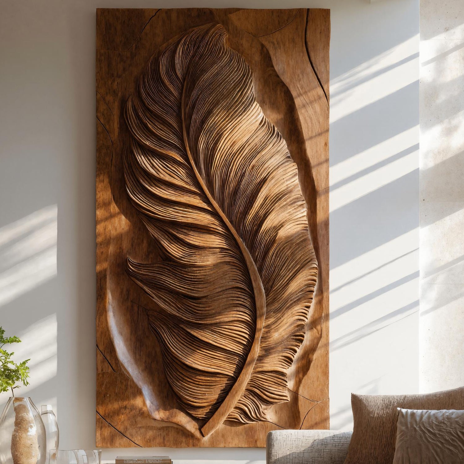 Refined and expressive, Luxury Organic Feather Wall Sculpture For Home brings a sculptural statement to sophisticated interior spaces. The tall vertical format and flowing feather silhouette create a sense of elegance and quiet movement, making the artwork a striking focal point for modern and luxury homes. Intricately carved lines follow the natural curve of the feather, forming layers of depth that interact beautifully with light and shadow. The organic texture and warm wood tones enhance the atmosphere of the room, adding visual richness while maintaining a calm, harmonious presence.