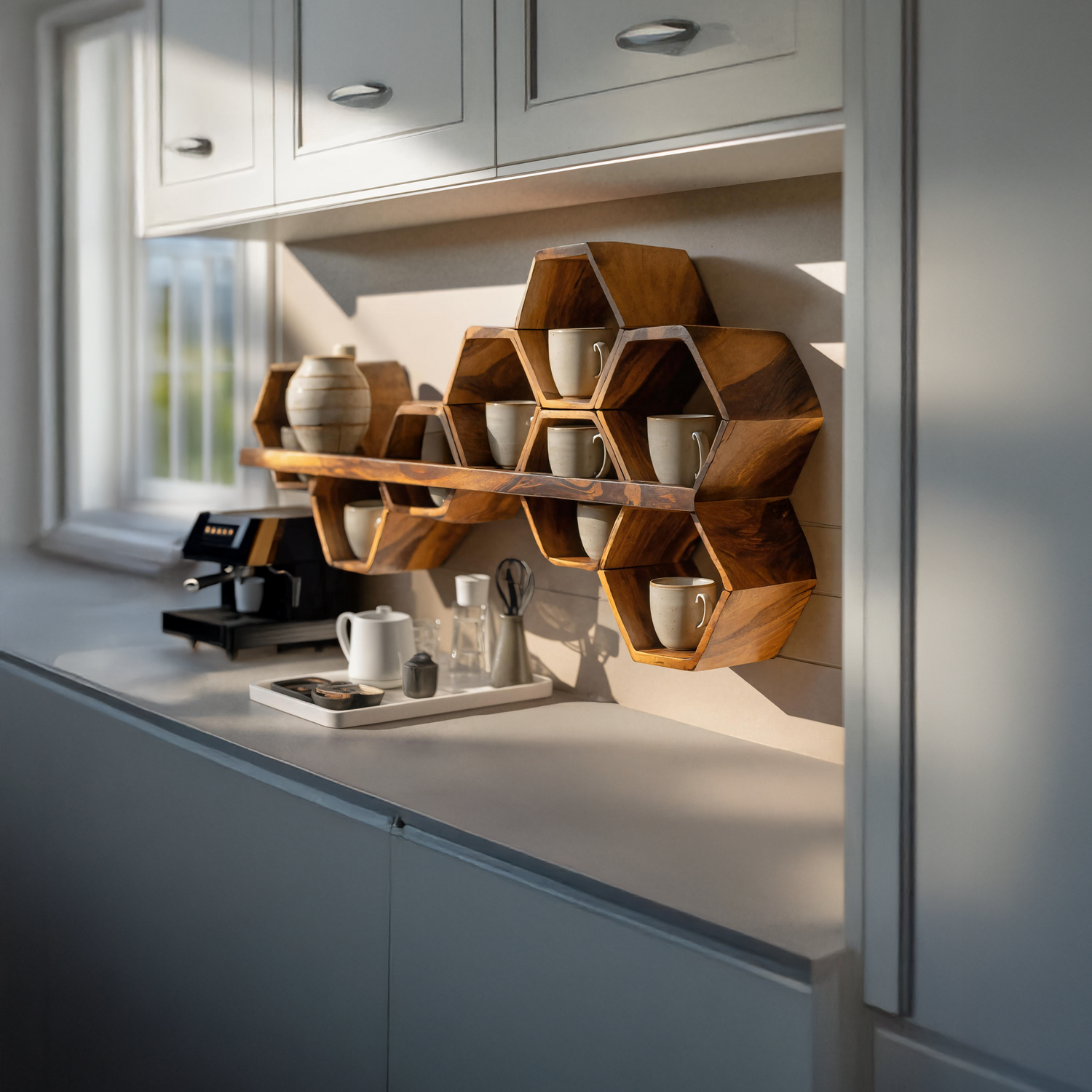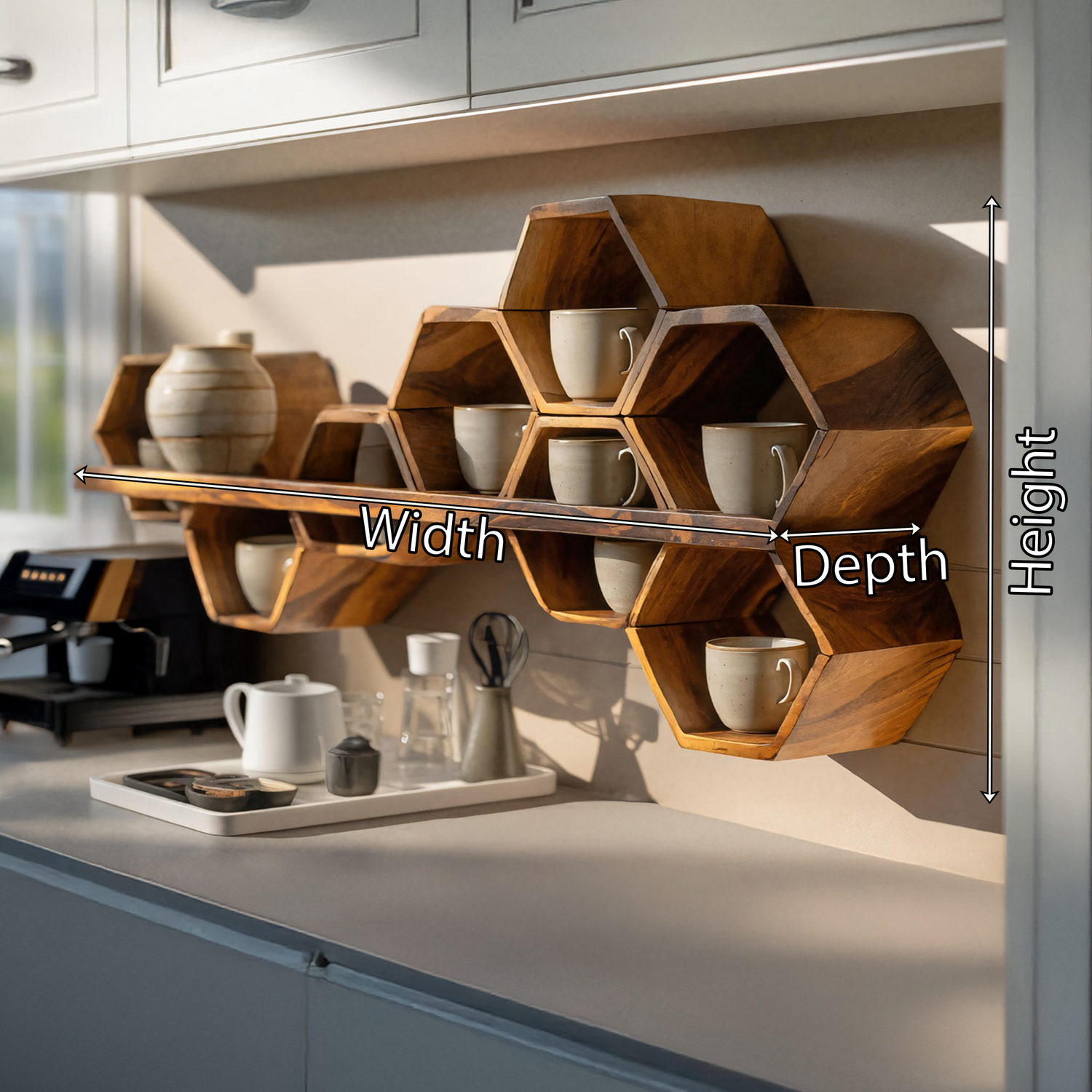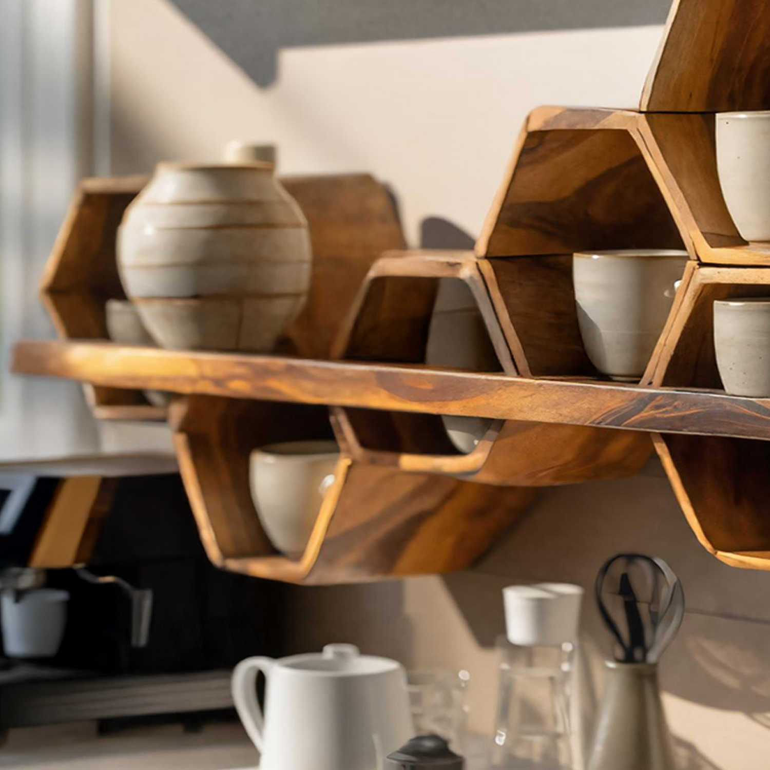 Introduce structured form and subtle warmth to your interior with the Mid Century Hexagonal Shelf For Furniture Display. Defined by its geometric silhouette and crafted from solid wood, this wall-mounted shelf blends mid-century character with everyday display functionality. Its balanced proportions create an elegant surface for showcasing décor pieces while keeping the space visually calm and well-organized.