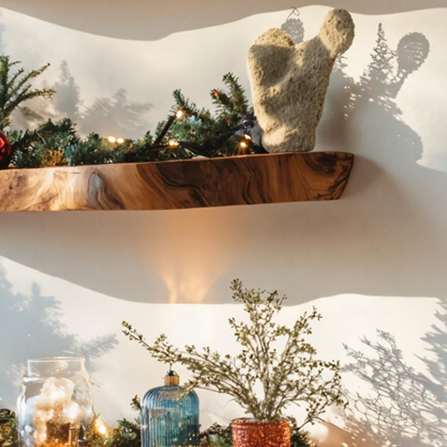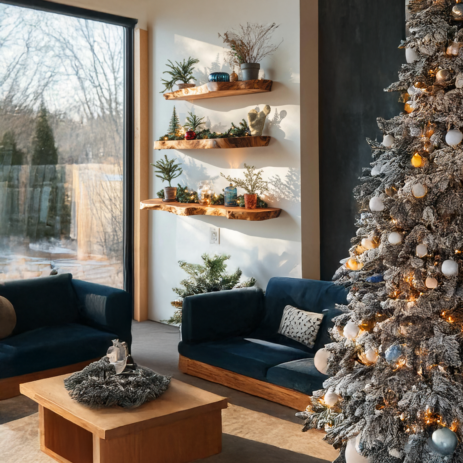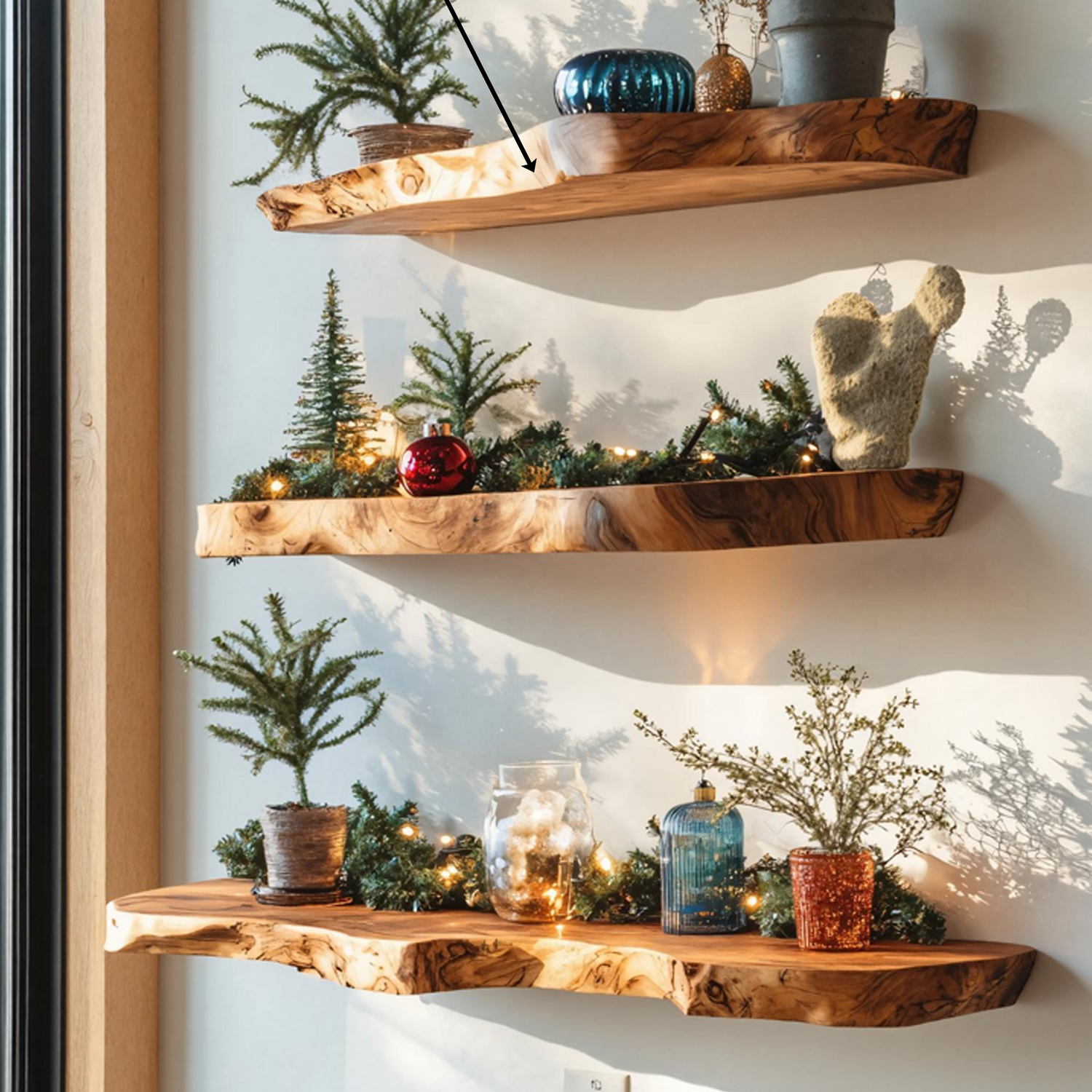 Add a touch of natural sophistication to your bedroom with the Mid Century Live Edge Floating Shelf For Xmas Bedroom Decoration. Crafted from solid wood with a distinctive live-edge design, this shelf blends mid-century elegance with festive charm. Perfect for displaying candles, garlands, or ornaments, it brings warmth and a cozy holiday feel to your Christmas décor.