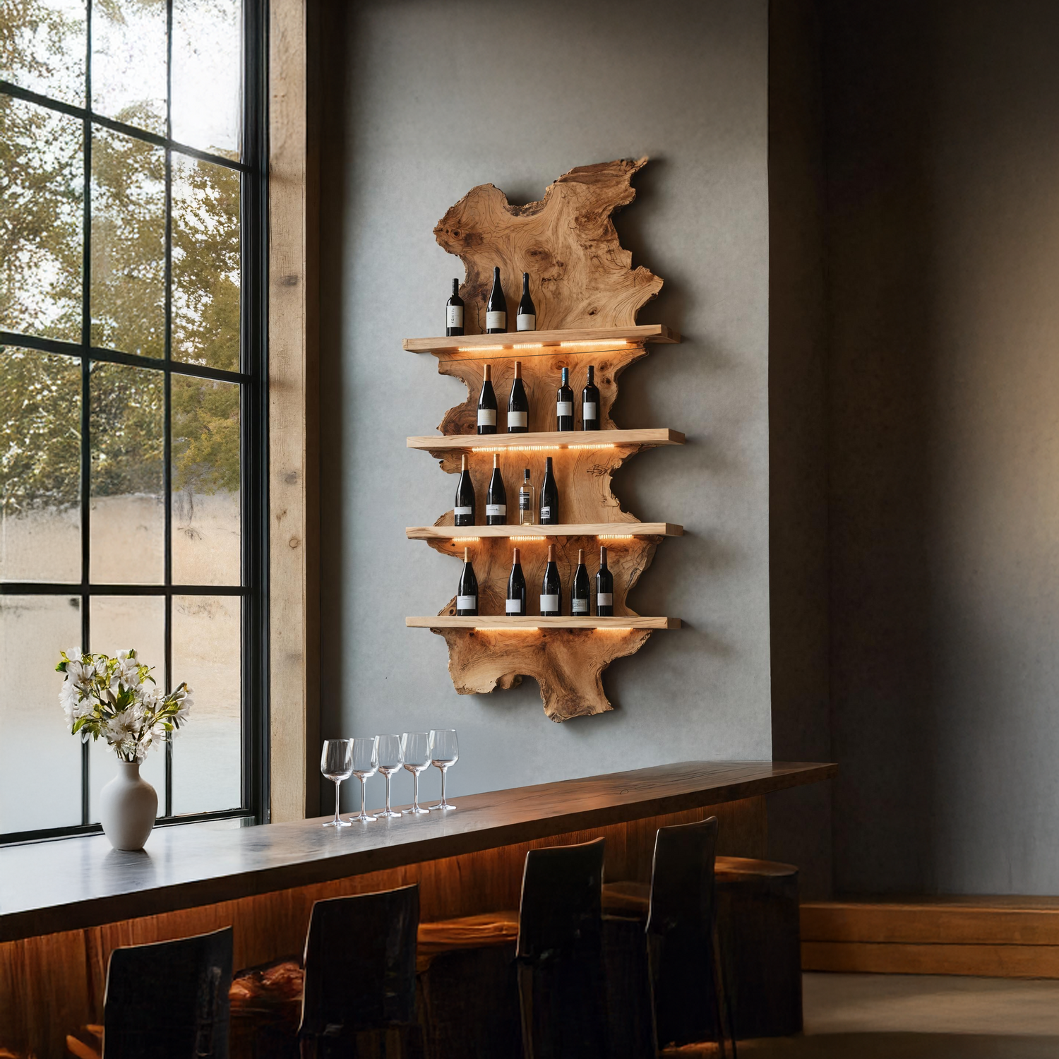 Bring natural artistry into your home with the Mid Century Live Edge Wine Holder For Bar Decor And Home Art. Designed with clean mid-century lines and a distinctive live edge profile, this piece blends organic character with a refined, structured look. Its warm tones and sculptural form create an elegant way to showcase your favorite bottles, making it a subtle highlight in a bar area, dining room, or curated display shelf. Combining usefulness with a touch of artistic style, it adds a calm, nature-inspired presence to your décor.