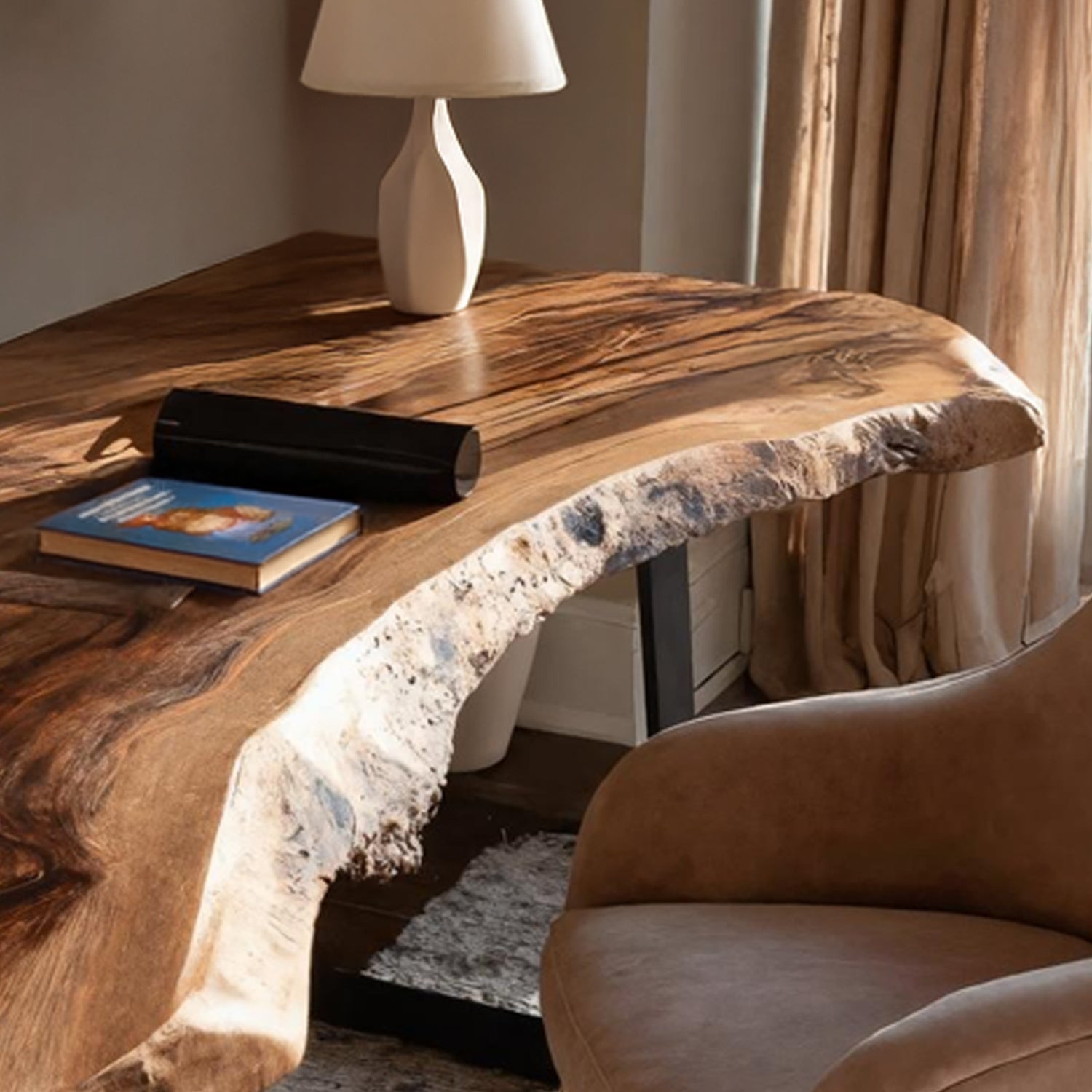 This desk is meticulously handcrafted from carefully selected solid monkey pod wood, showcasing flowing live edges, rich grain movement, and natural variations that make each piece one-of-a-kind. Designed with a timeless silhouette, it blends artisanal craftsmanship with enduring functionality, suitable for both contemporary and rustic-inspired spaces.