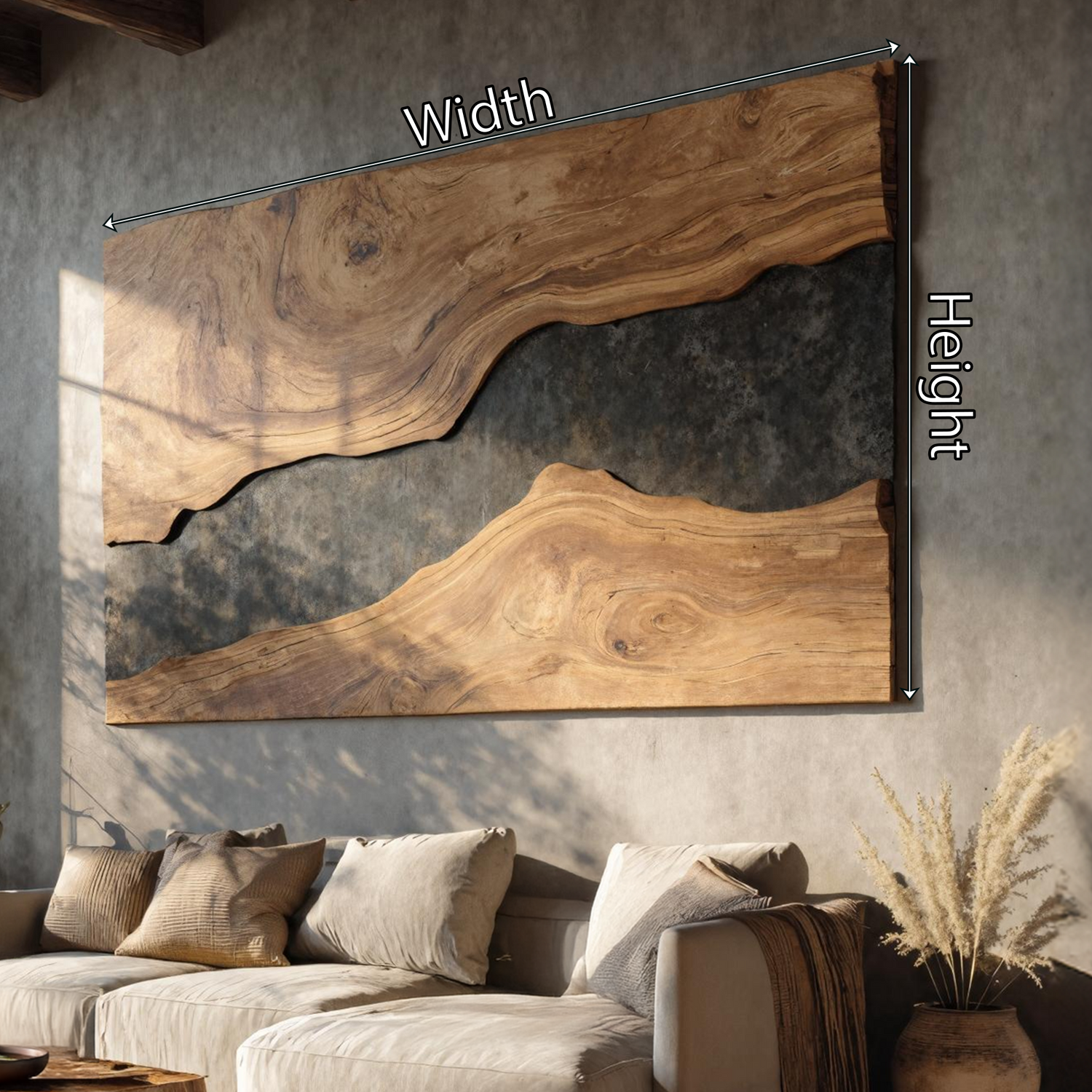 This wall-mounted sculpture blends fluid, organic contours with minimalist elegance. Hand-carved from solid hardwood, the rhythmic folds resemble ocean tides frozen in motion. The golden-toned wood grain is accentuated by deep charcoal edges, creating a striking interplay of warmth and contrast. Designed with a hidden mount, the piece floats seamlessly against your wall, enhancing its sculptural presence.