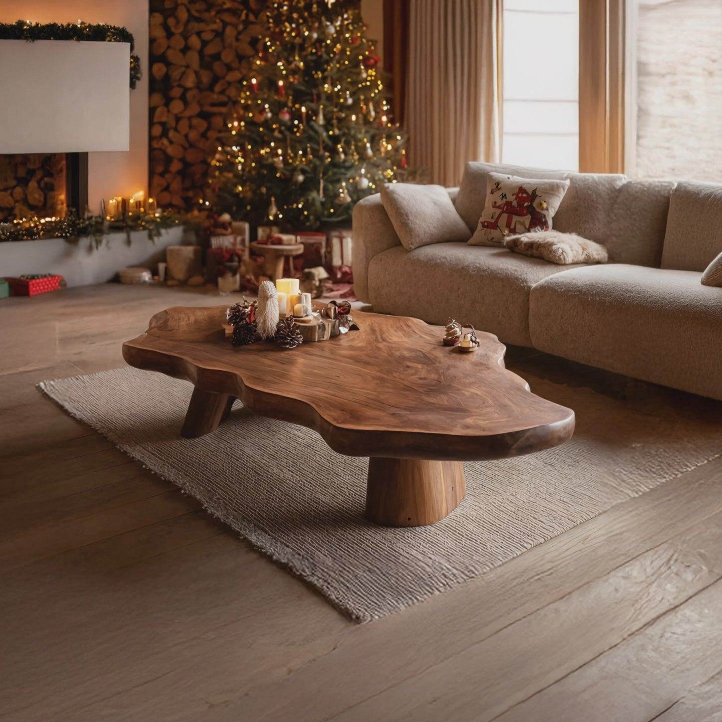Bring festive warmth and organic style to your space with the Mid Century Rustic Live Edge Coffee Table For Holiday Furniture. Handcrafted from solid wood, it features a natural live edge and rich grain patterns that capture the essence of mid-century charm and rustic character. Designed to blend functionality with timeless beauty, this coffee table serves as a cozy centerpiece for your living room — perfect for showcasing holiday décor, candles, or everyday accents.