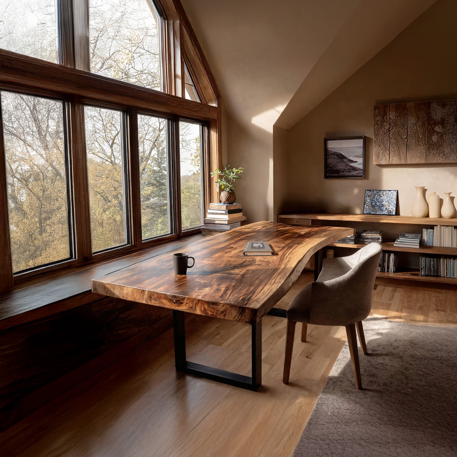 Bring character and warmth into your workspace with this Mid Century Rustic Wooden Live Edge Desk For Home Office, thoughtfully crafted to highlight the expressive grain and organic form of natural wood. The flowing live edge and rustic texture create a grounded, inviting atmosphere, while the mid-century silhouette adds a touch of timeless sophistication. Ideal for working, reading, or creative projects, this desk serves as both a functional workstation and a decorative focal point that elevates any home office.