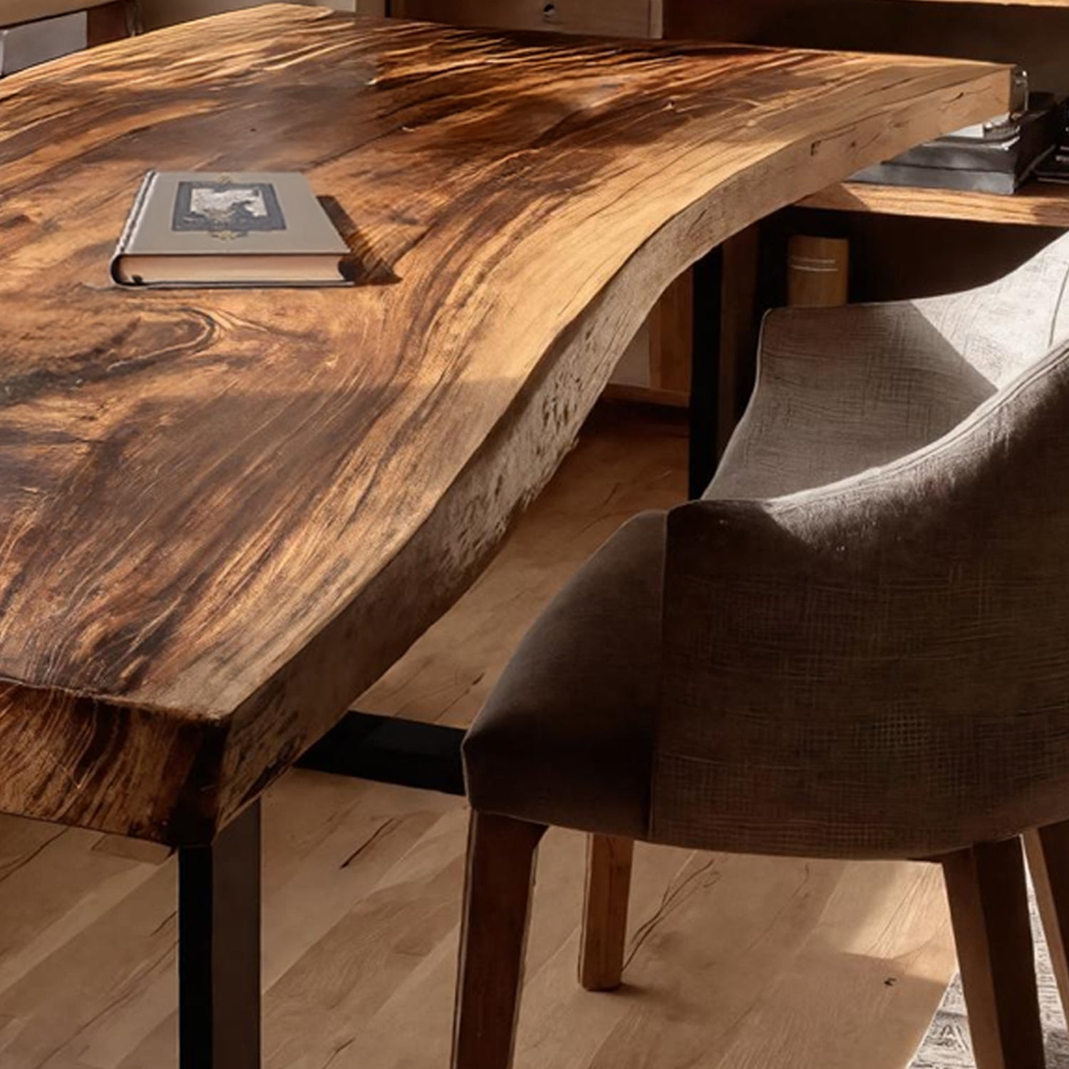 This desk is meticulously handcrafted from carefully selected solid monkey pod wood, showcasing flowing live edges, rich grain movement, and natural variations that make each piece one-of-a-kind. Designed with a timeless silhouette, it blends artisanal craftsmanship with enduring functionality, suitable for both contemporary and rustic-inspired spaces.
