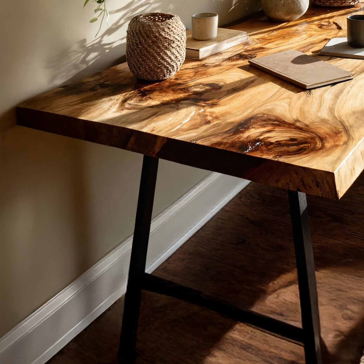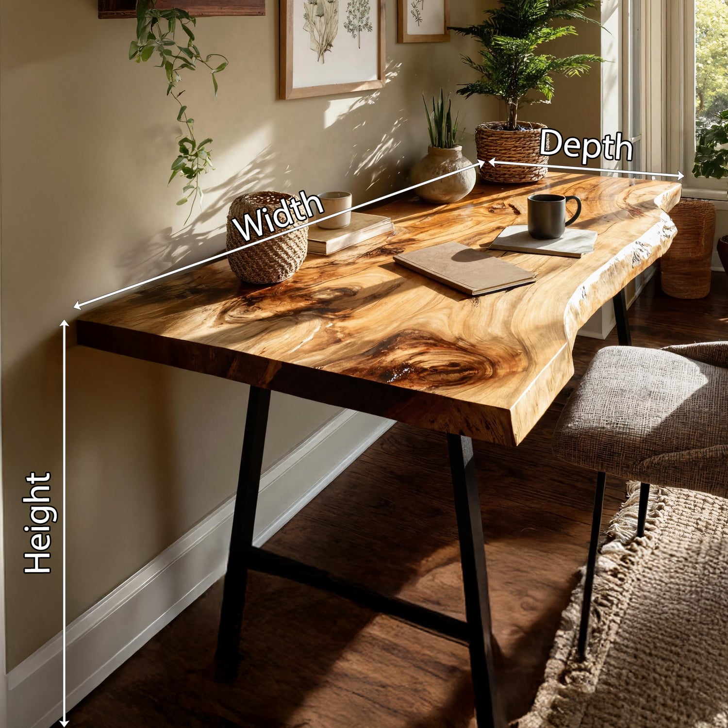This desk is meticulously handcrafted from carefully selected solid monkey pod wood, showcasing flowing live edges, rich grain movement, and natural variations that make each piece one-of-a-kind. Designed with a timeless silhouette, it blends artisanal craftsmanship with enduring functionality, suitable for both contemporary and rustic-inspired spaces.